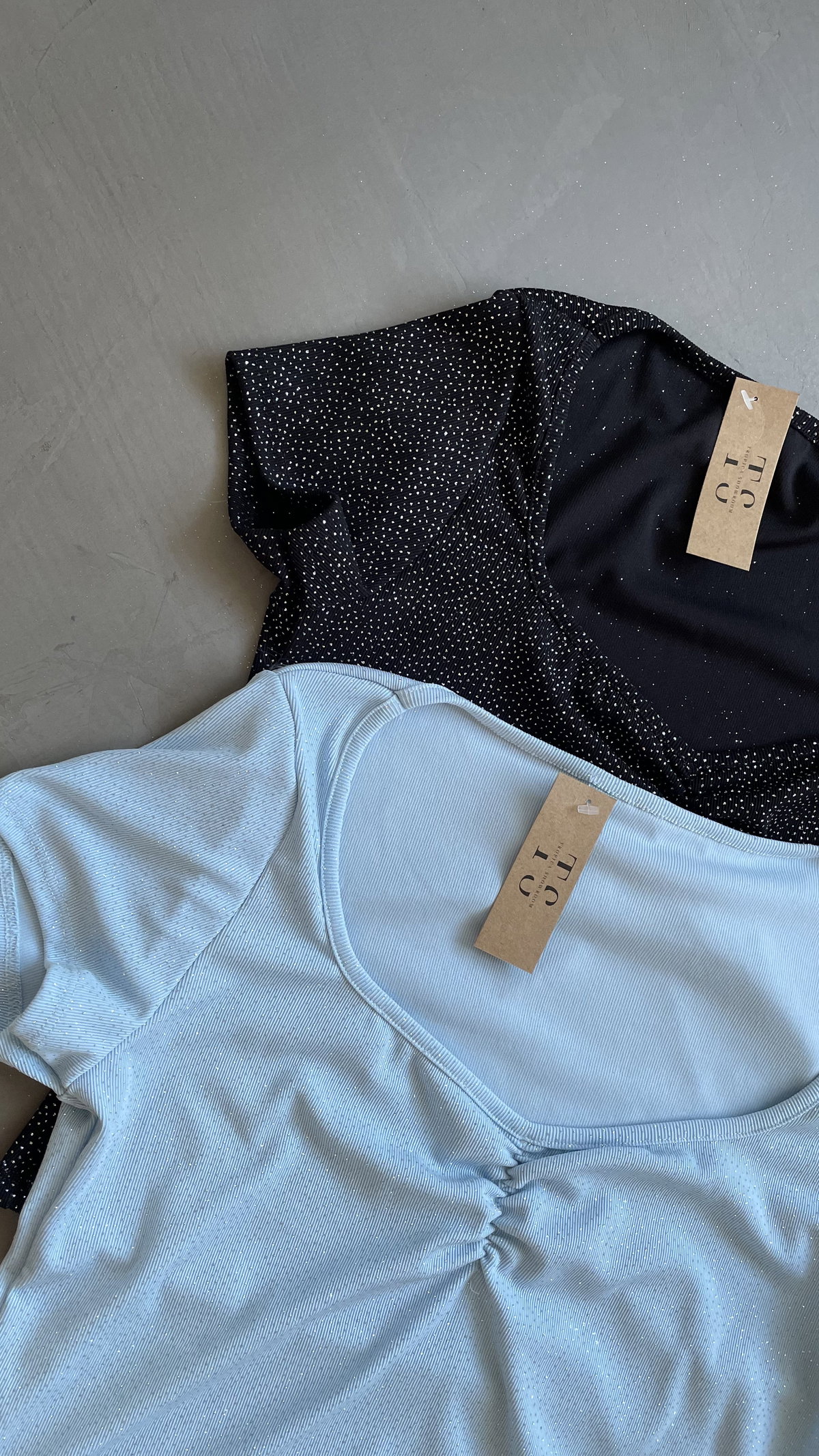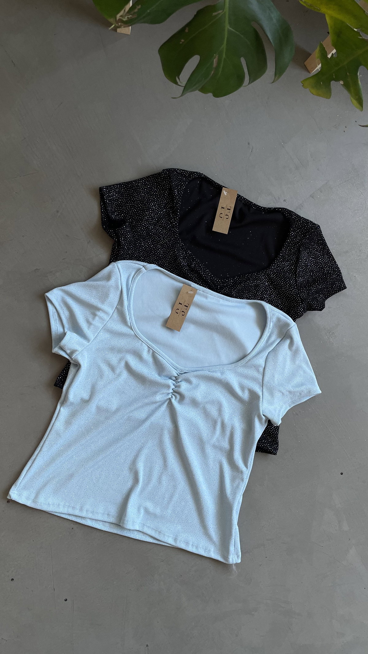 remera de morley manga corta. largo arriba de la cadera, son elastizadas. con brillos.