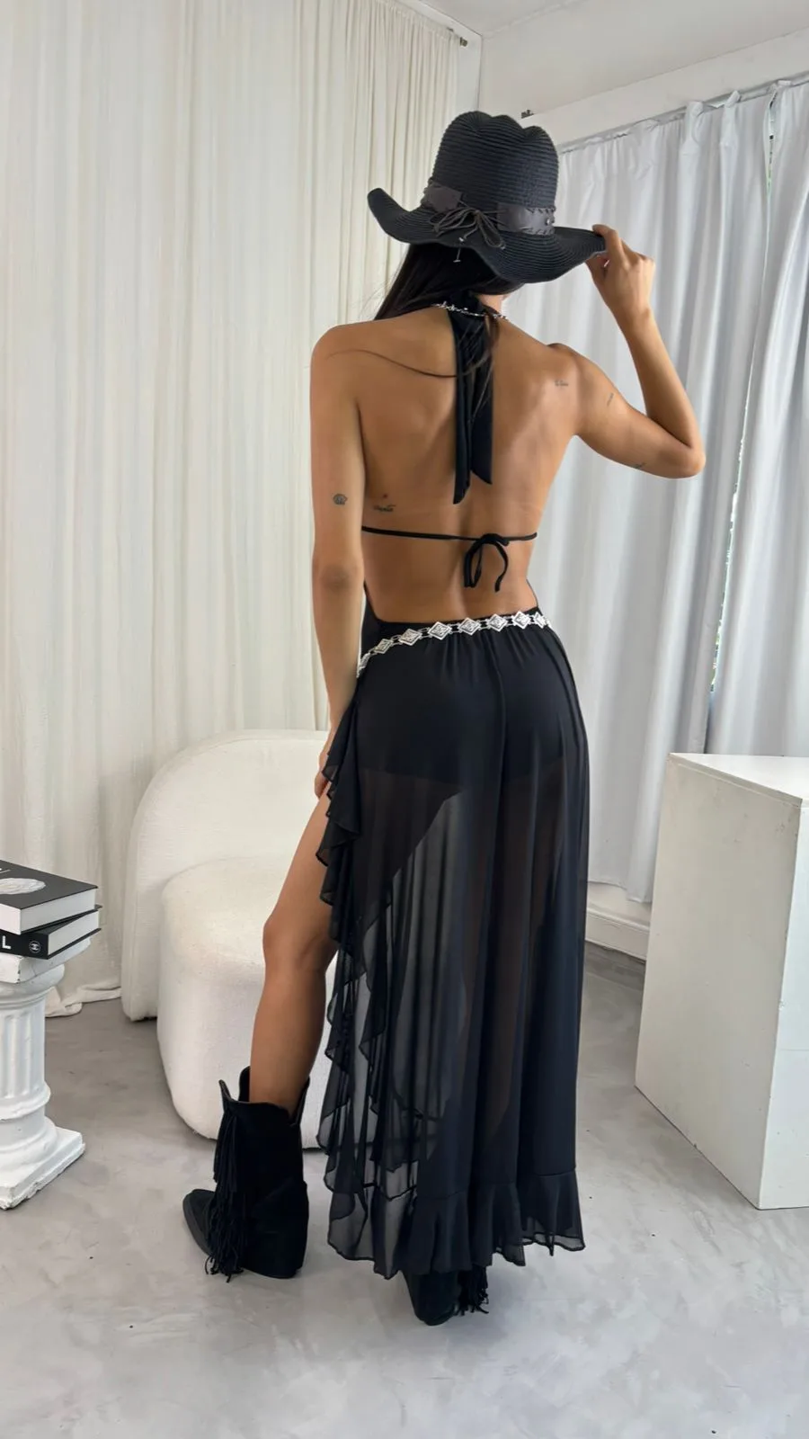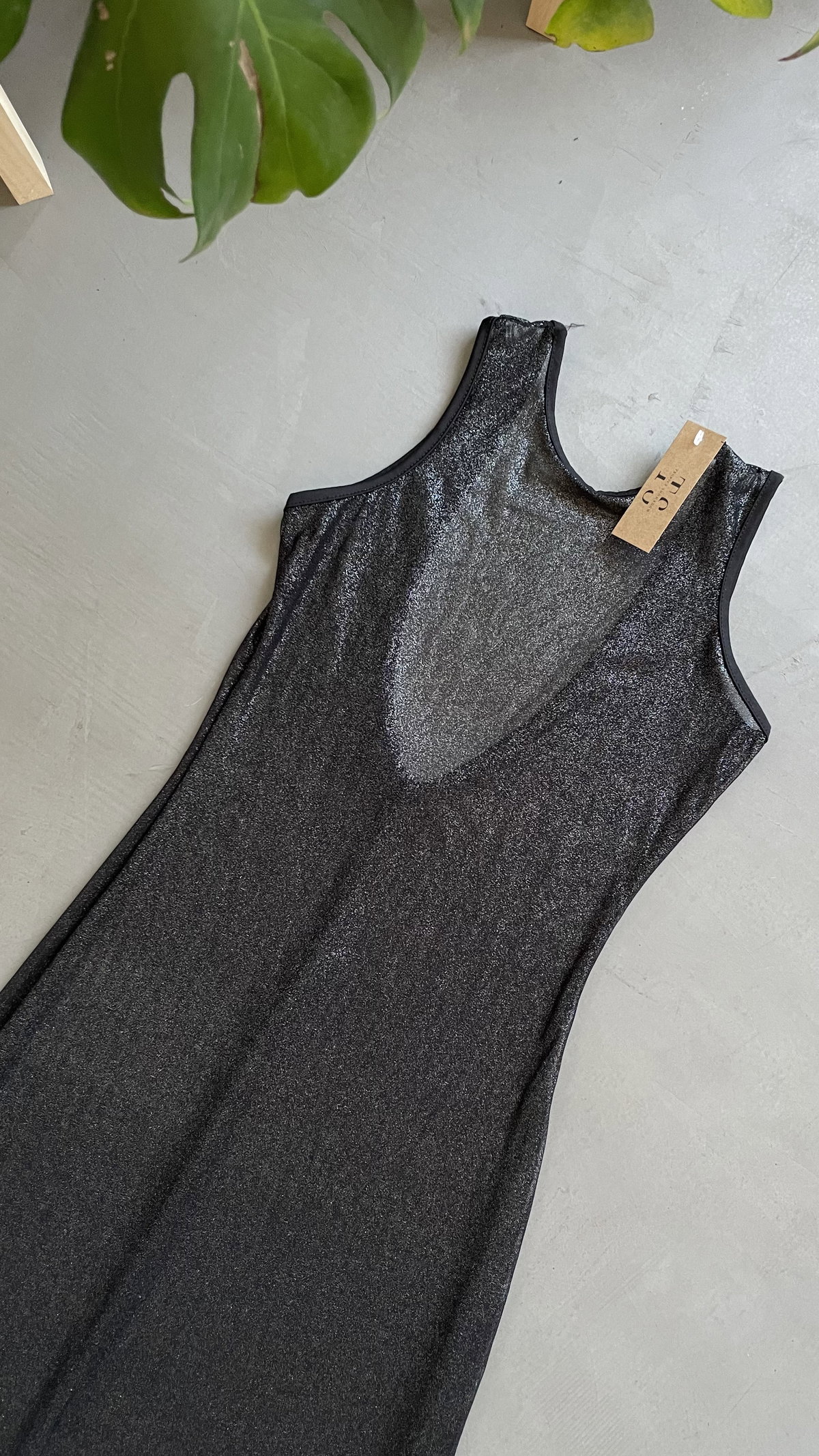 vestido largo de microtul brilloso, con espalda baja y tajo. es talle unico va para un