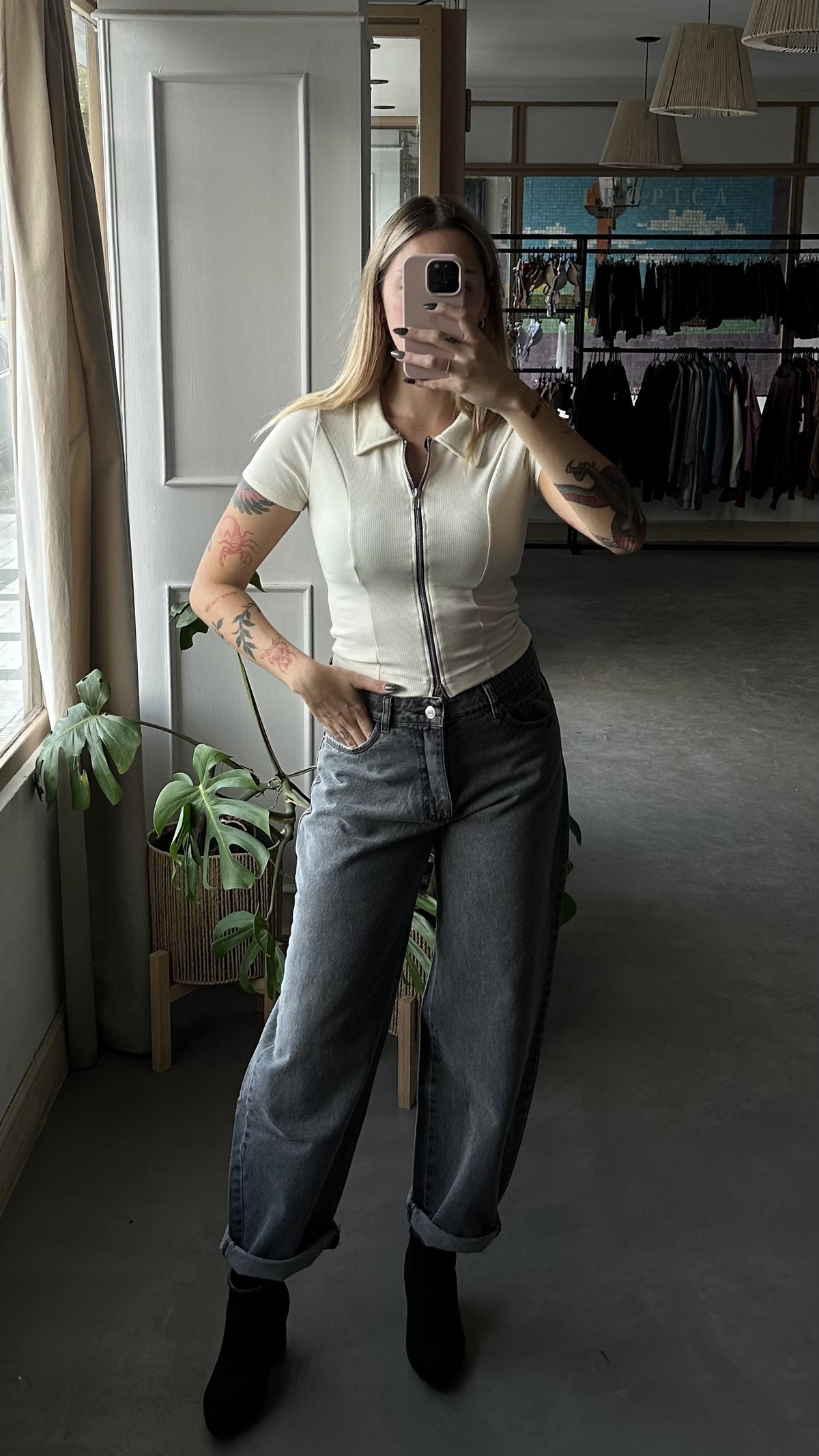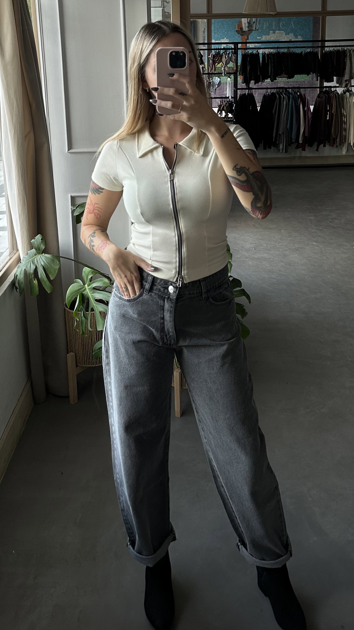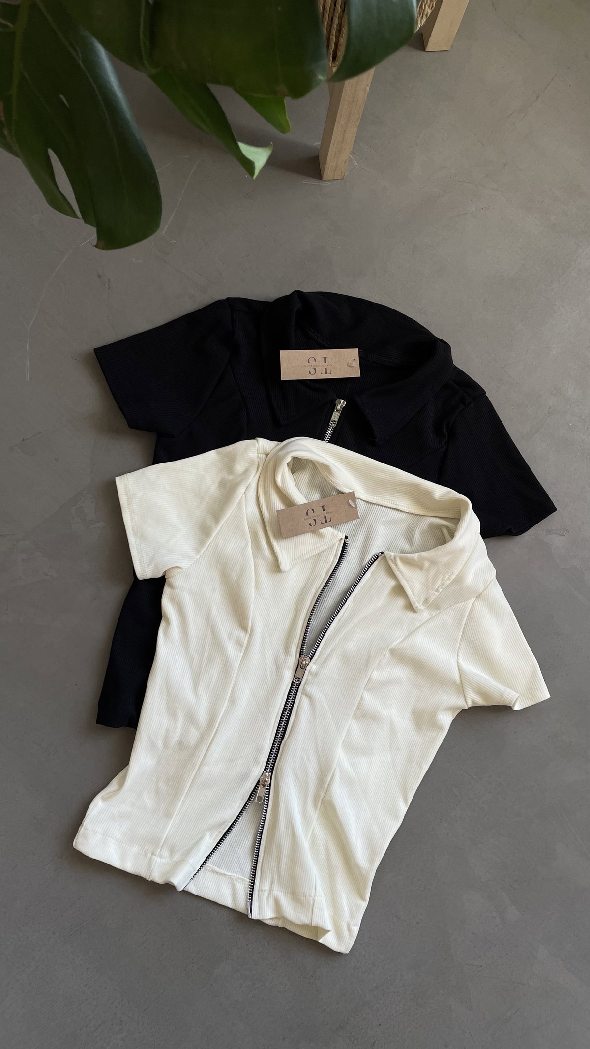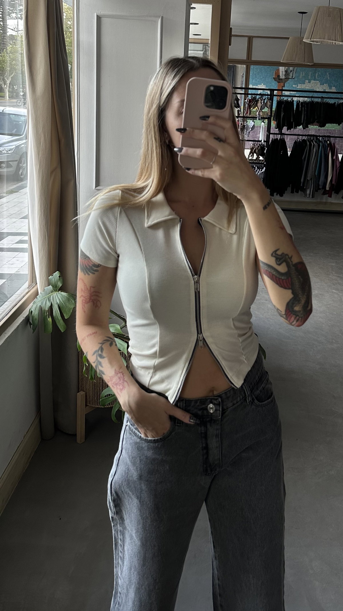Remera crop de morley con cierre doble, elastizada.