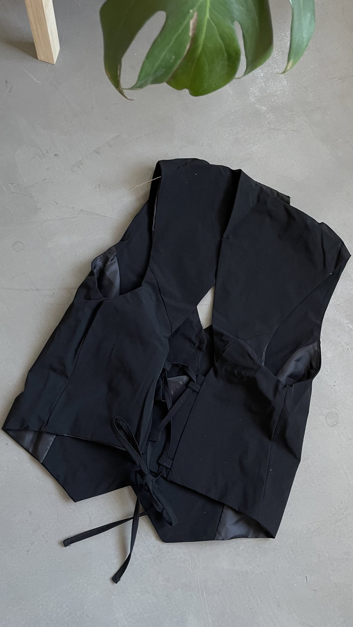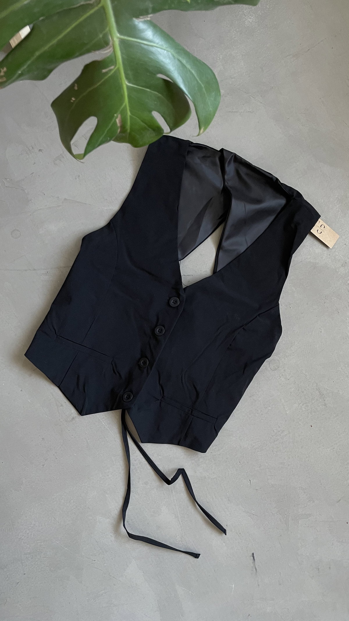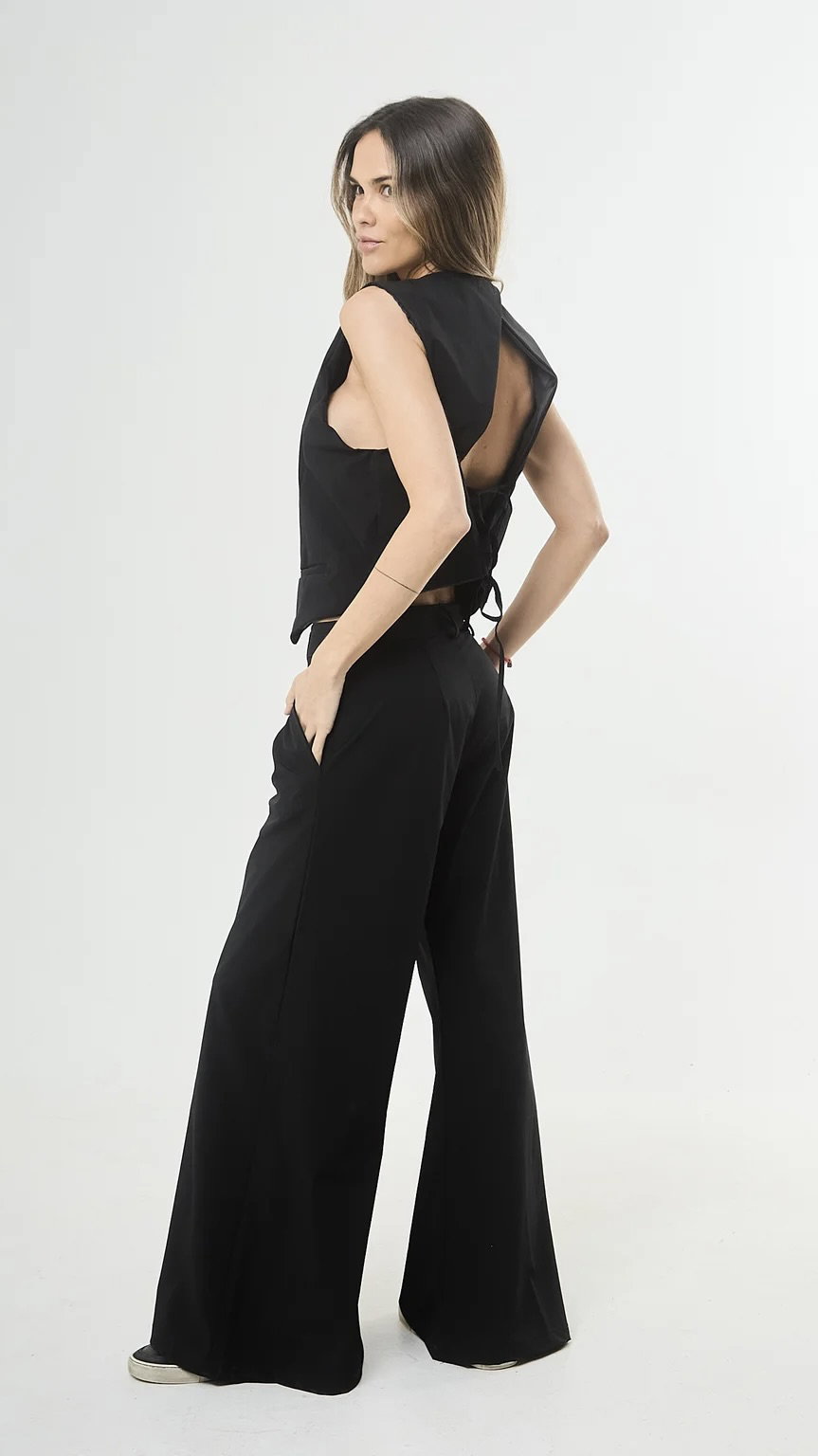 Chaleco de twill sastrero, con botones, espalda descubierta para atar. es forrado, corto a la cintura aprox