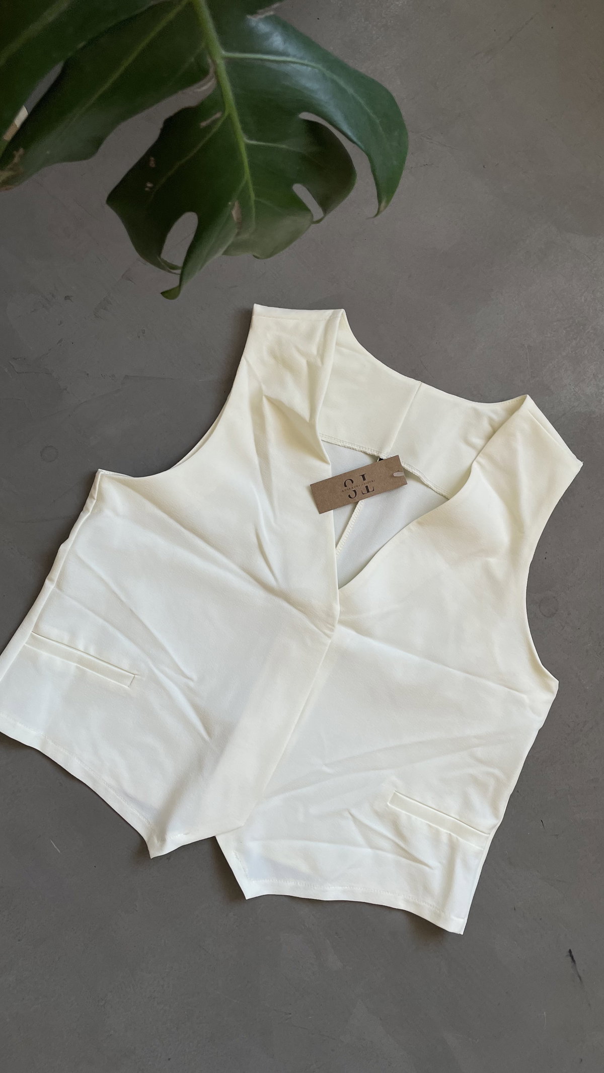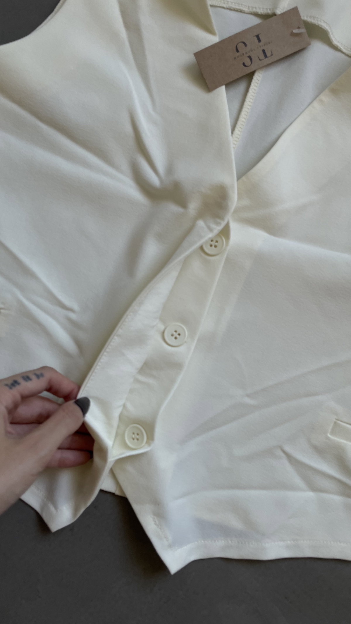 Chaleco de rayon twill, con botones escondidos. es rígido y liviano, corto arriba de la cadera aprox