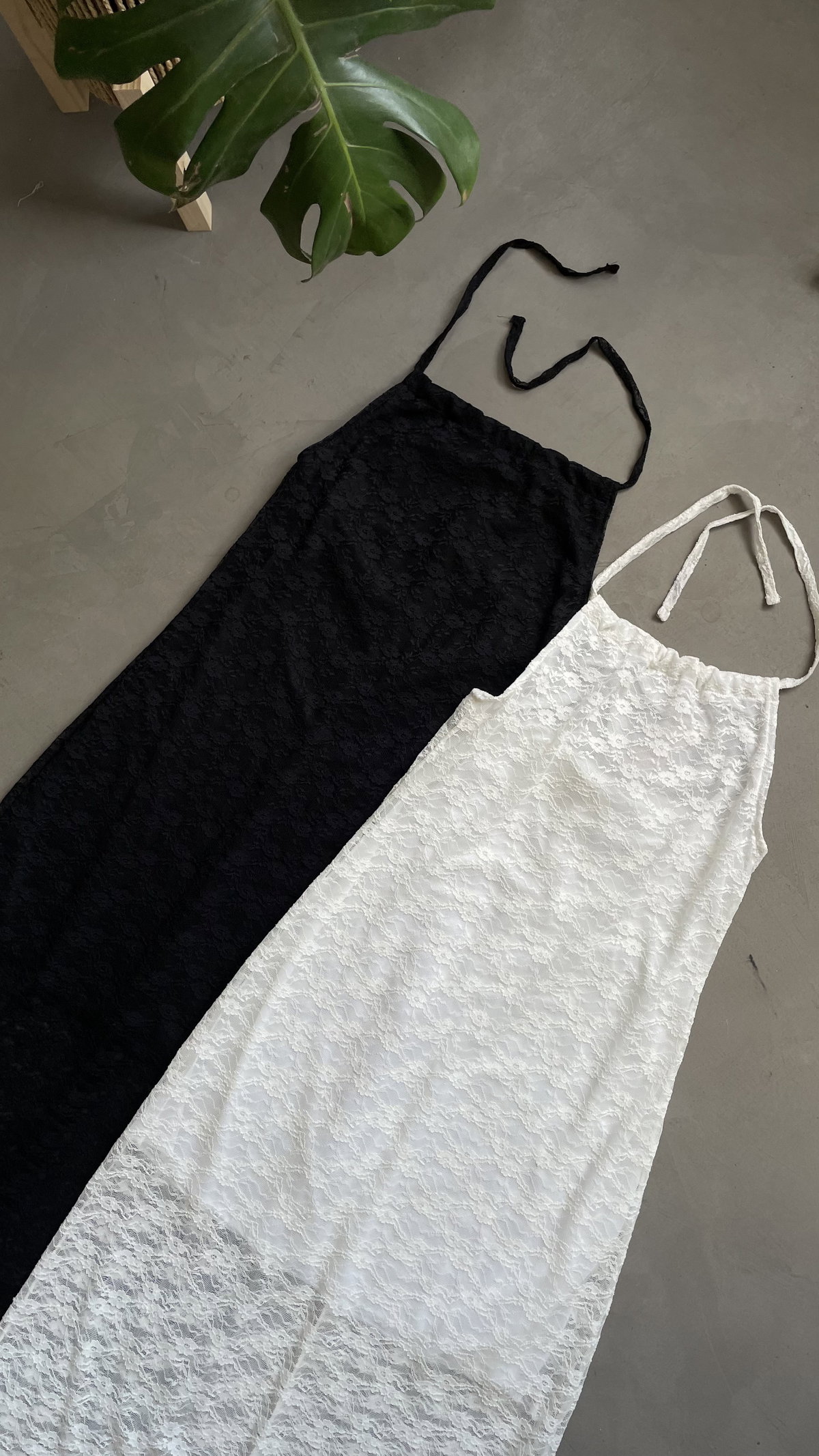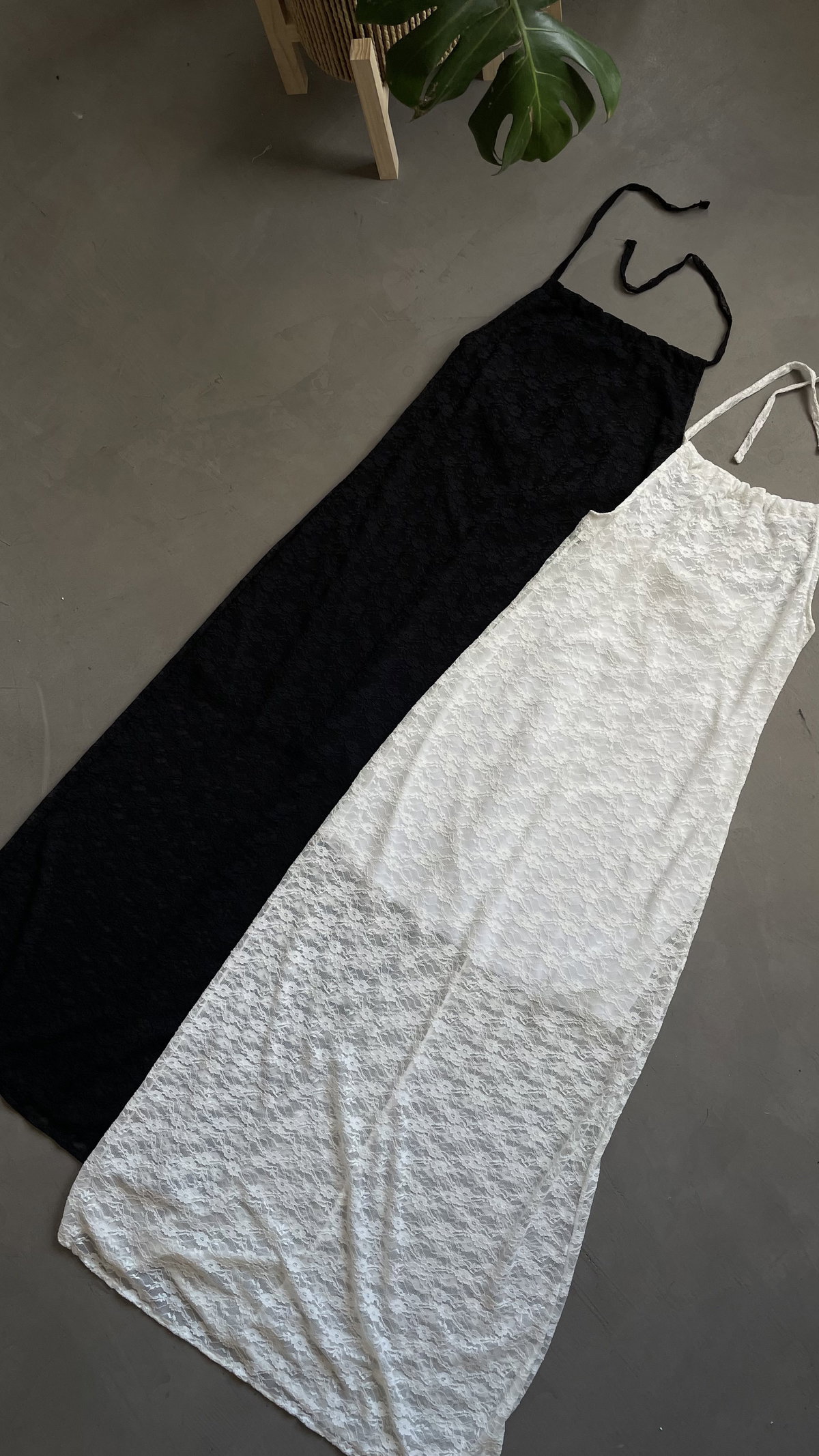 vestido largo de encaje con forro corto. espalda descubierta. talle unico, aproximadamente S.