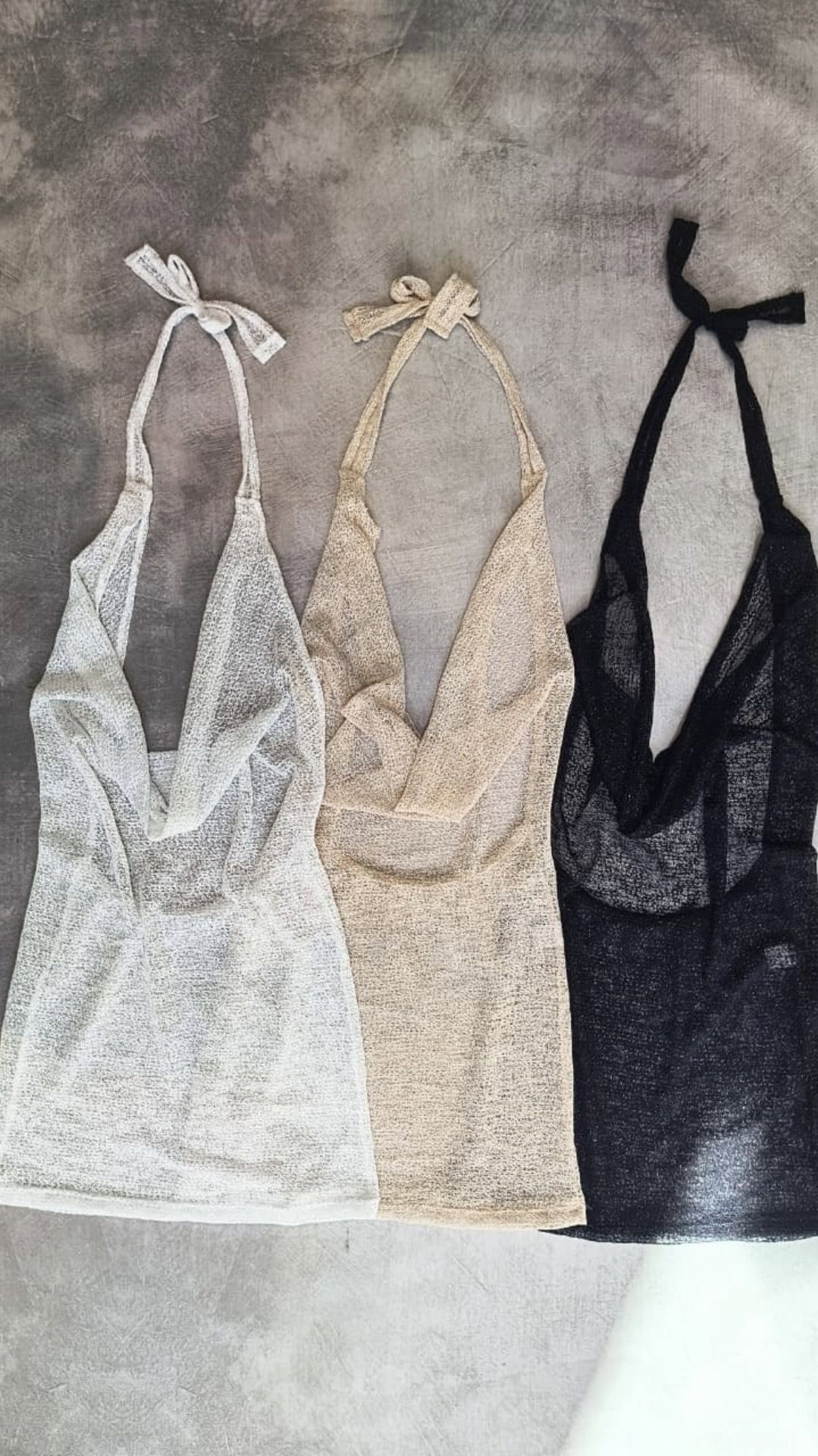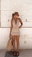 vestido corto de encaje con lurex. espalda descubierta se ata en el cuello. talle unico, aproximadamente S/M