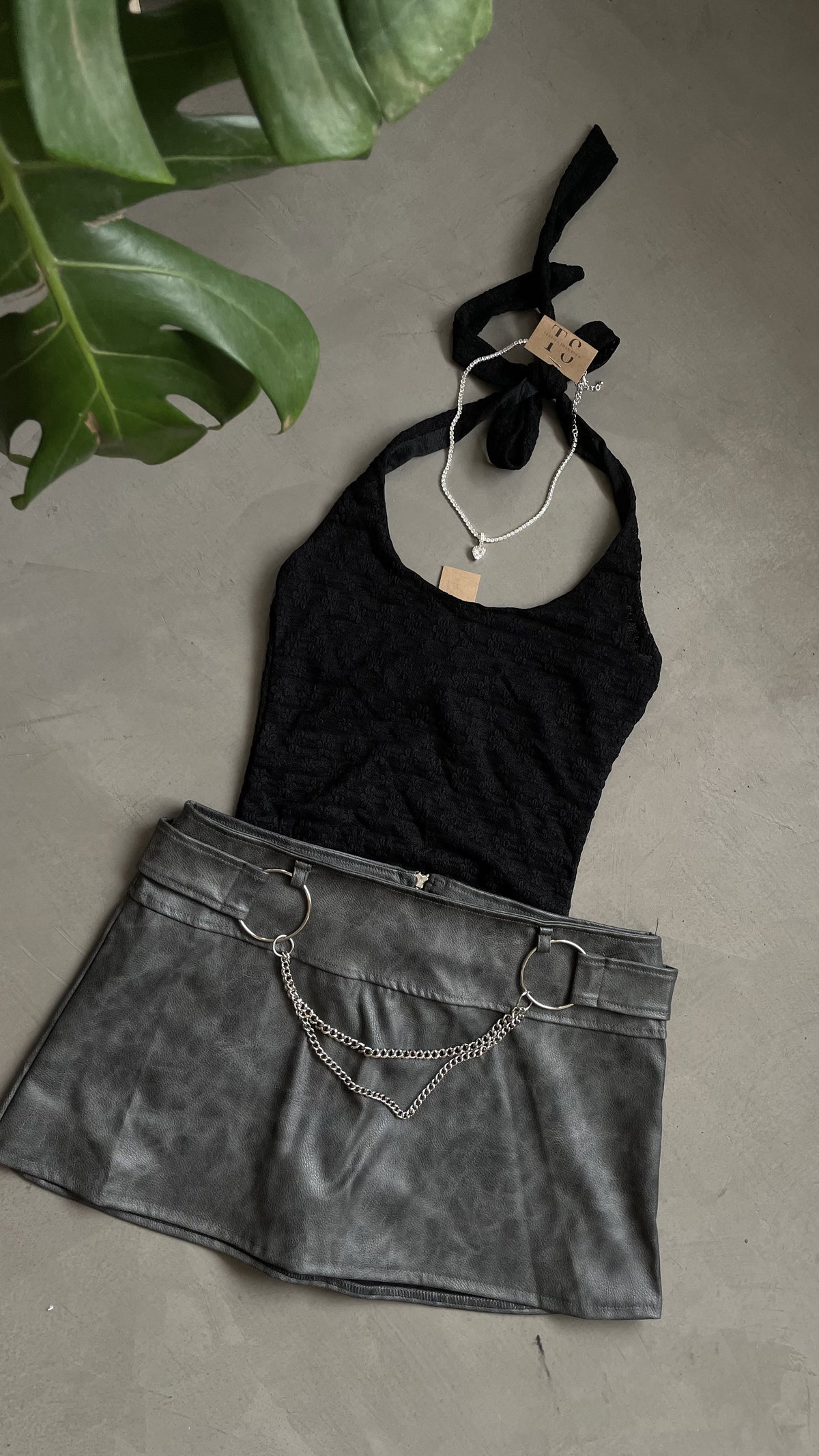 mini de cuerina vintage, con argollas y cadenas. tiene cierre trasero, es tiro medio.