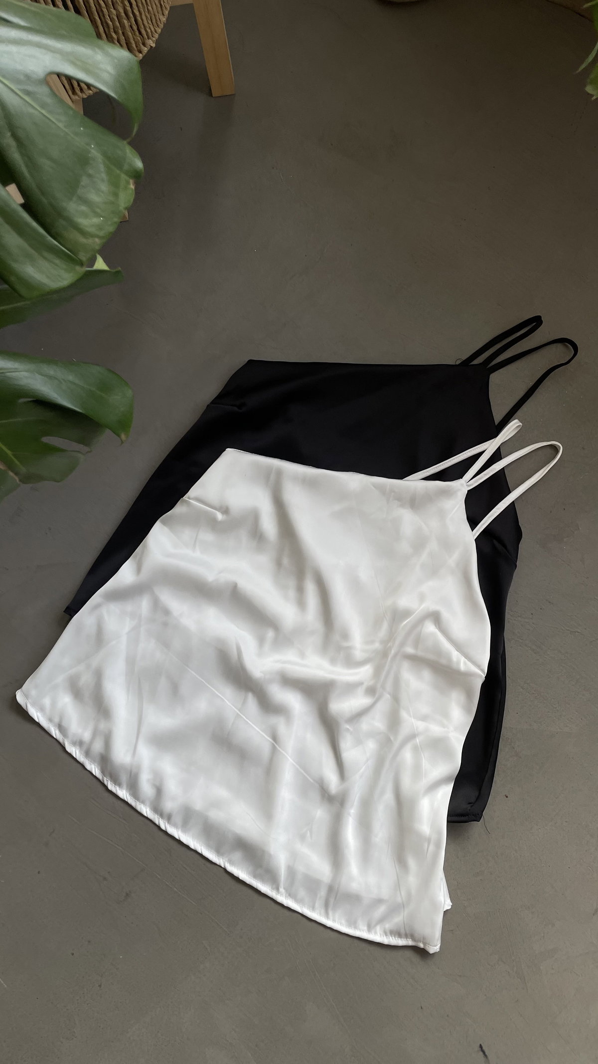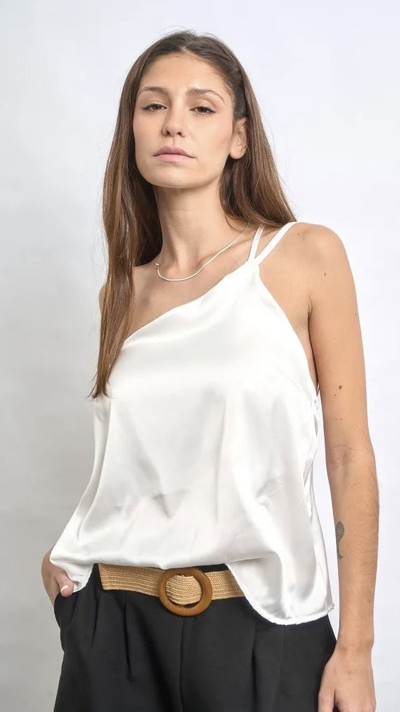 musculosa de satén a un hombro, liviana. no cede. larga arriba de la cadera