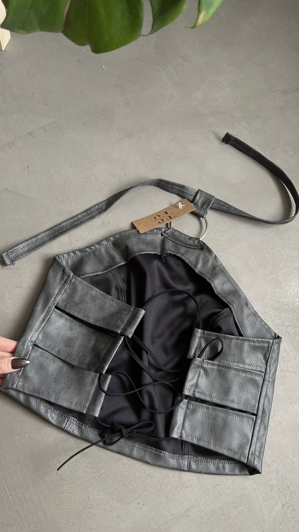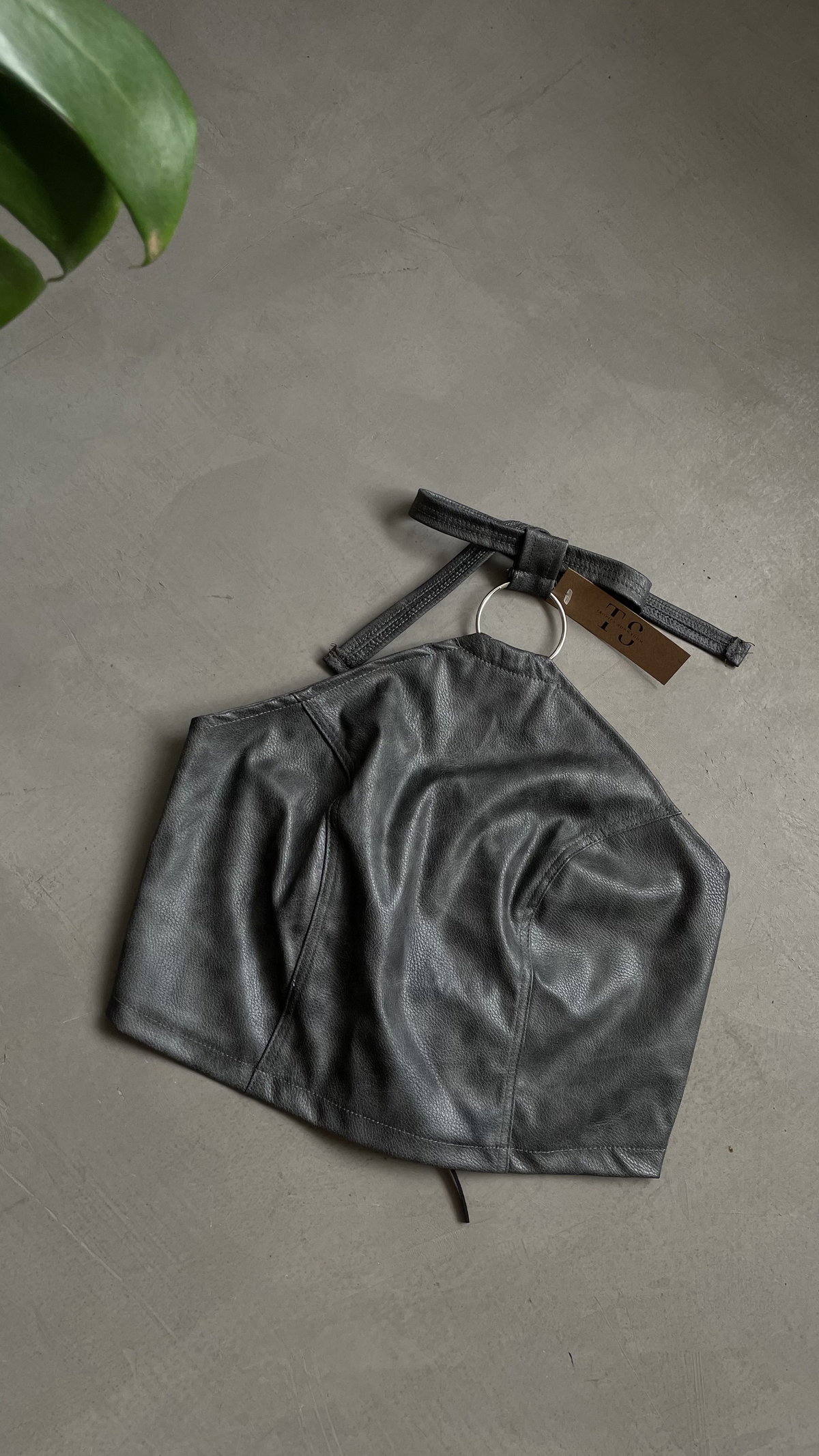 top de cuerina vintage, con tiras en la espalda para ajustar. detalle de argolla en el frente. elastizado