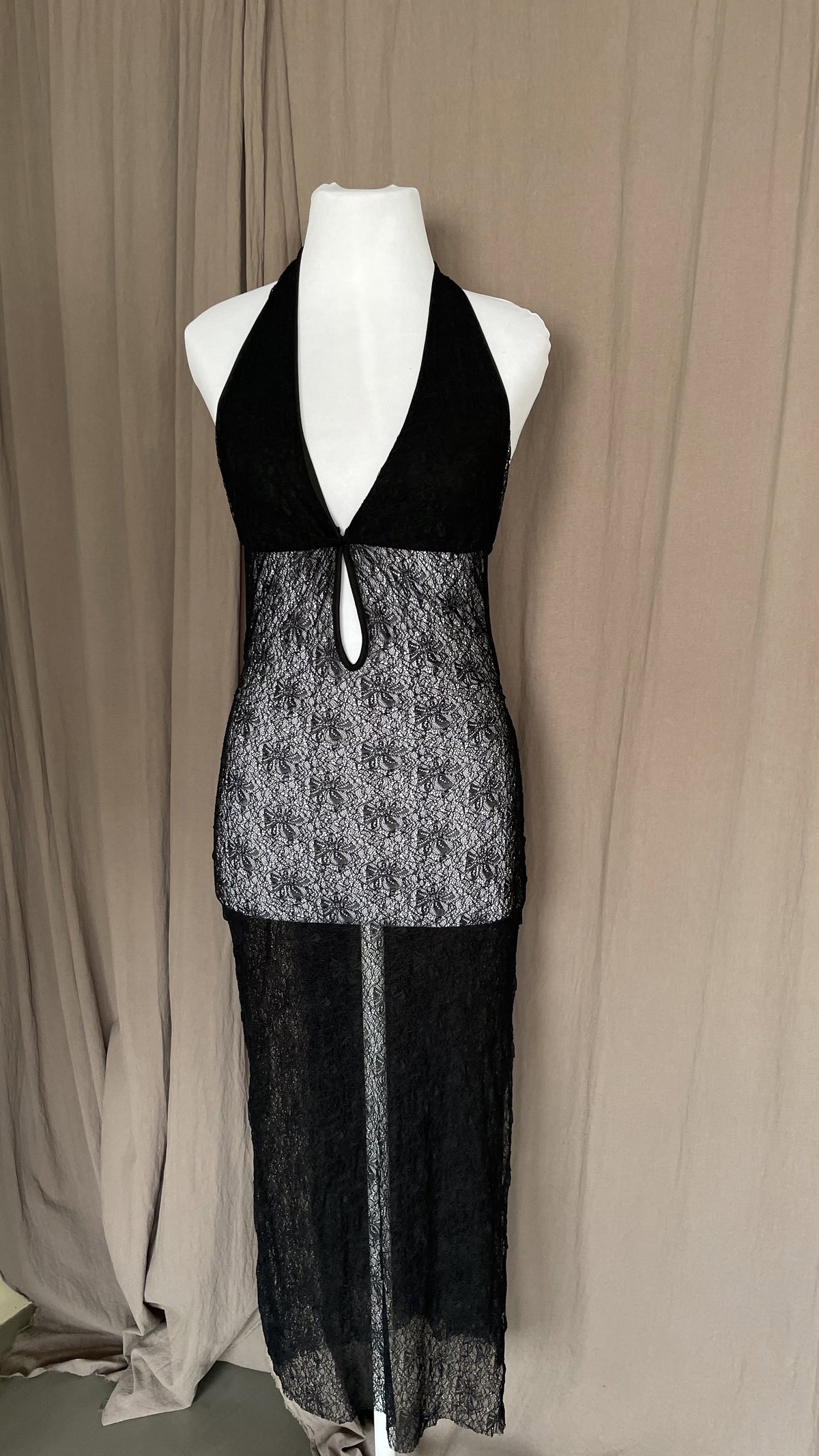 vestido largo de encaje, traslucido. tiene un tajo y forro en el busto, espalda descubierta. talle unico elastizado, va para S/M aprox.