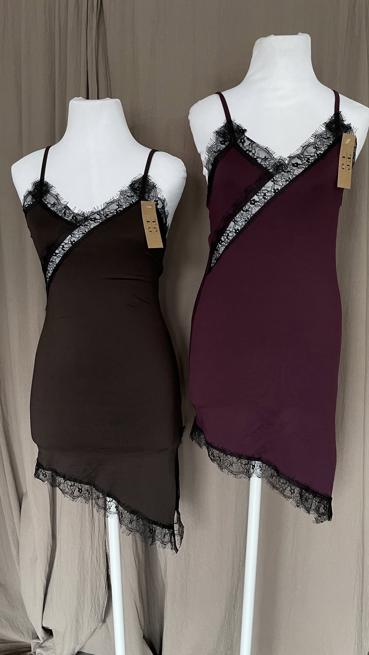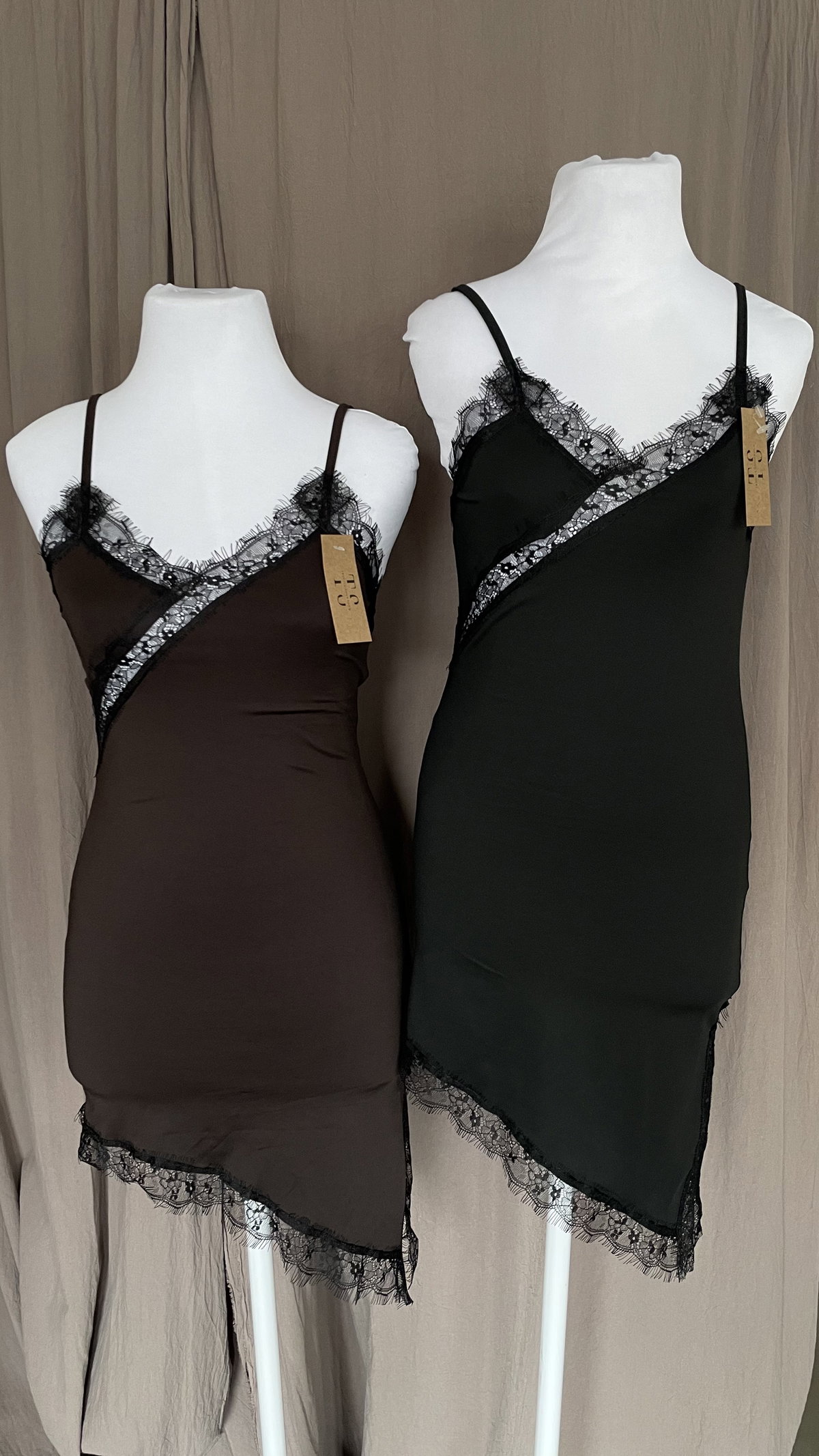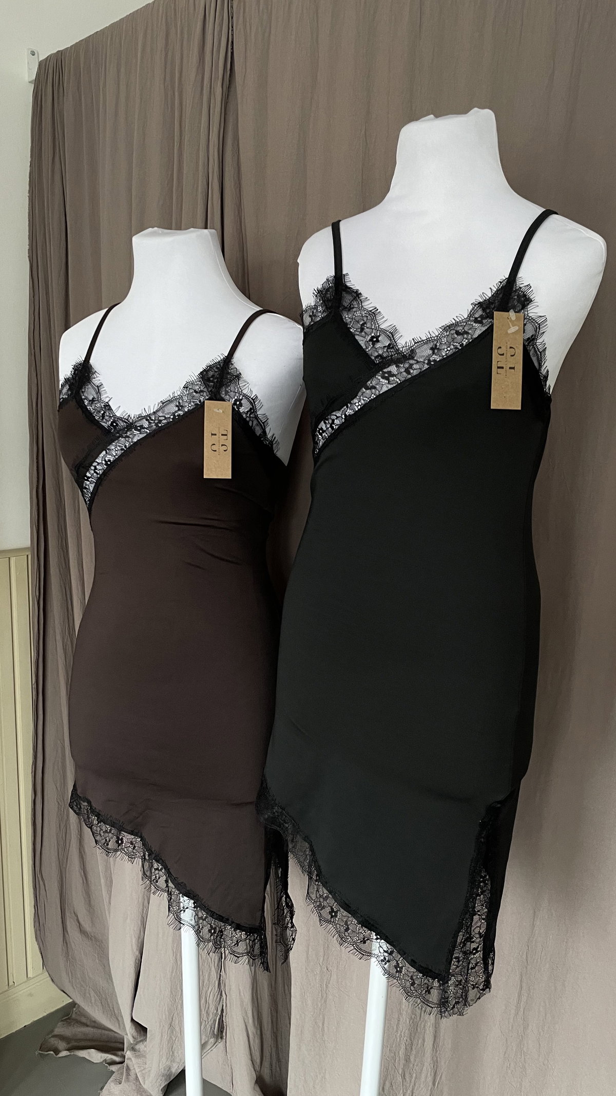 vestido corto de microfibra con encaje. terminacion en pico con tajo. talle unico elastizado, va para S/M aprox.