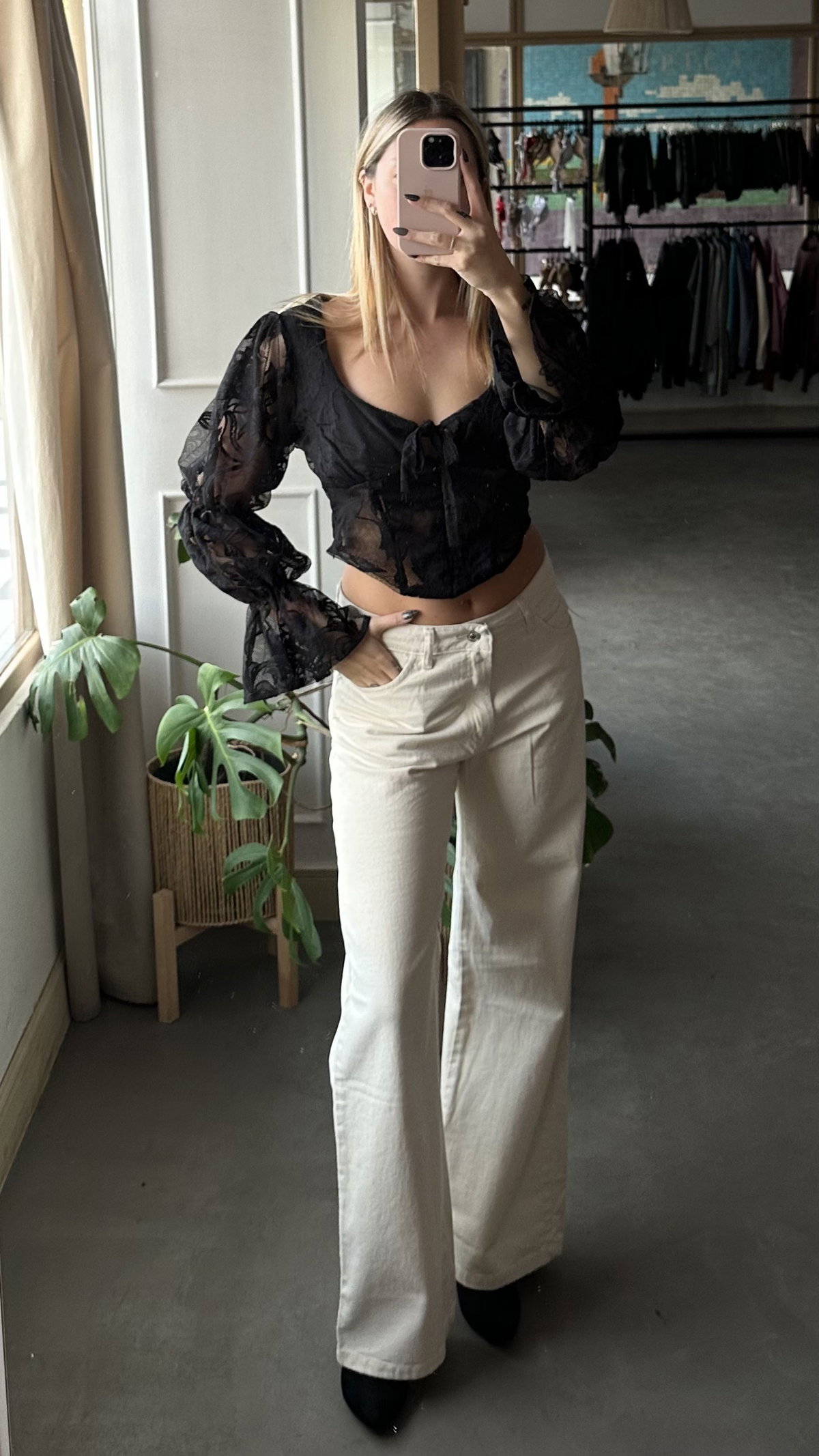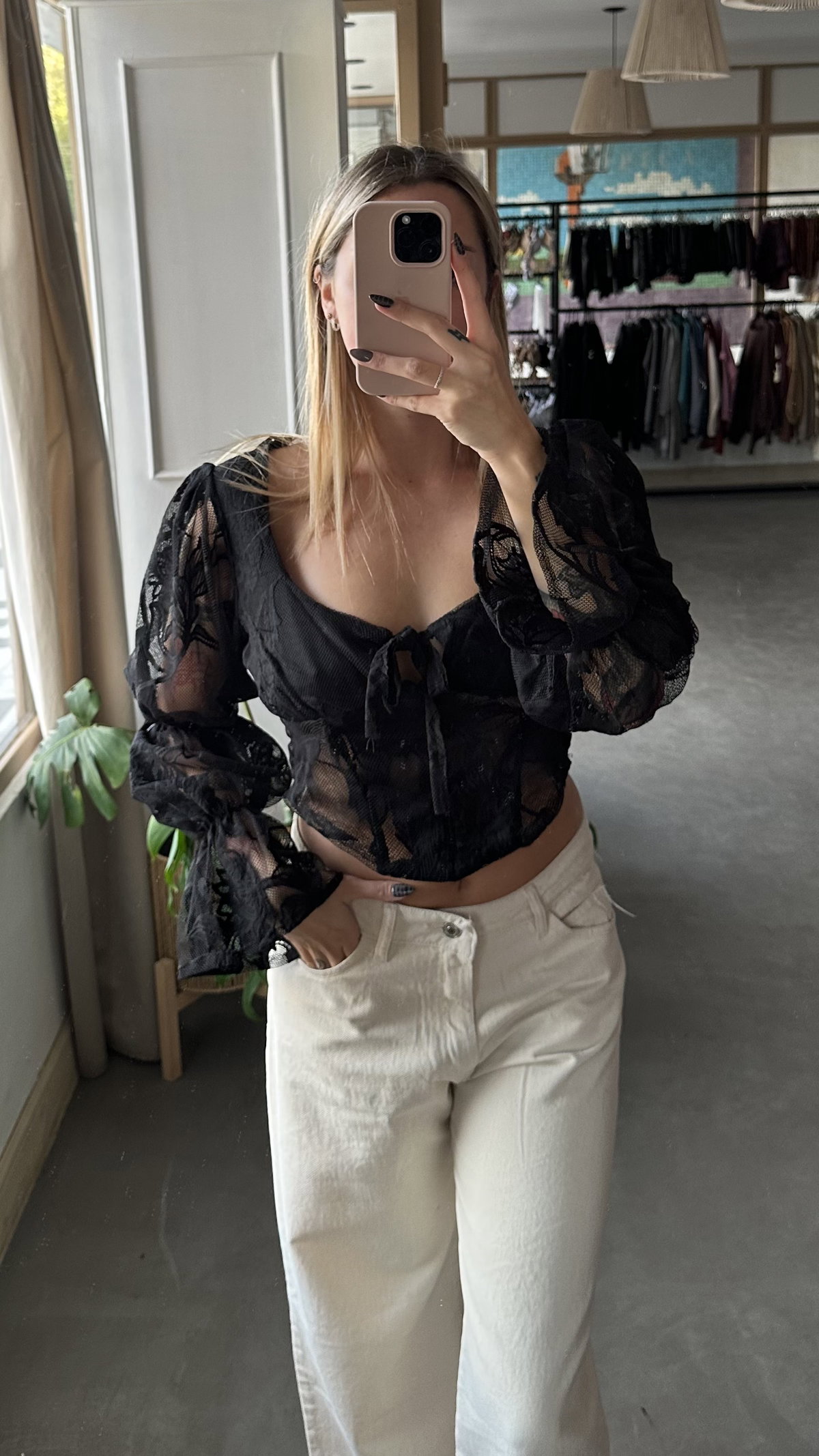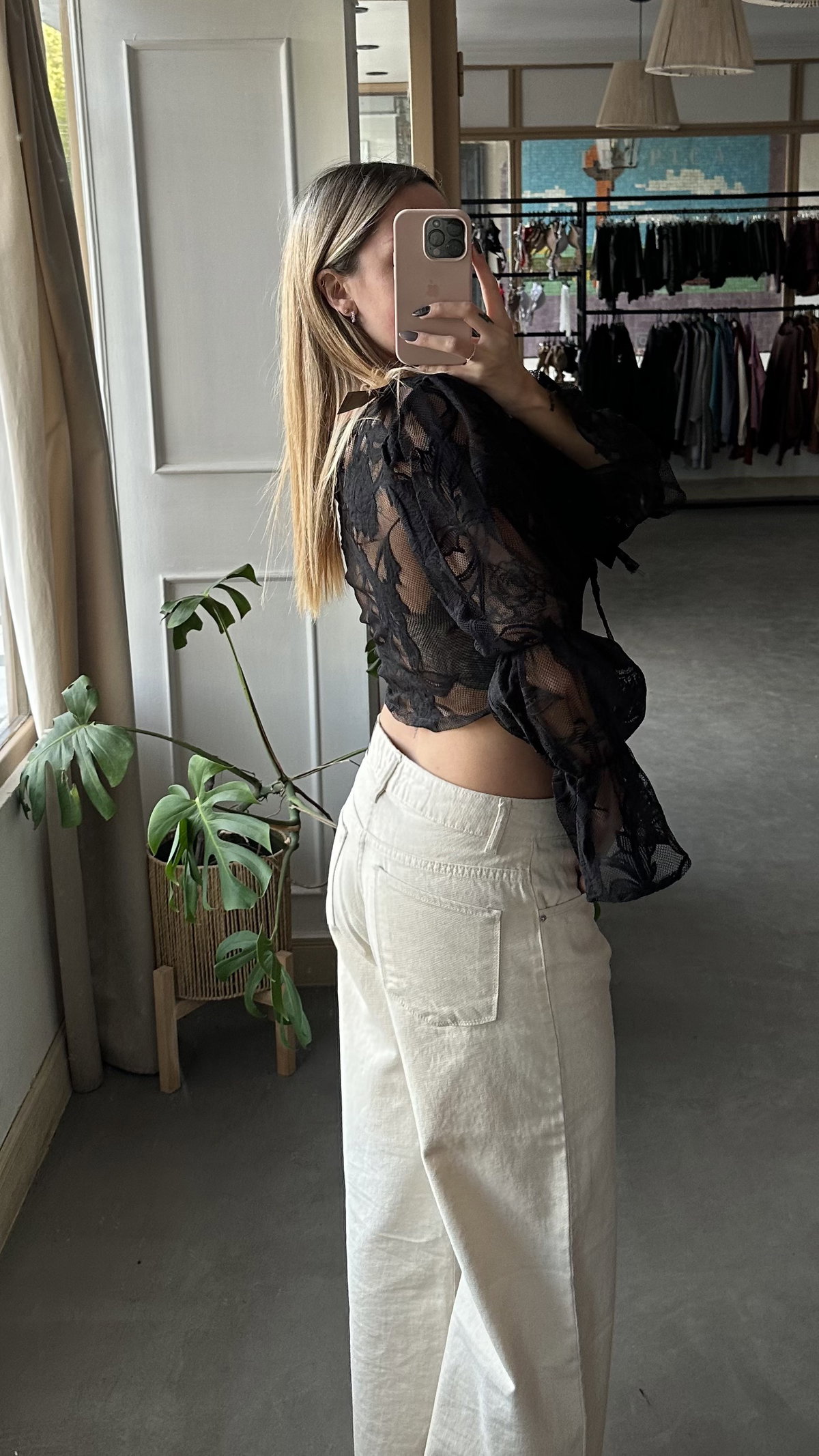 blusa de encaje con flores bordadas, tiene volados y se ata en el frente. tazas forradas. largo a la cintura aprox. trae un cierre lateral. los talles son amplios.