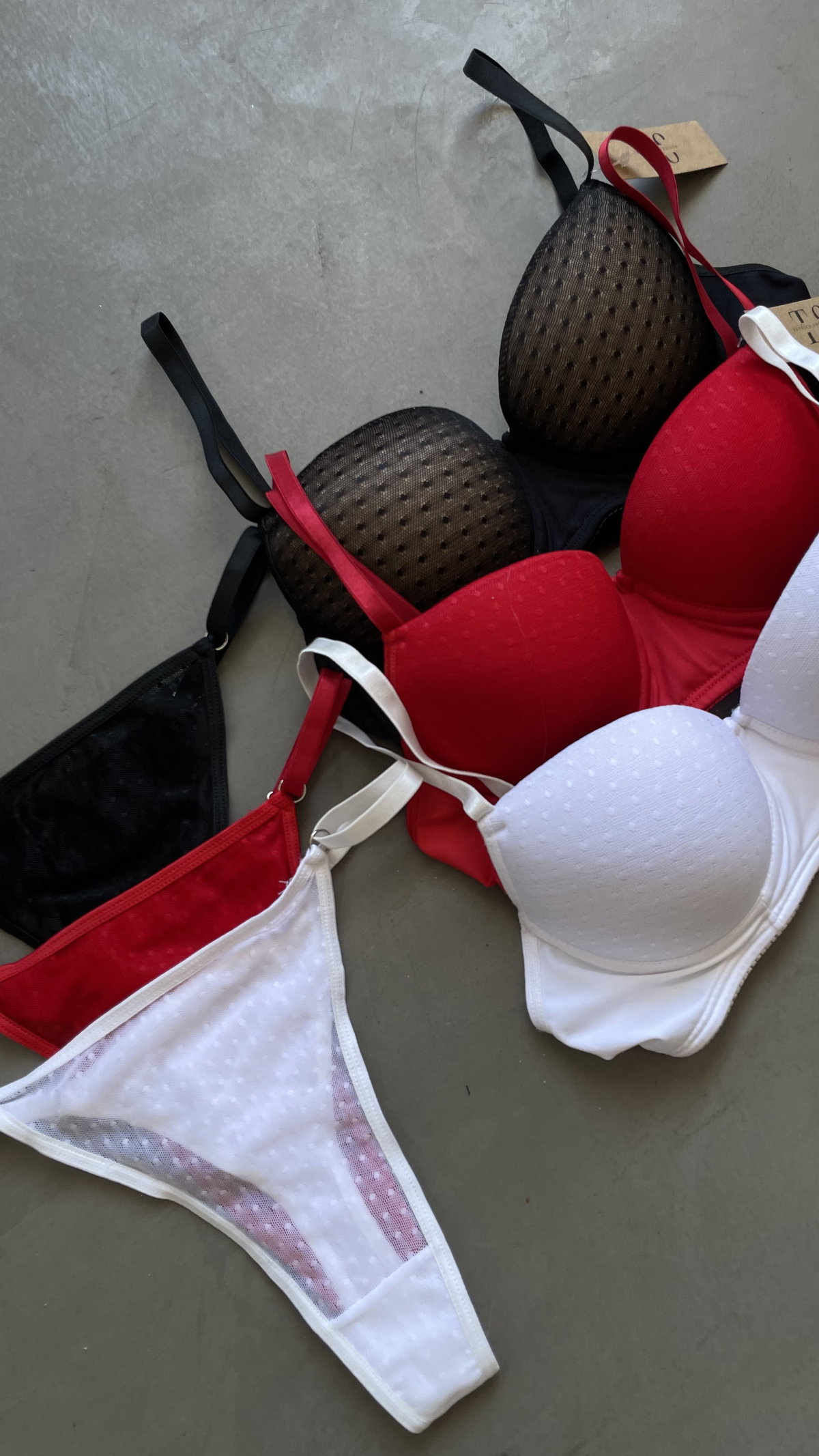 Conjunto de microfibra con puntitos, corpiño con push up y aro. bombacha colaless.