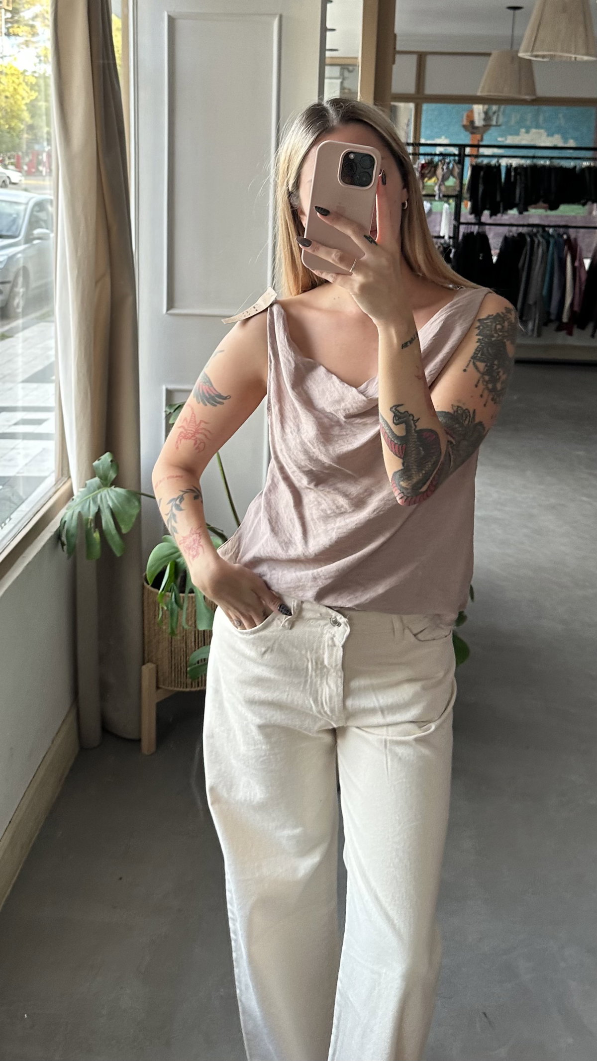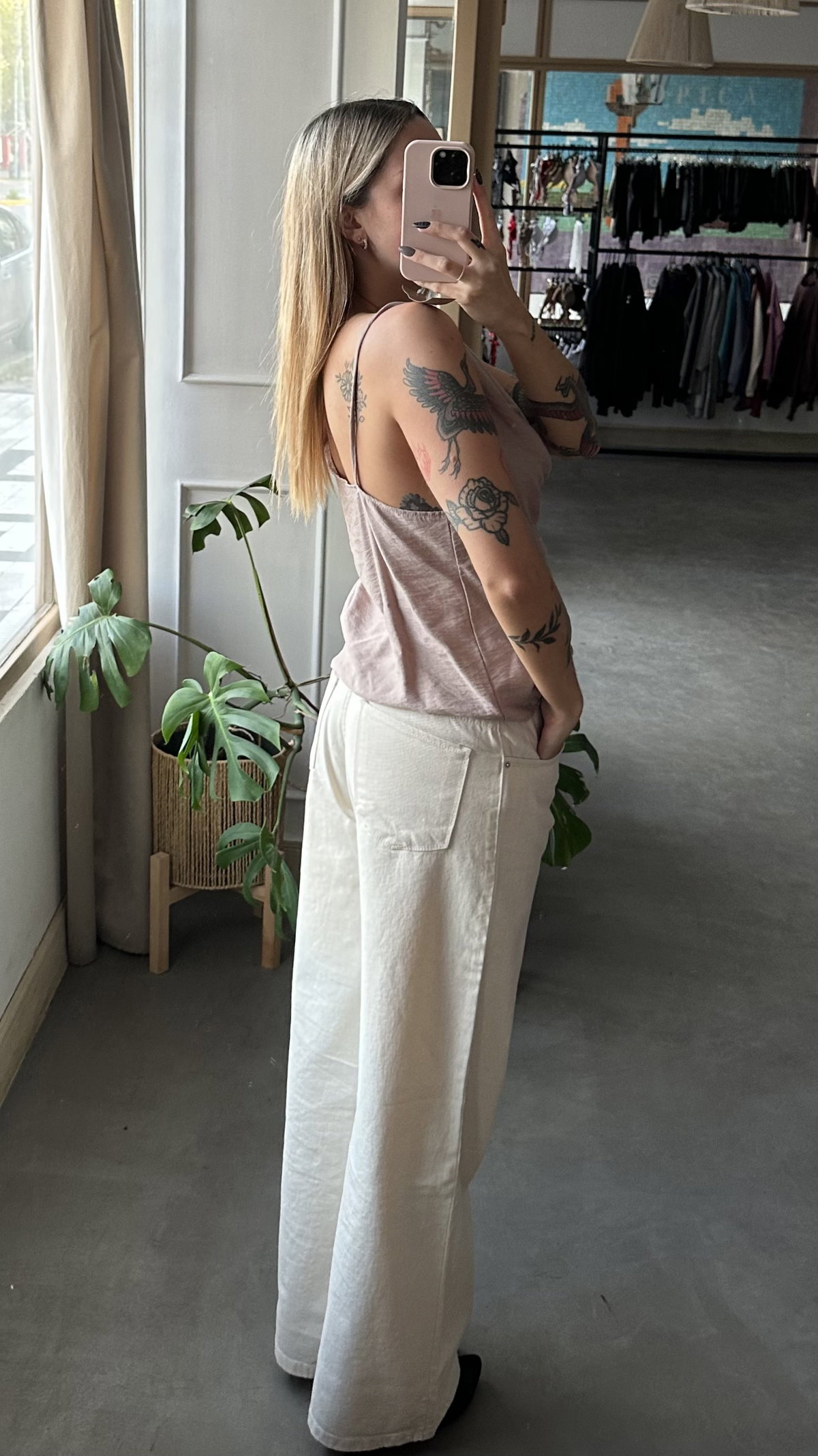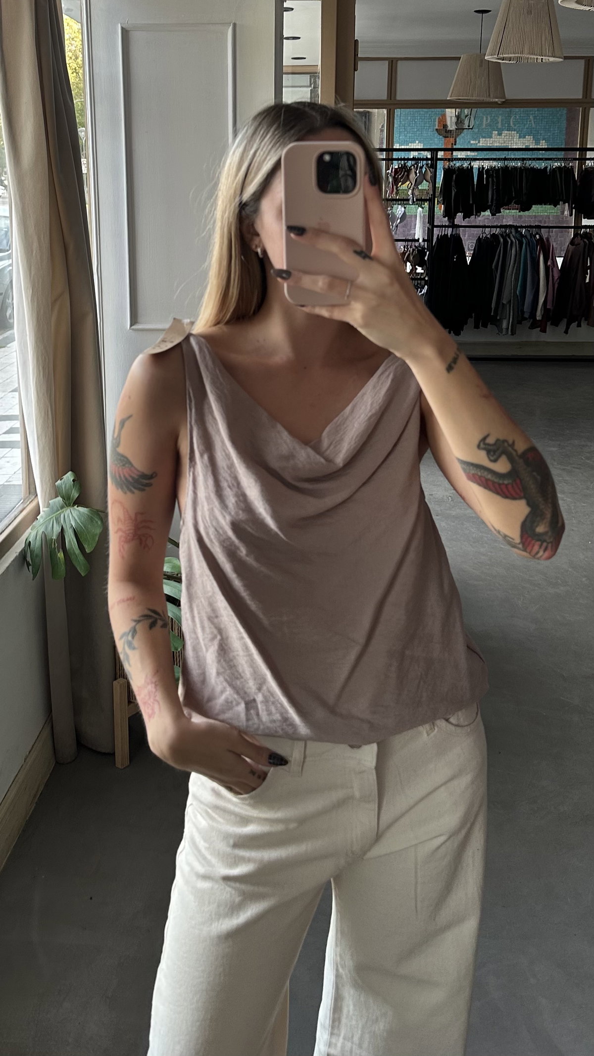 musculosa de lino con textura, larga la cadera, es liviana. Talle unico, aprox