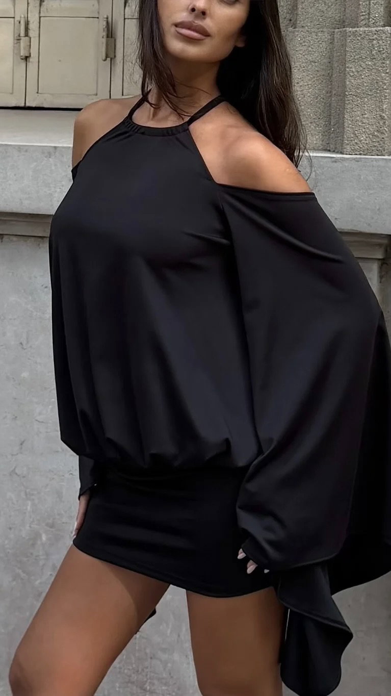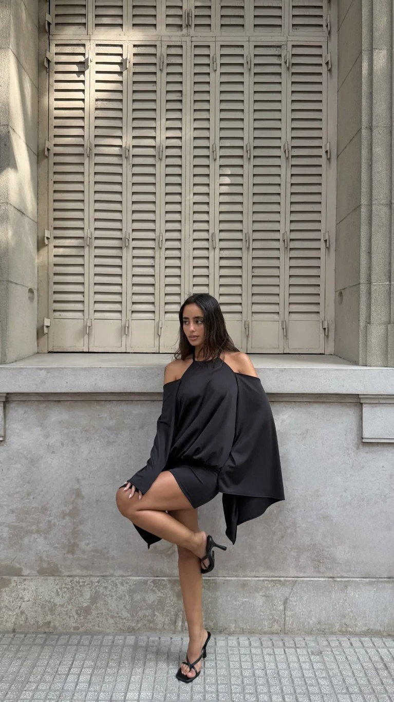 vestido corto de morley ribb con mangas amplias, espalda totalmente descubierta. talle unico, va para S/M aprox.