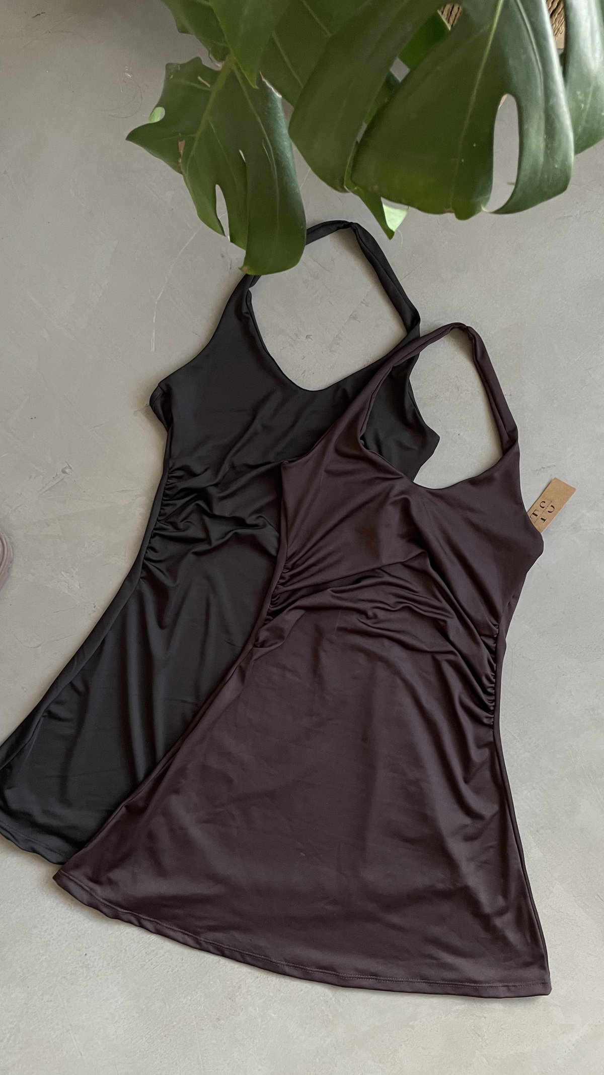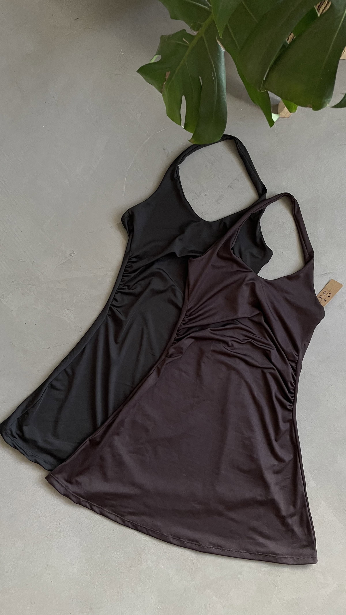 vestido corto de microfibra con frunces laterales, tipo plato con espalda descubierta. talle unico, va para S/M aprox.