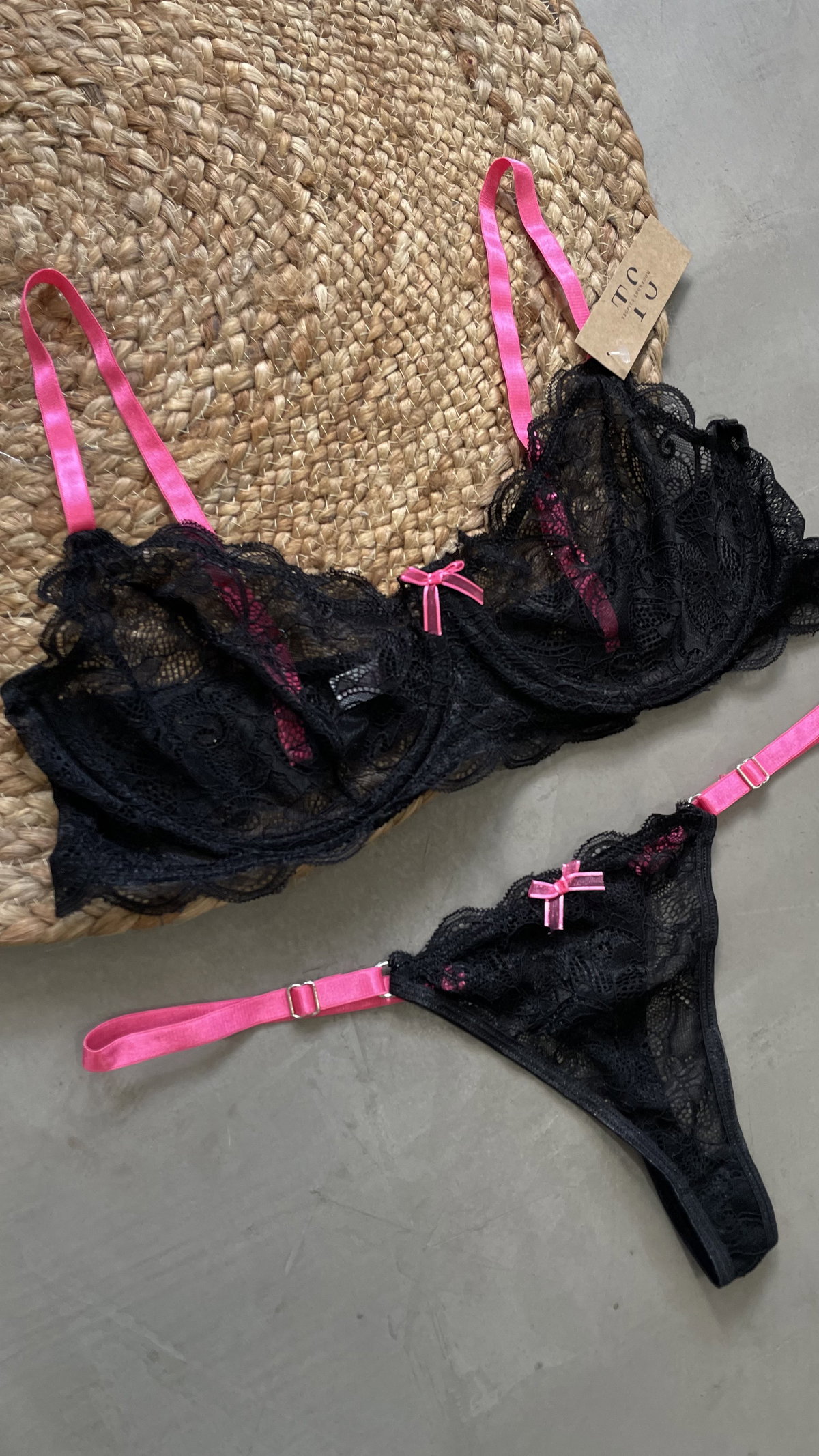 Conjunto marca Melifera confeccionado en encaje. corpiño con aro, sin relleno. bombacha colaless regulable.