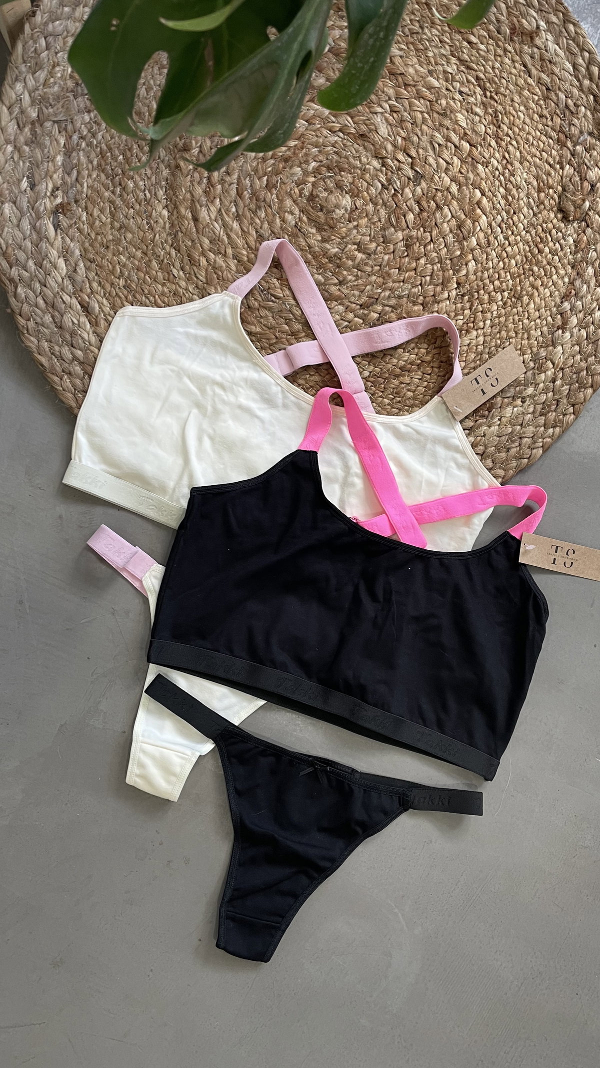Conjunto marca Takki confeccionado en algodon. corpiño tipo deportivo, sin relleno. bombacha colaless.