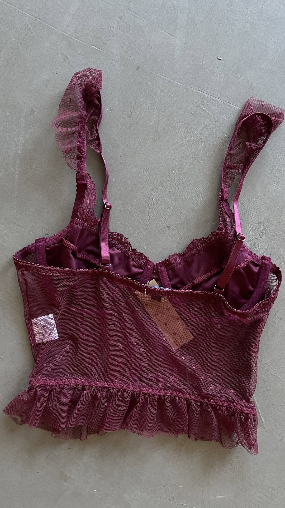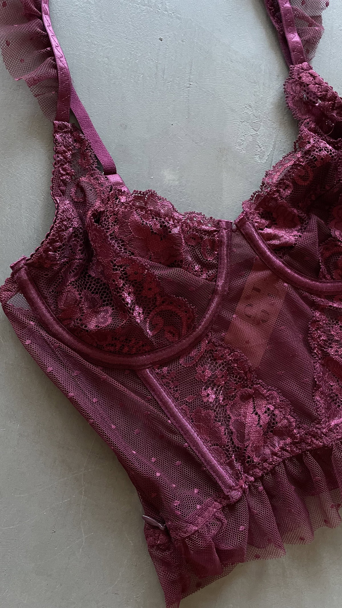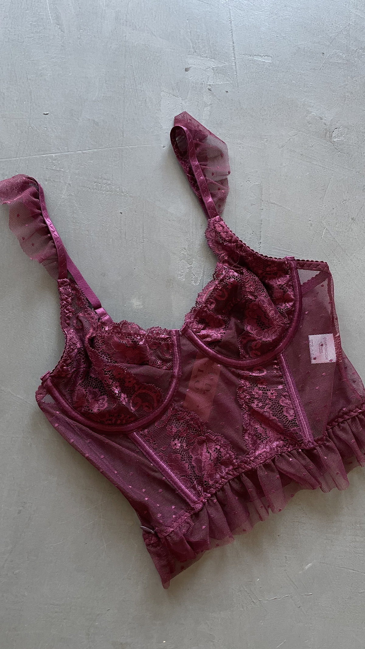 corset de microtul y encaje, con voladitos y ballenas. áreteles regulables, tiene un cierre lateral. es elastizado.