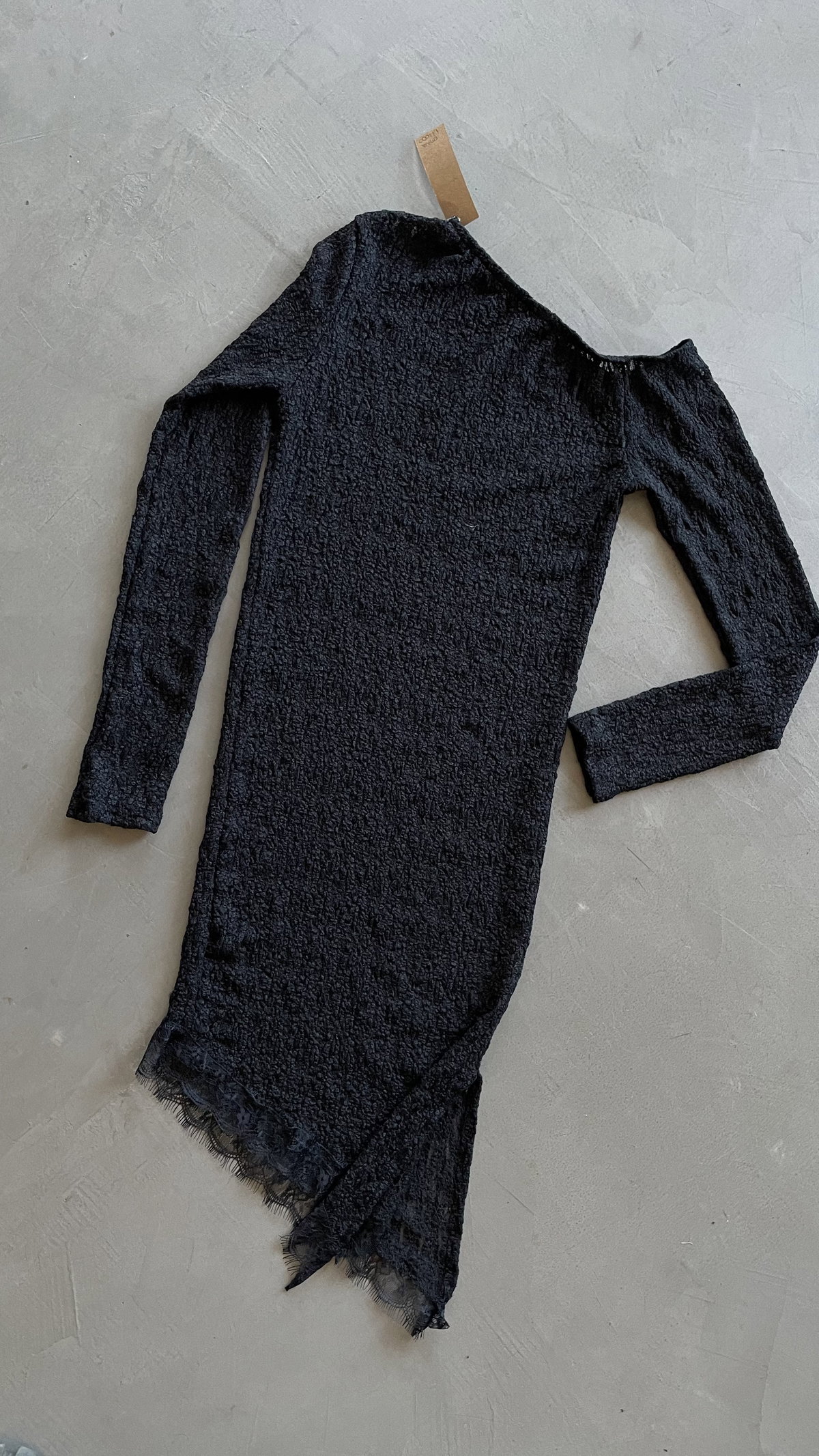 vestido corto de encaje, con corte irregular, es traslucido. talle unico, va para un
