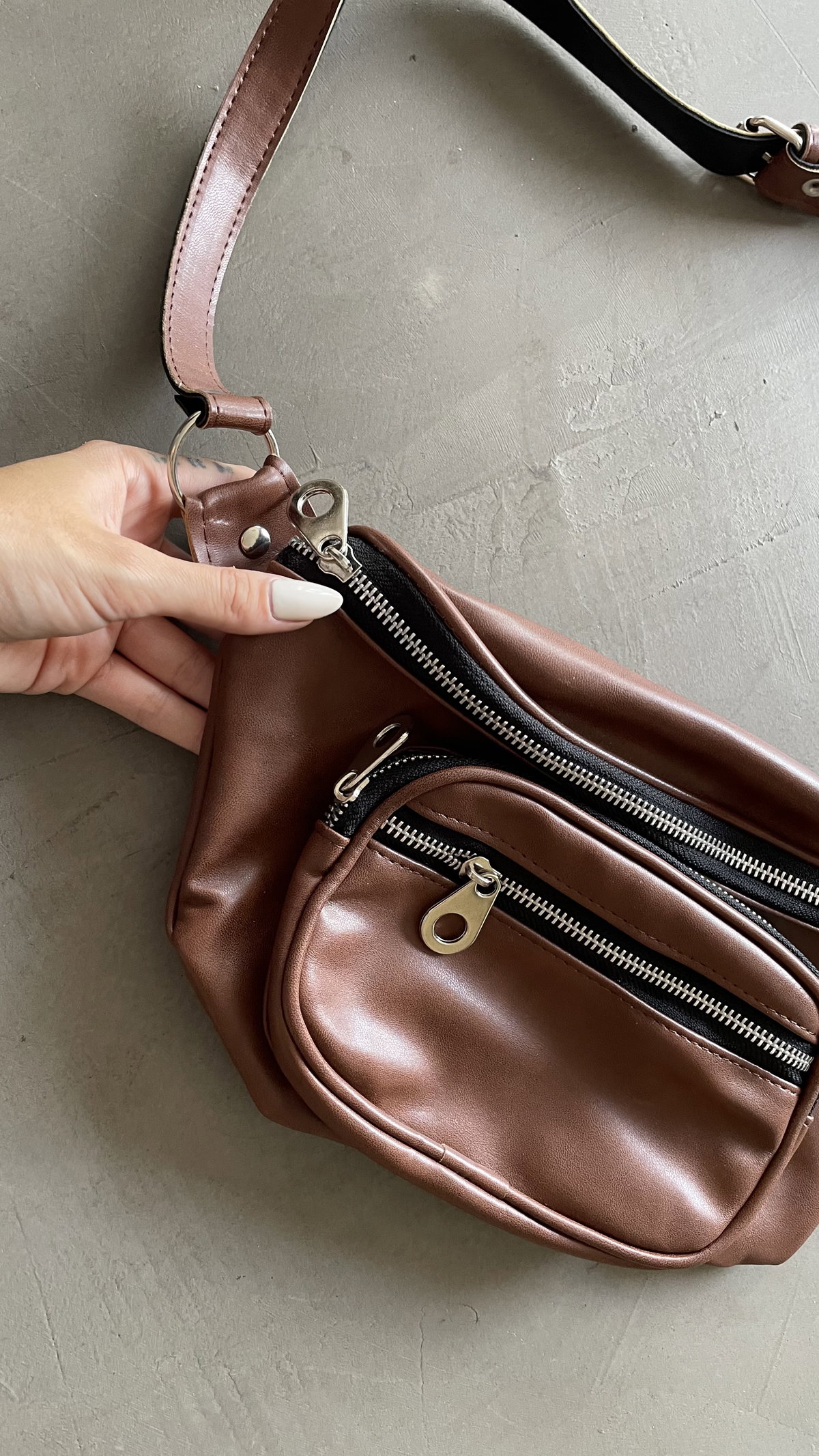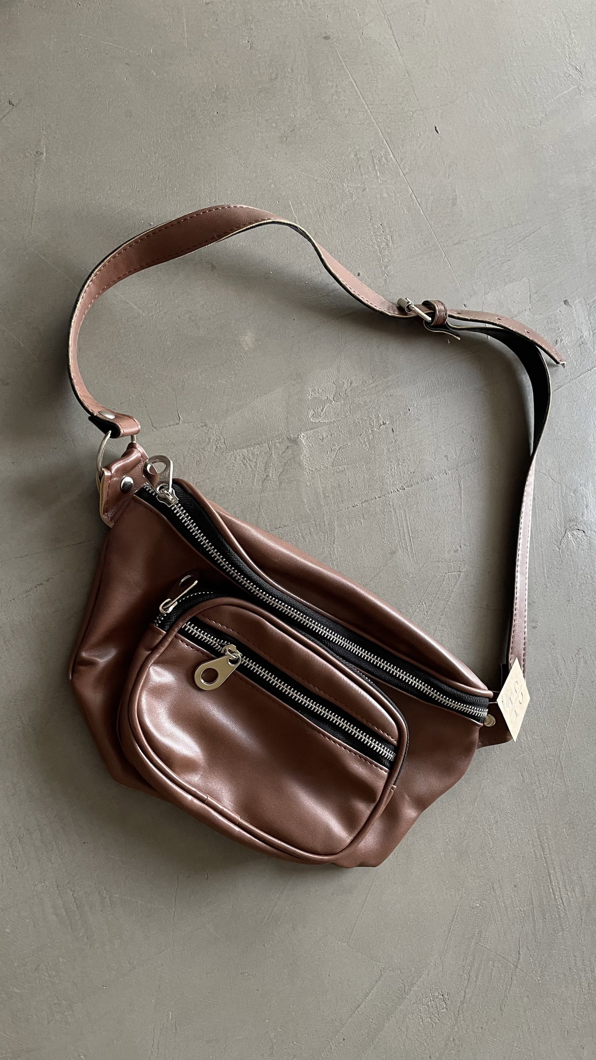 riñonera de ecocuero, tamaño maxi. tiene dos compartimientos en el frente y uno grande. viene forrada.