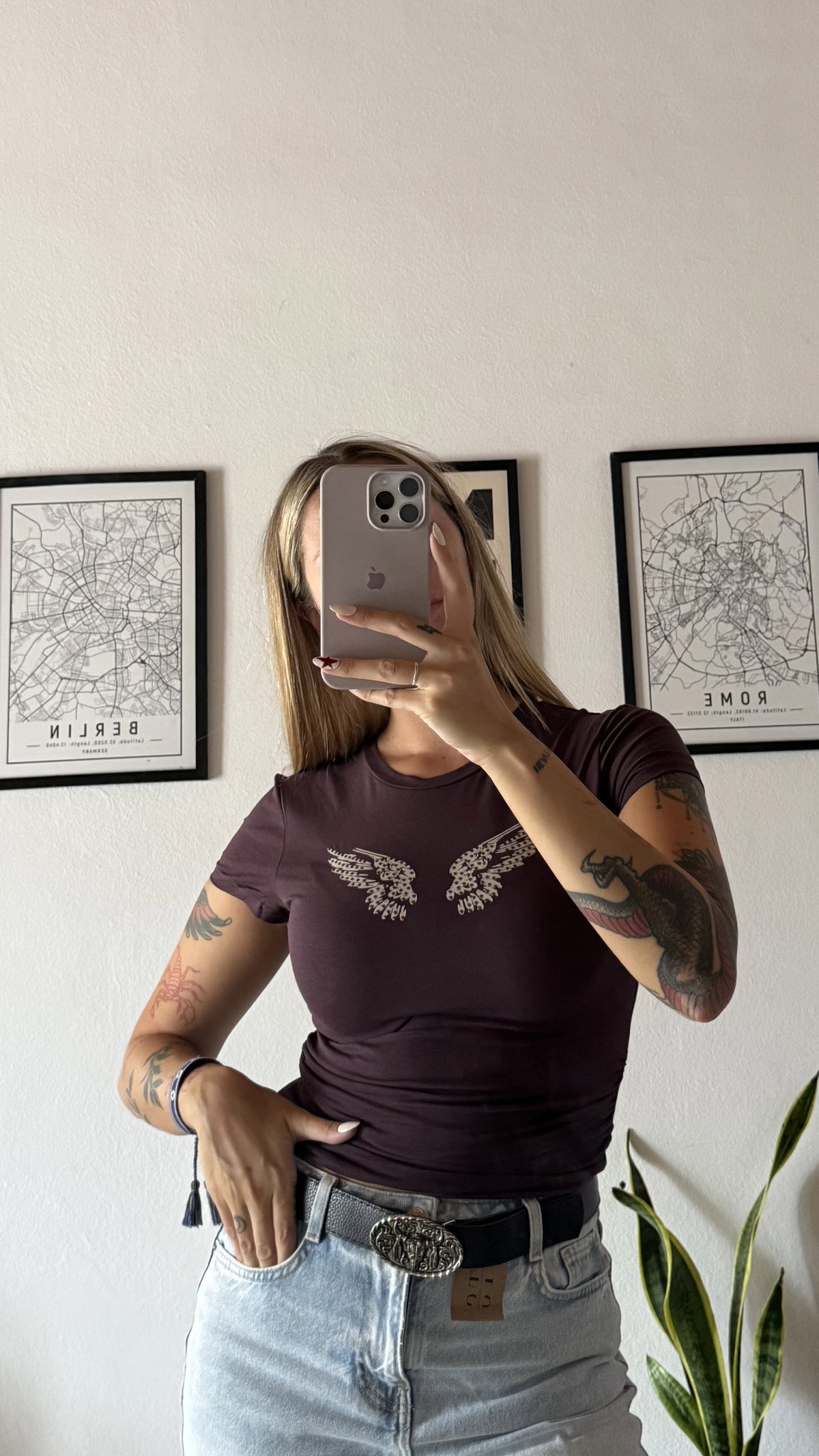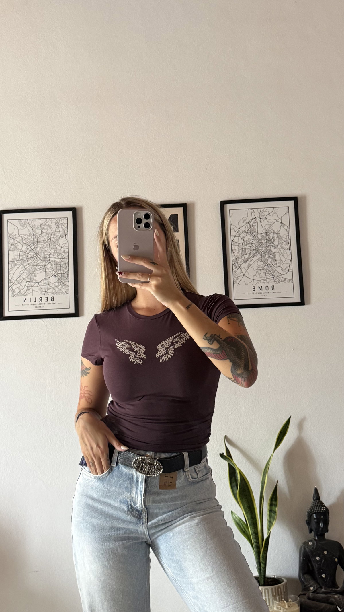 Remera crop de morley ribb con estampa y tachas, elastizado. los talles son justos/chicos.