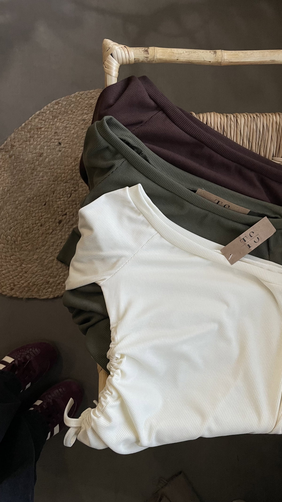Camiseta con escote paisana, de morley. detalle de frunce lateral. Talle unico, va para