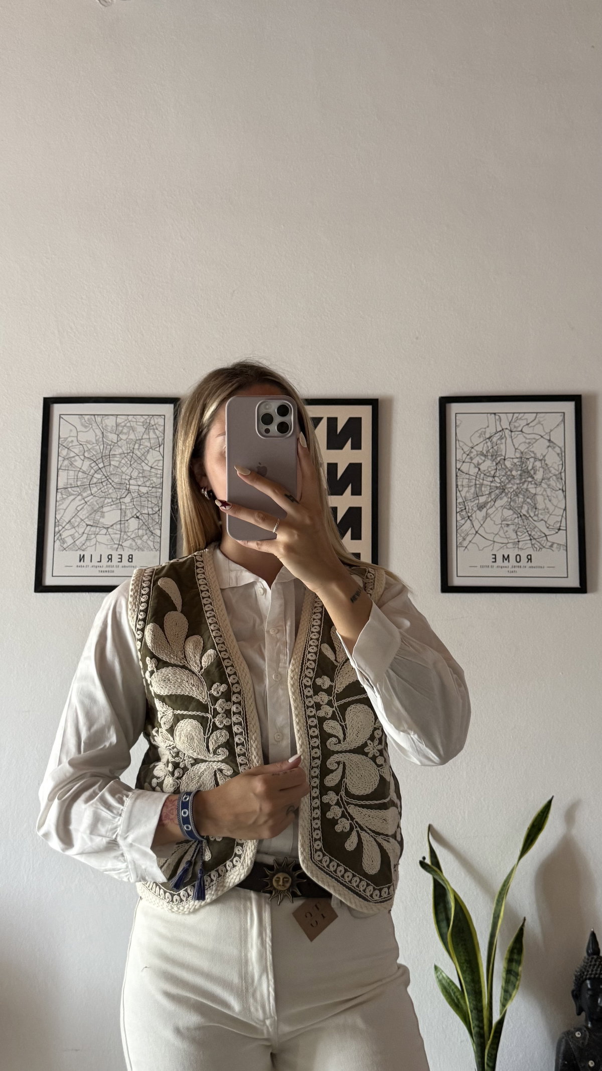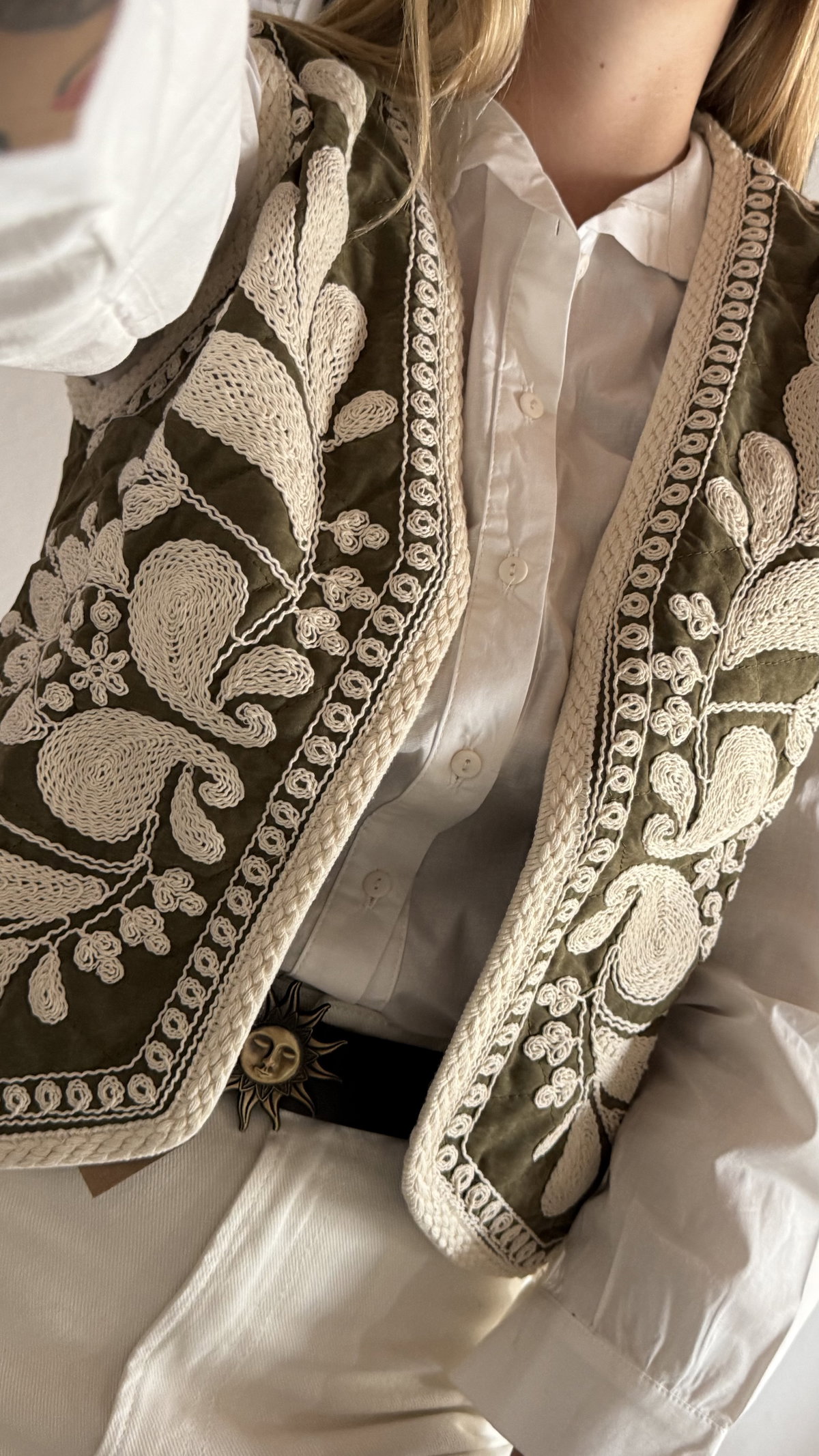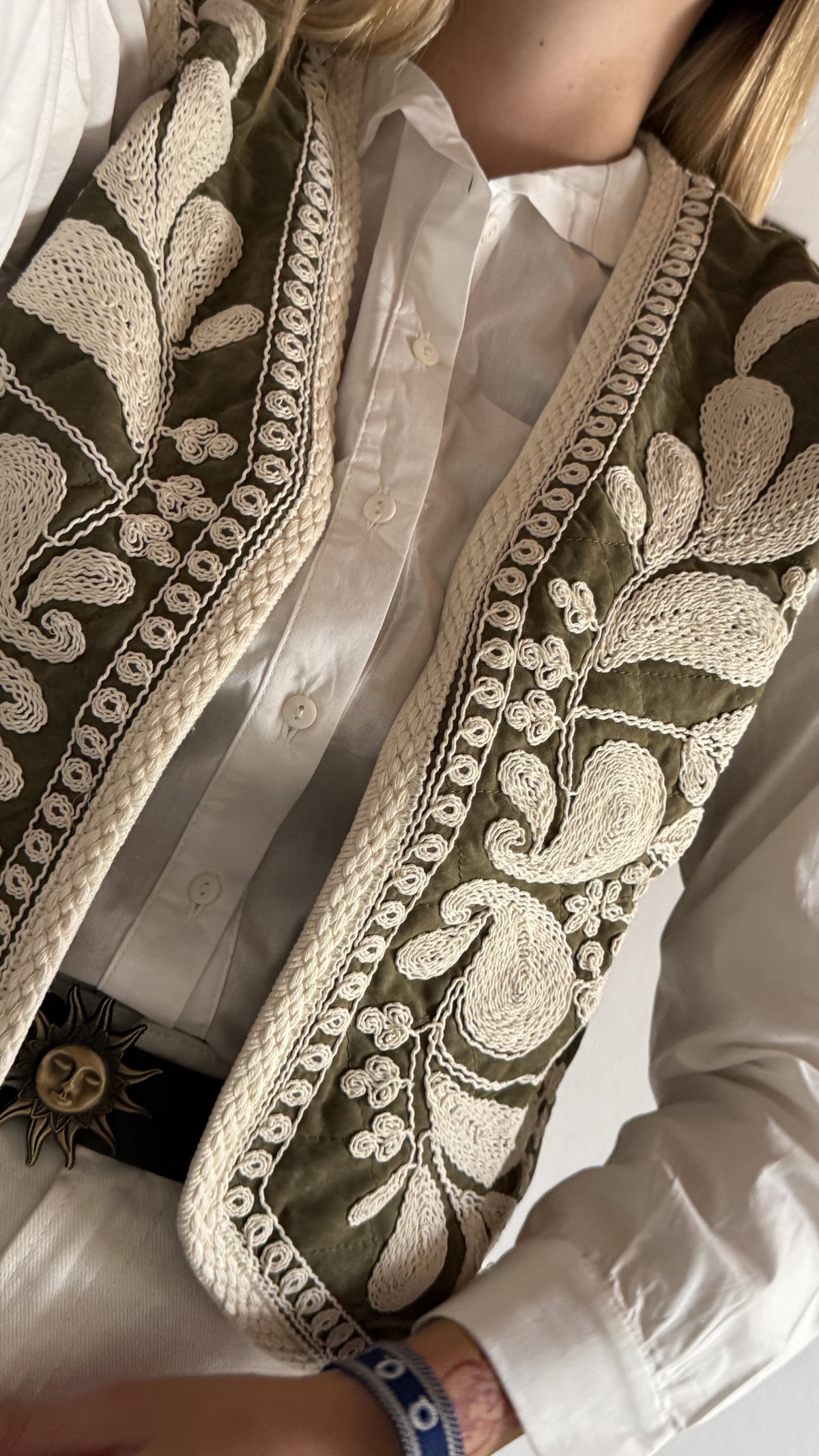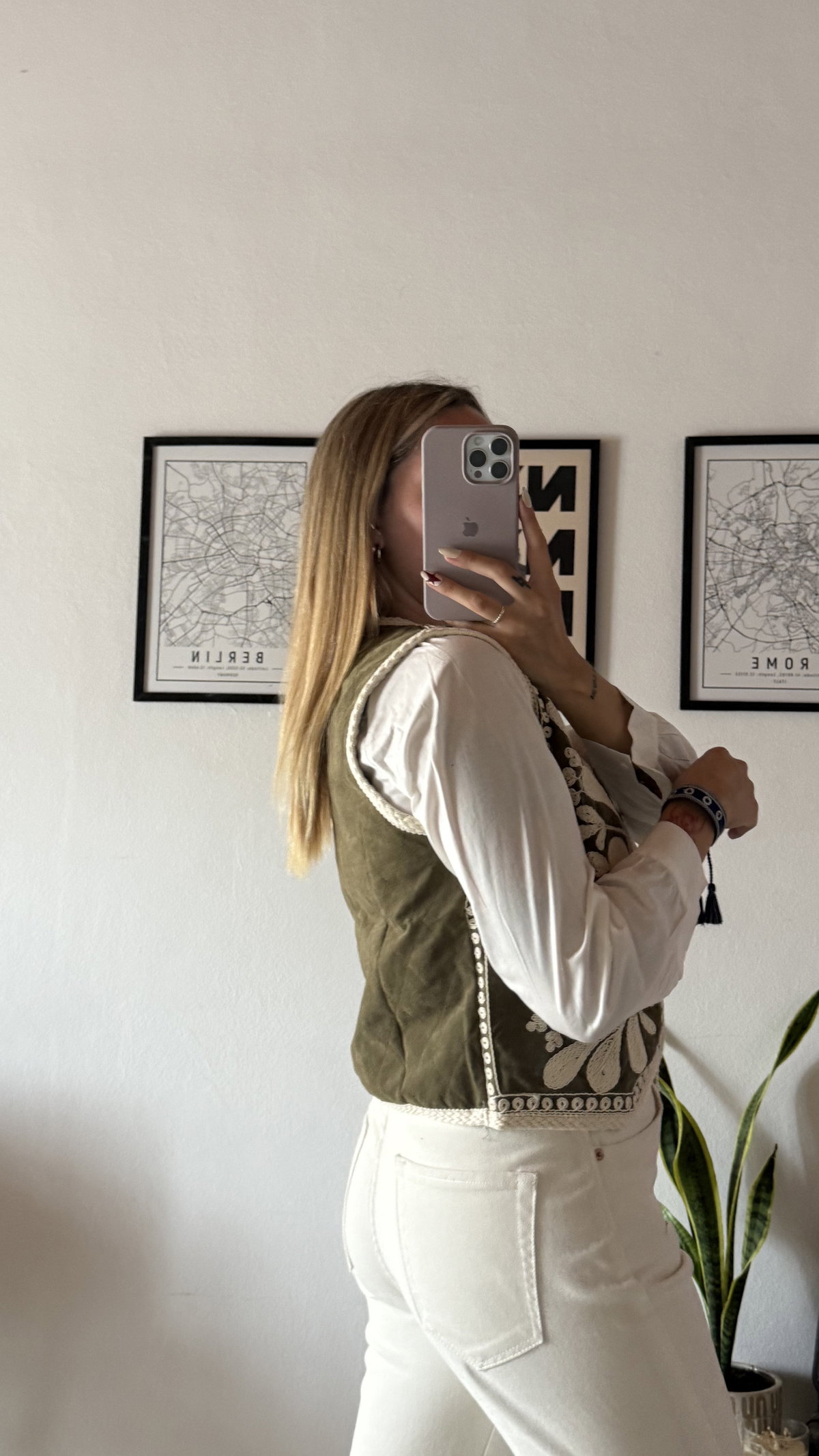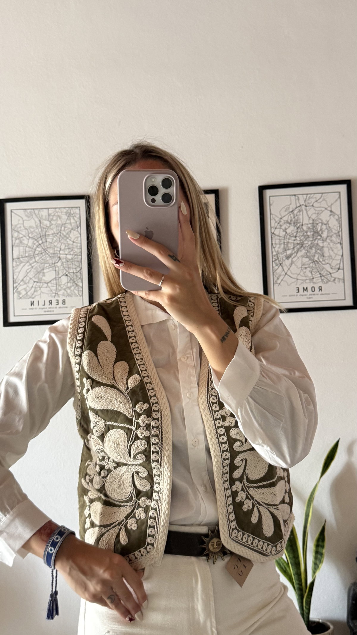Chaleco importado, simil aterciopelado. interior forrado. detalle de bordado. largo arriba de la cadera aprox. Talle unico, va para un M.