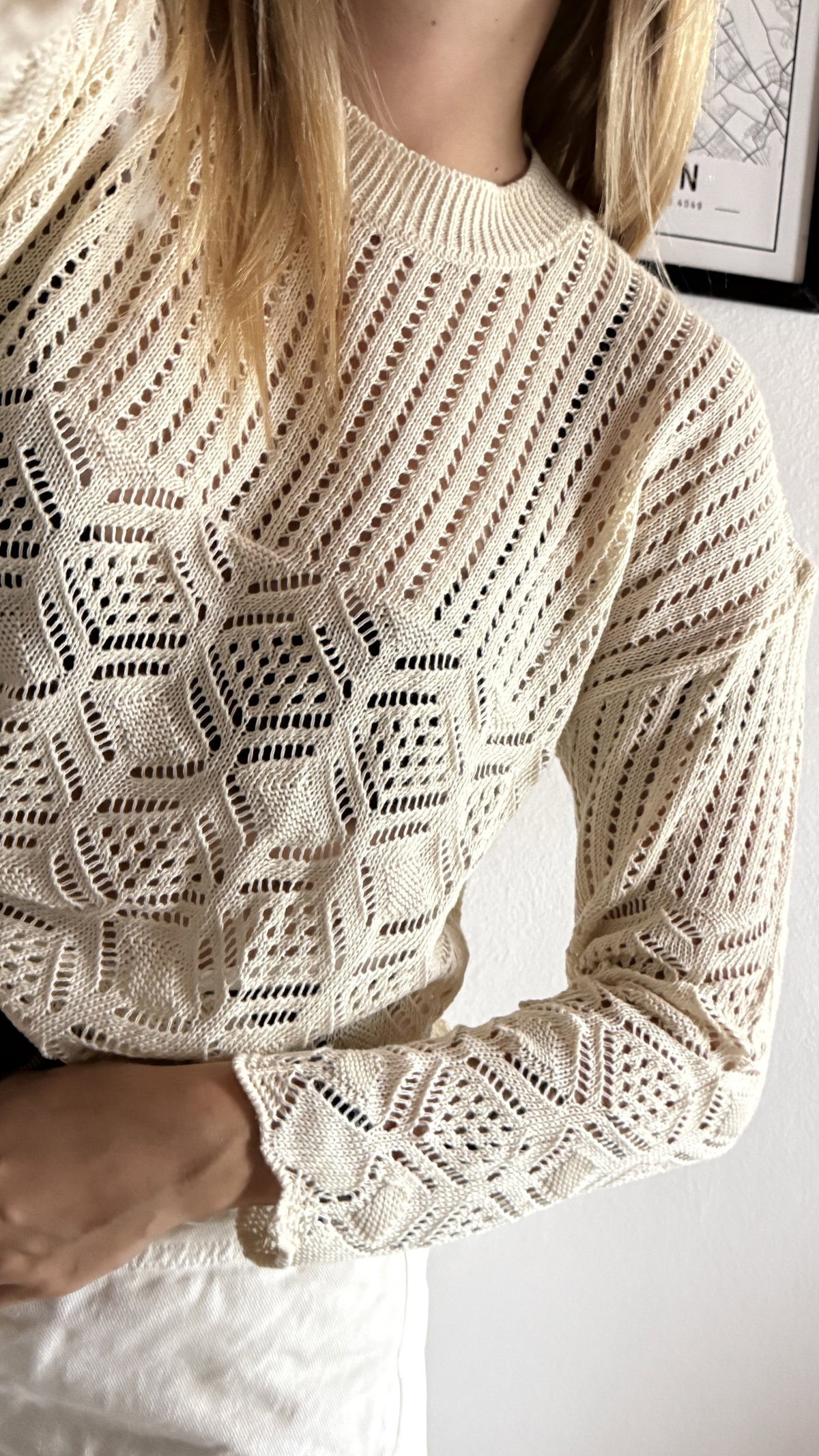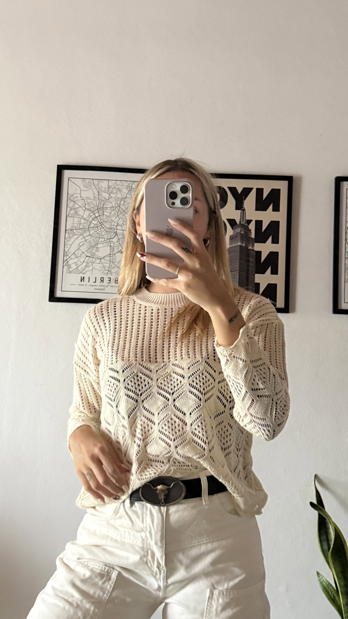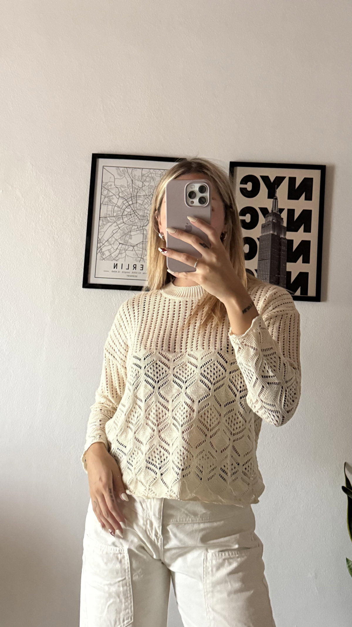 sweater de hilado fino, calado con tramas. modelo a la cadera aprox, talle unico, va para
