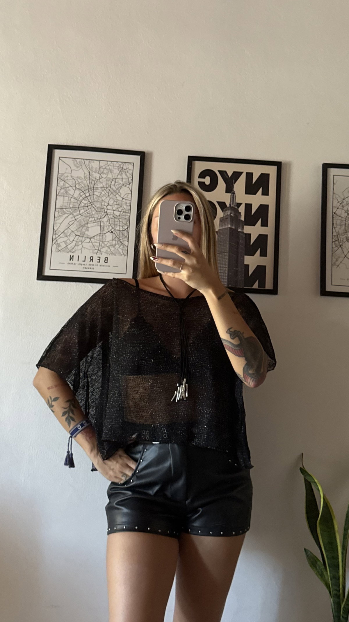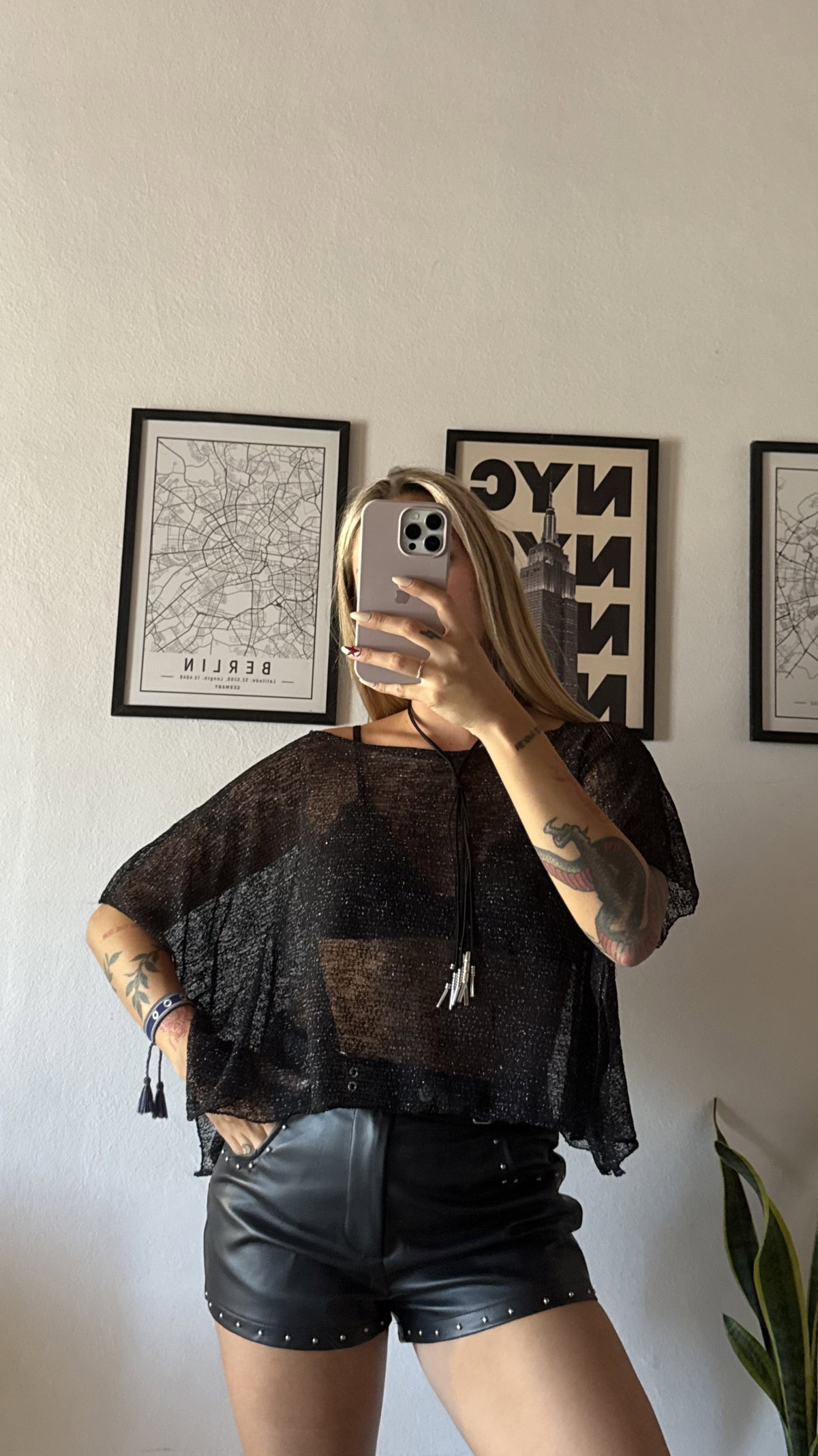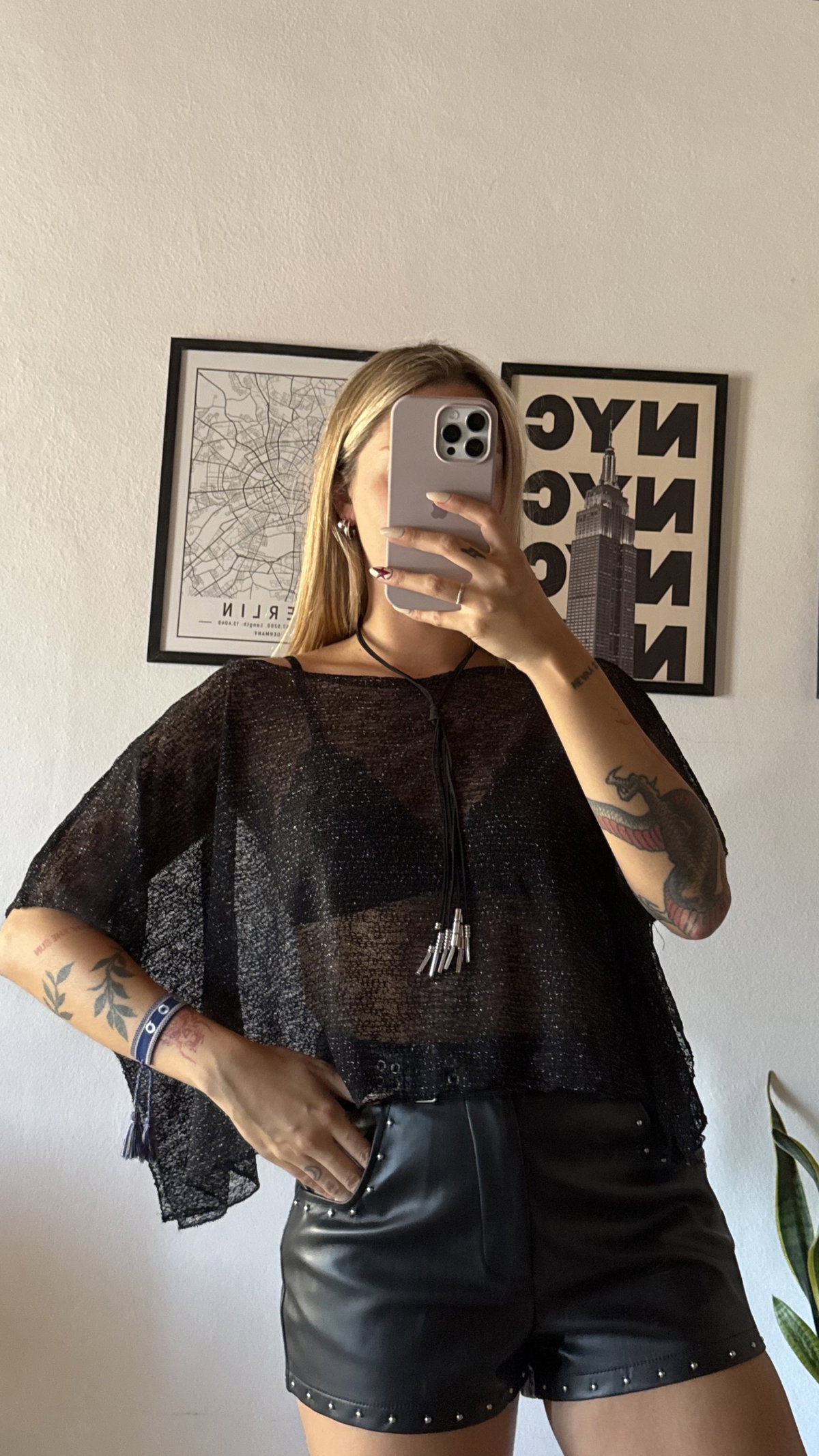 remera tipo capa, de microtul con lurex. elastizado. talle unico, se adapta hasta un L aproximadamente.