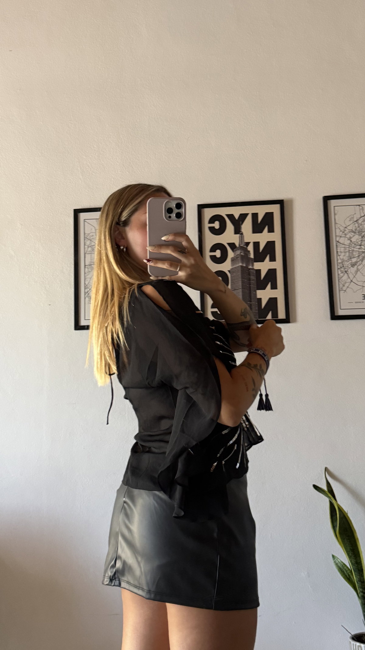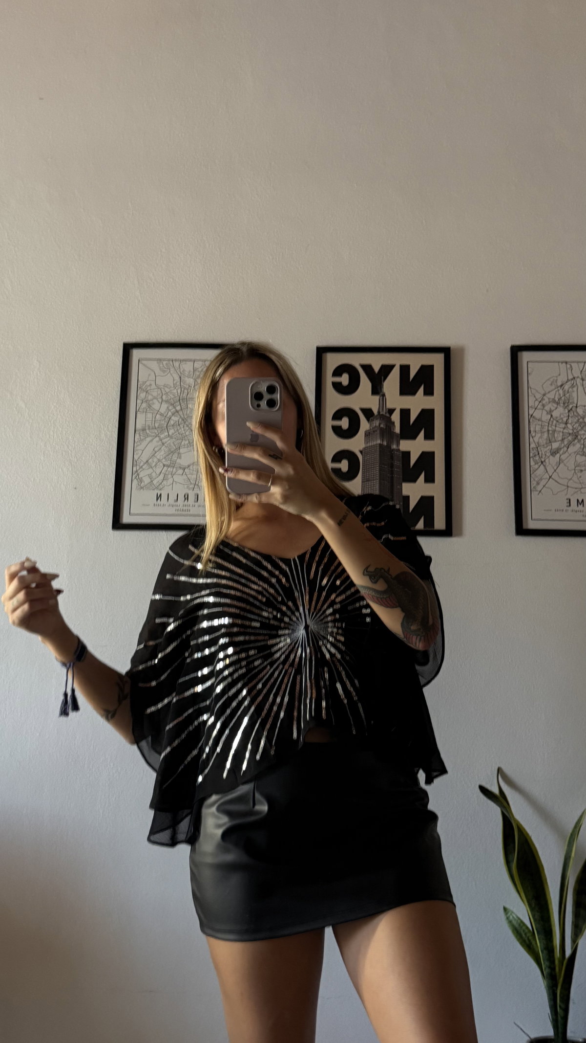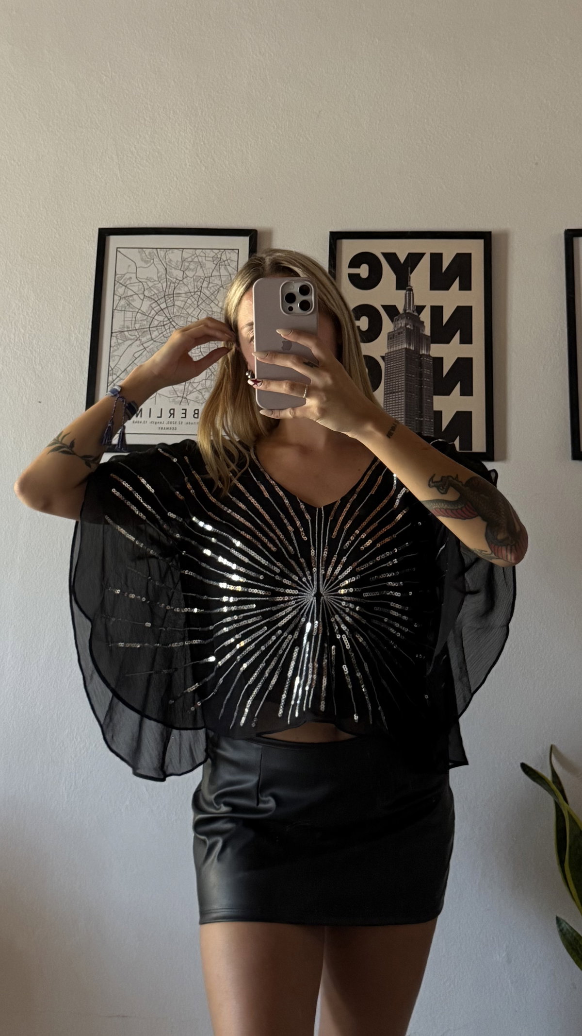 remera de microtul con bordado de lentejuelas. manga tipo mariposa. espalda en U con tira para atar. talle unico, va para S/M. producto importado.