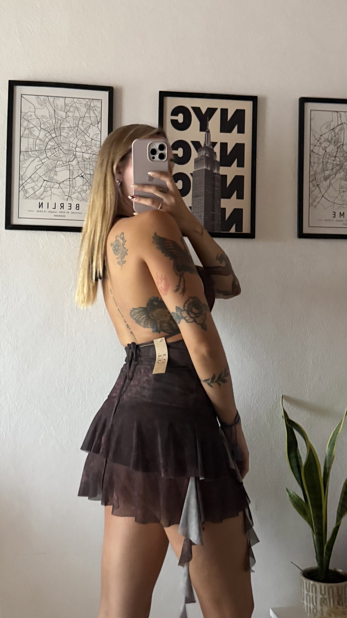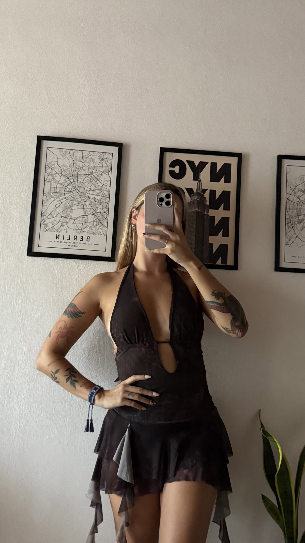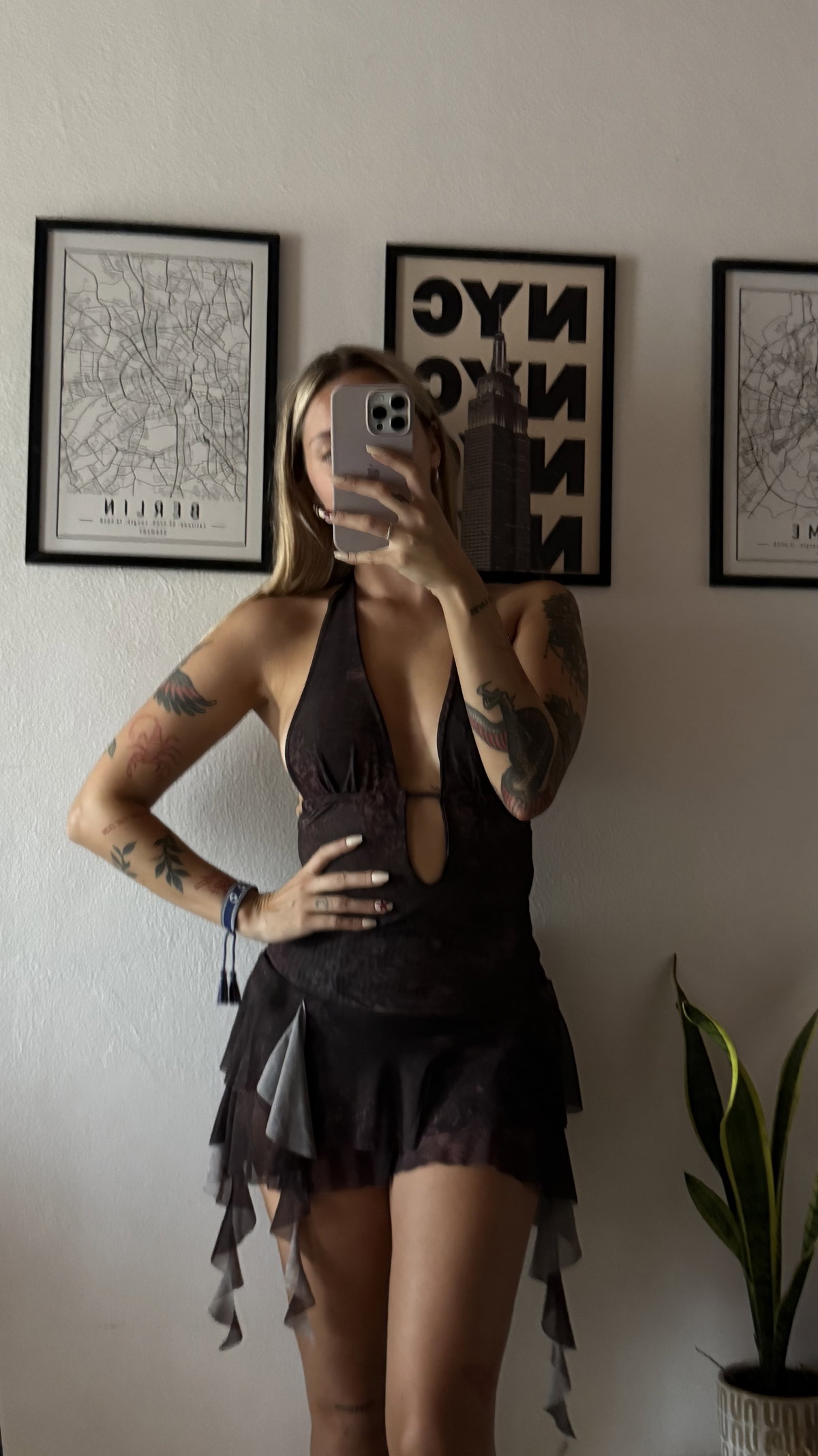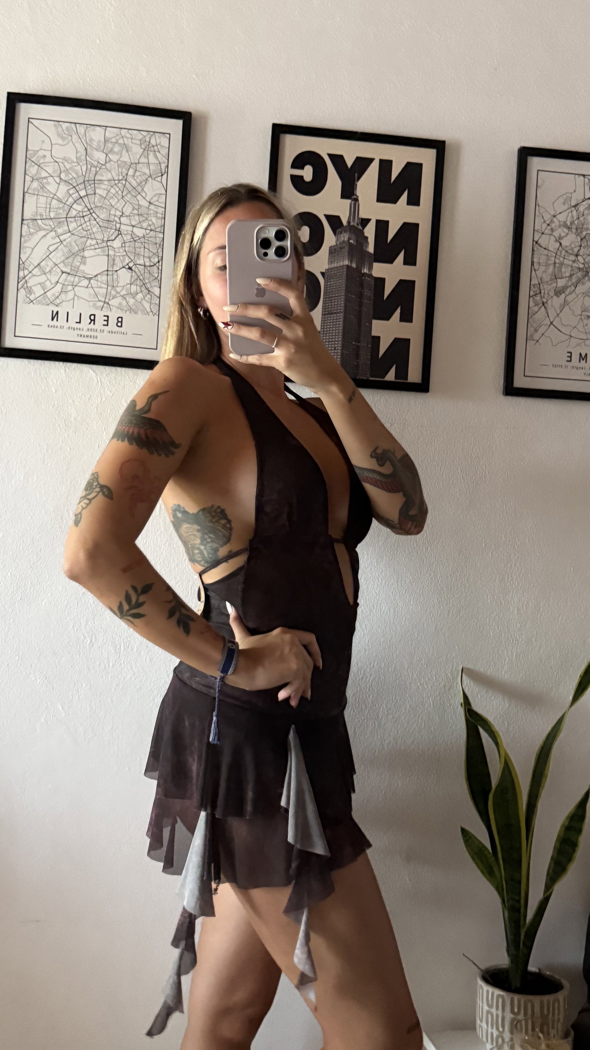 vestido corto de microtul estampado con forro en las tazas, elastizado. tiene volados irregulares a los lados. talle unico, aprox S.