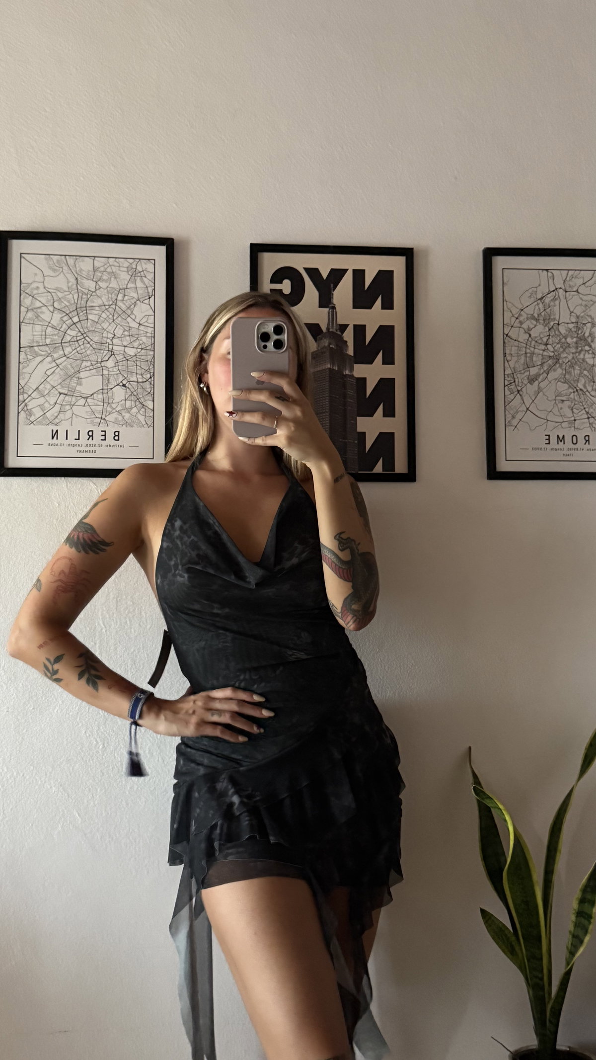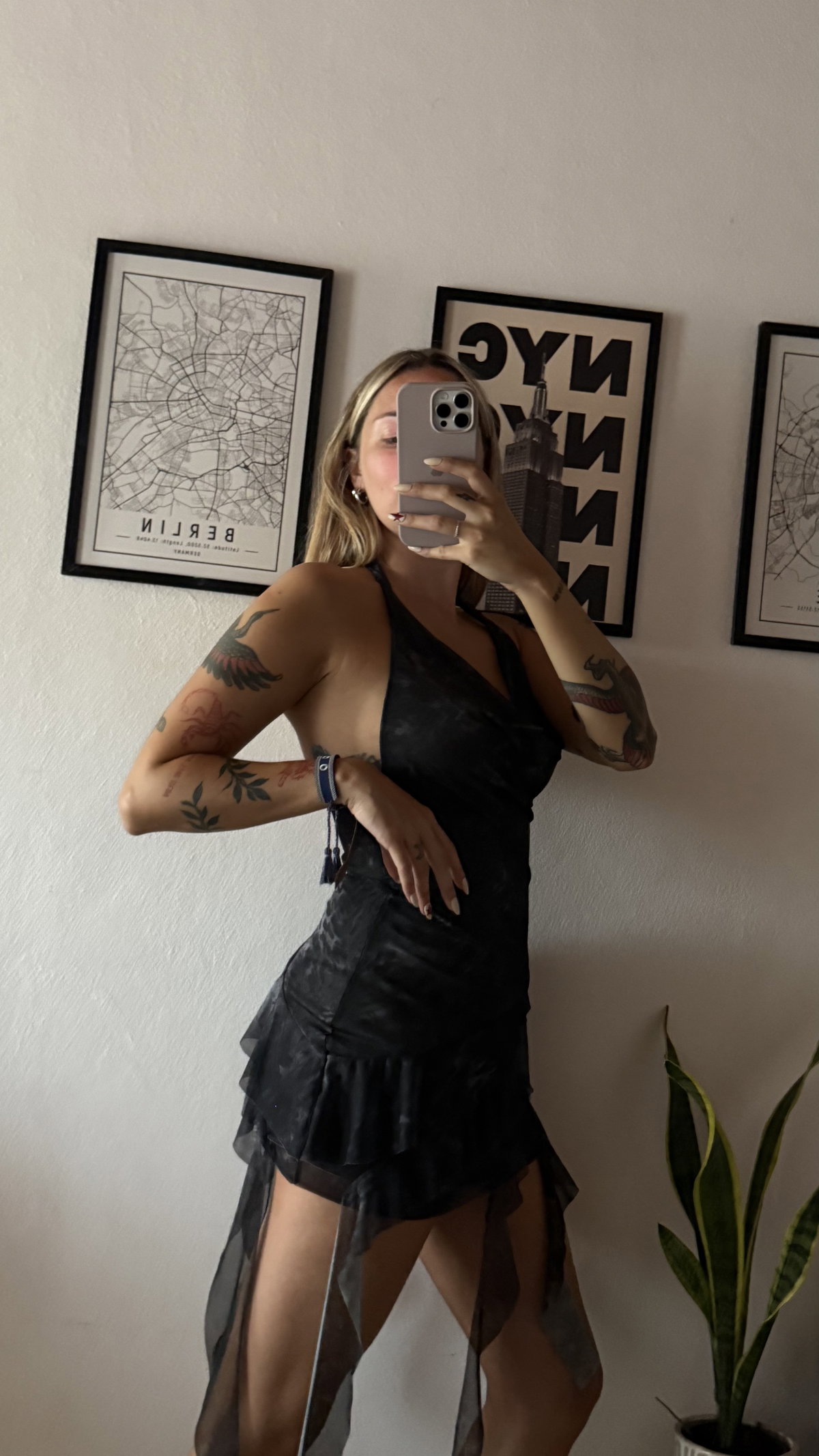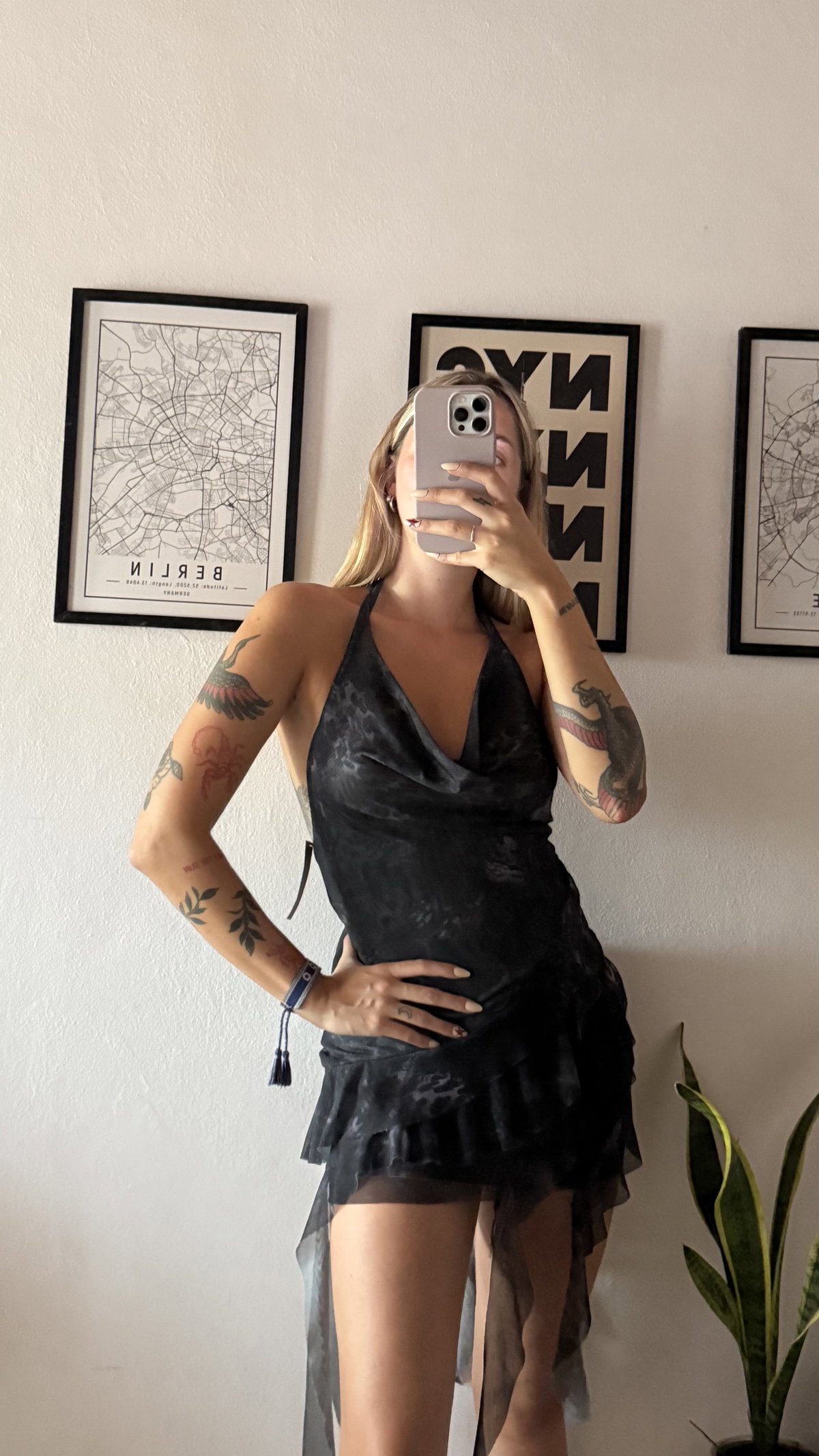 vestido corto de microtul estampado con cuello buche, elastizado. tiene volados irregulares a los lados. talle unico, aprox S.
