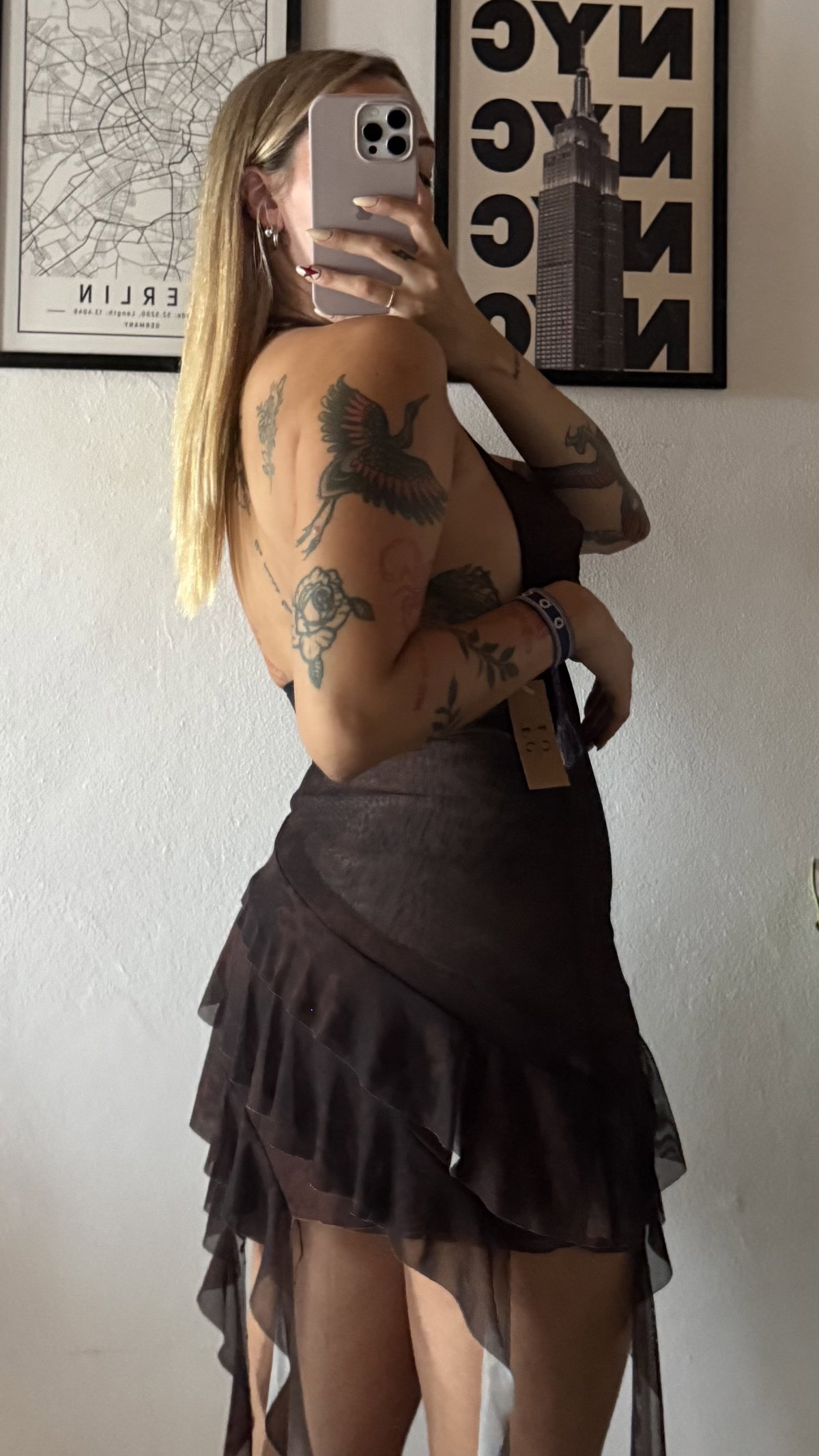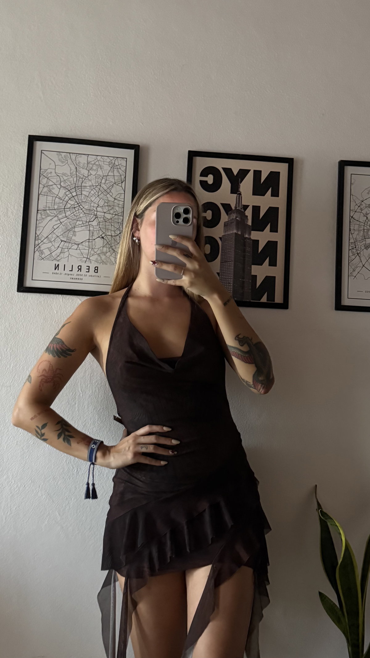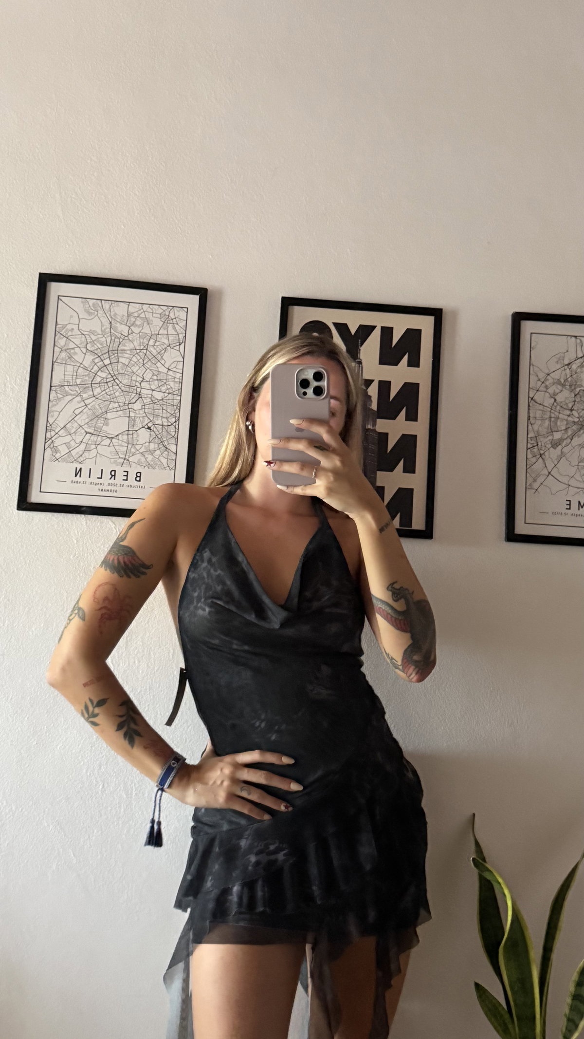vestido corto de microtul estampado con cuello buche, elastizado. tiene volados irregulares a los lados. talle unico, aprox S.