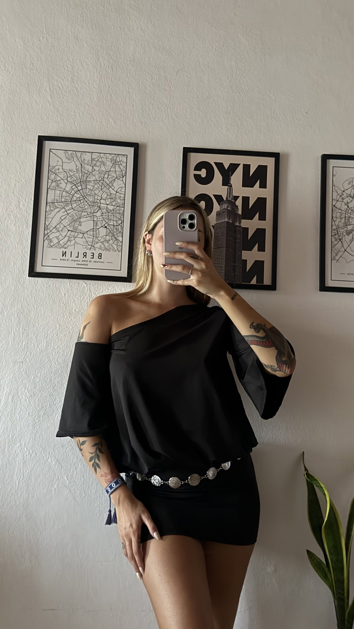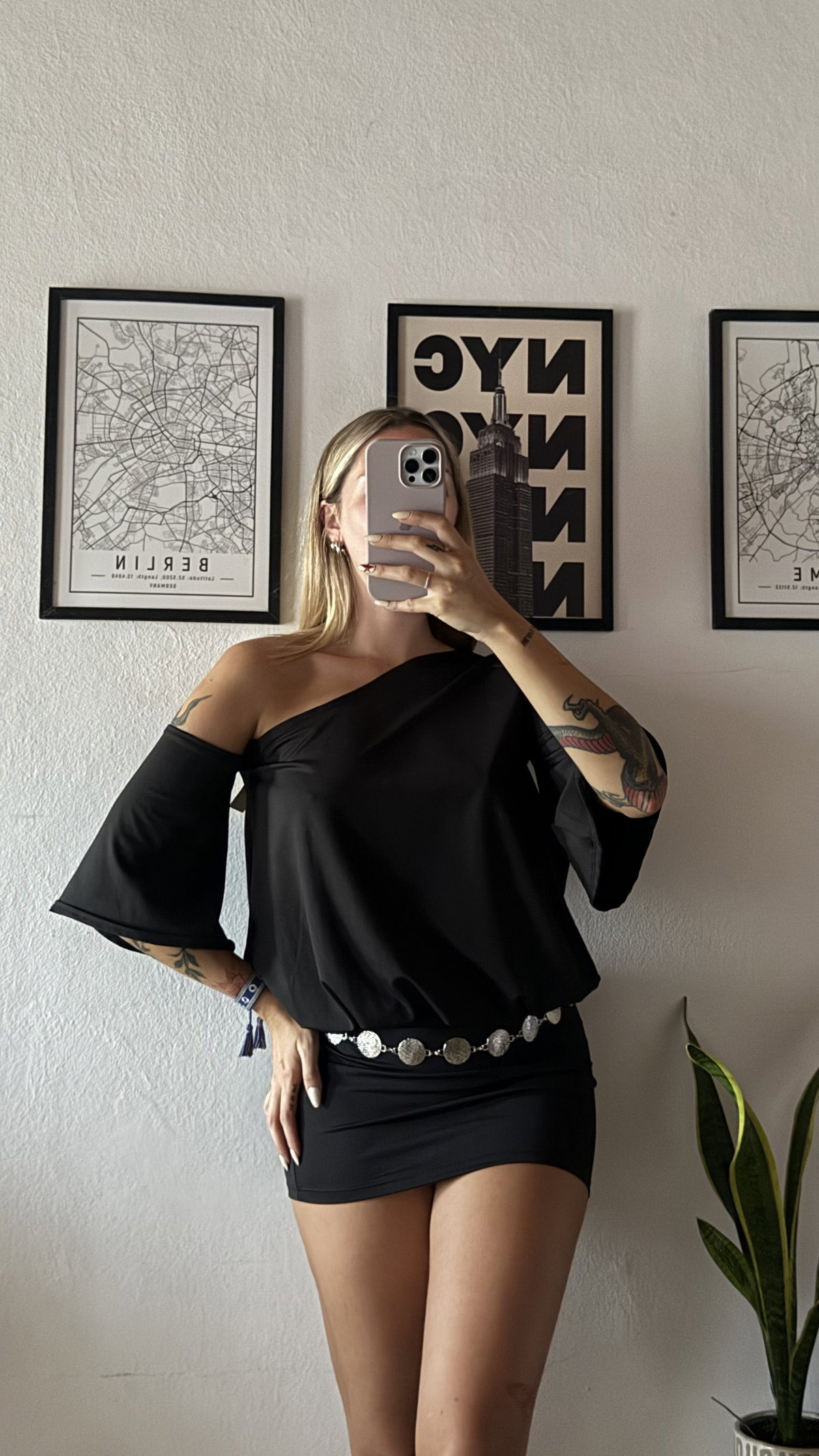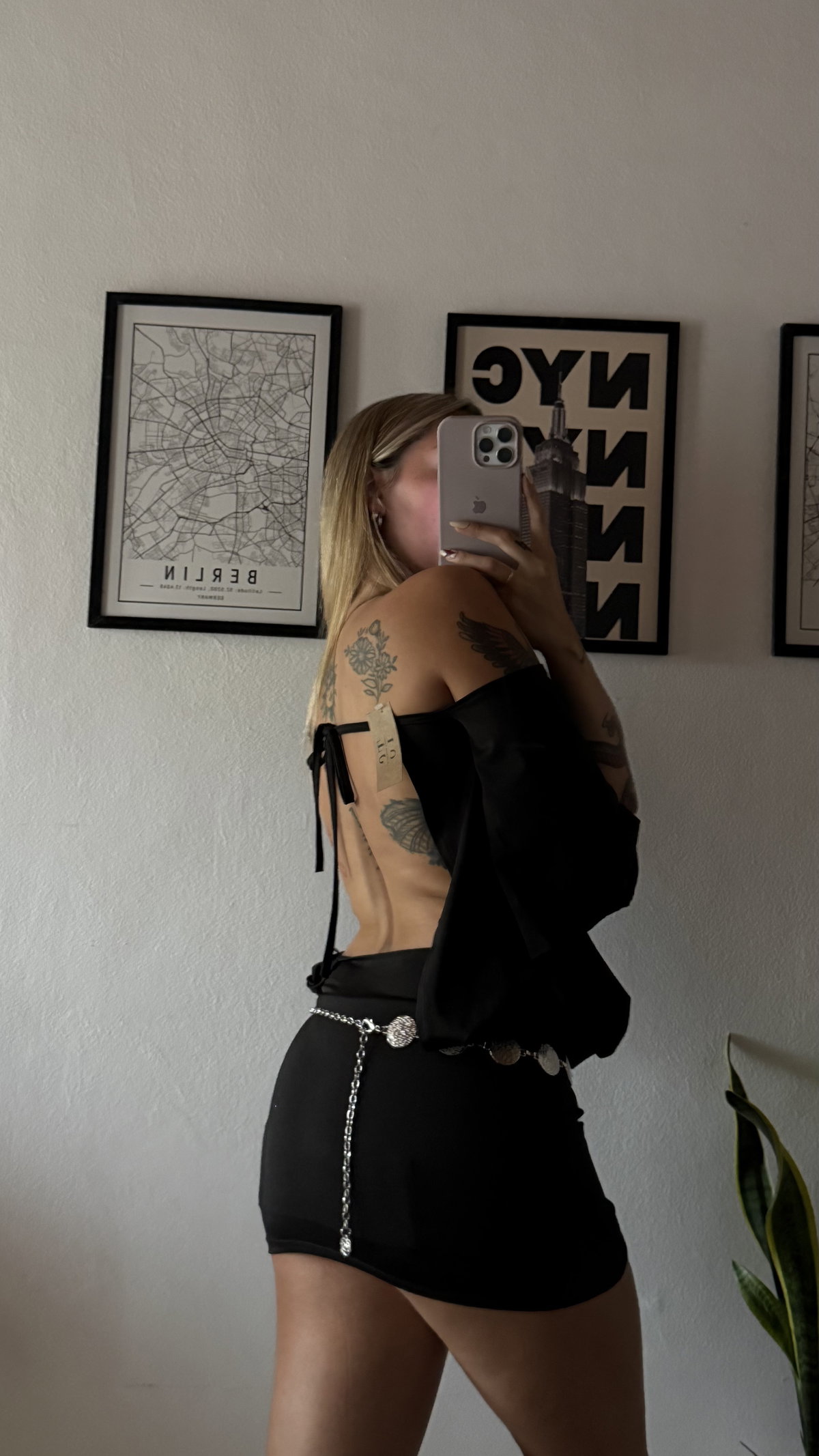 vestido corto de microfibra, elastizado. con escote irregular y espalda descubierta para atar. talle unico, aprox S/M