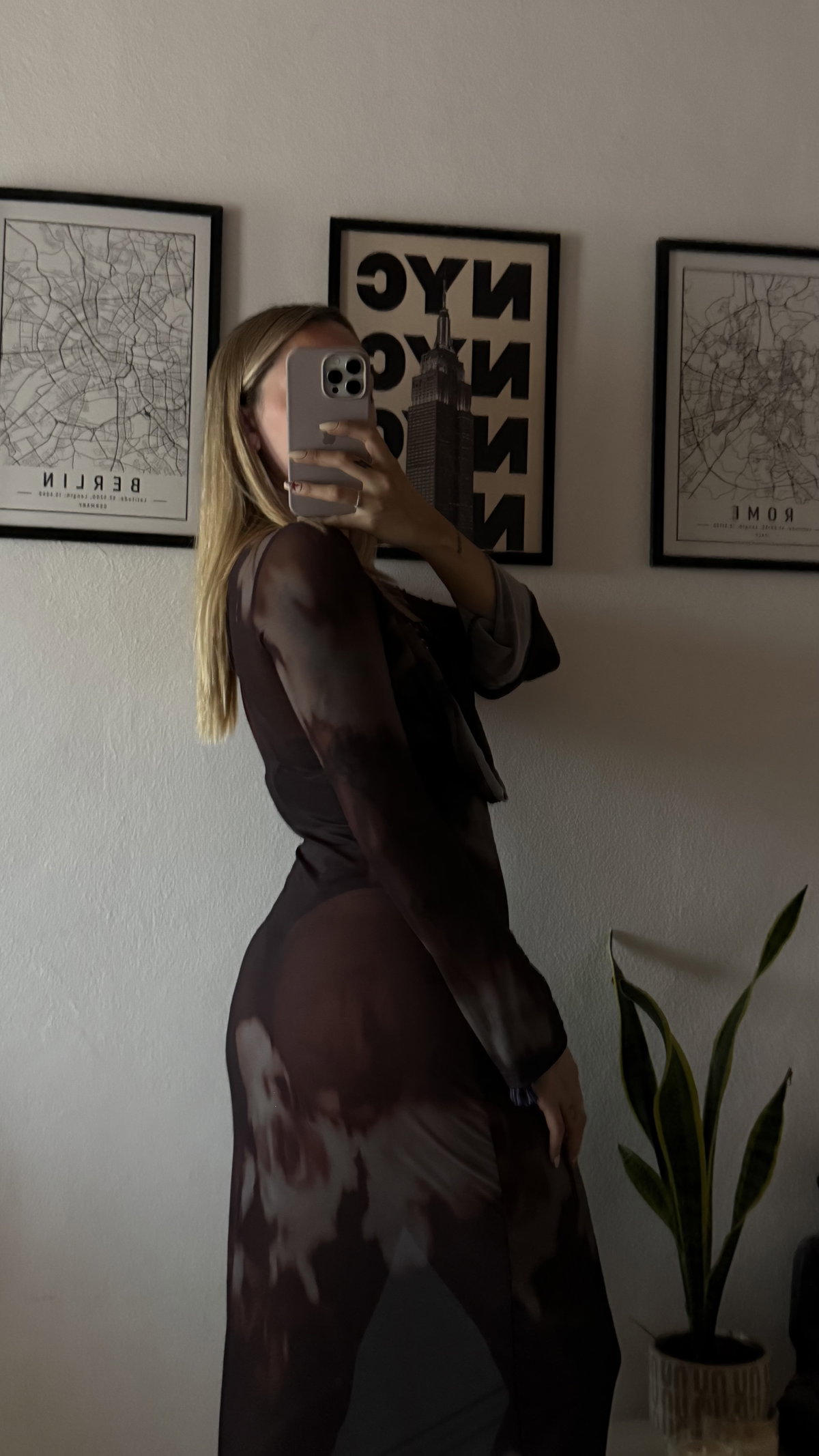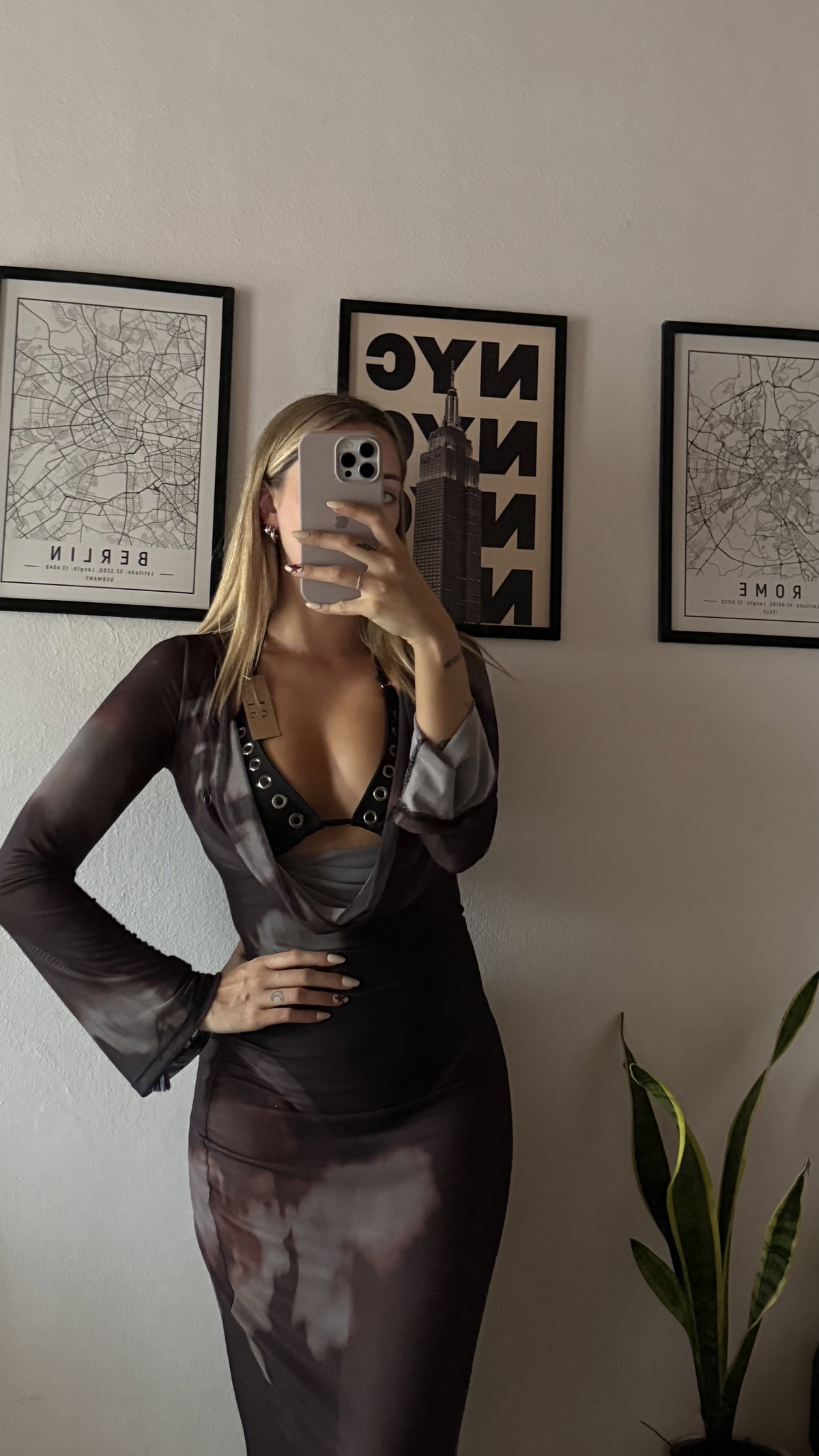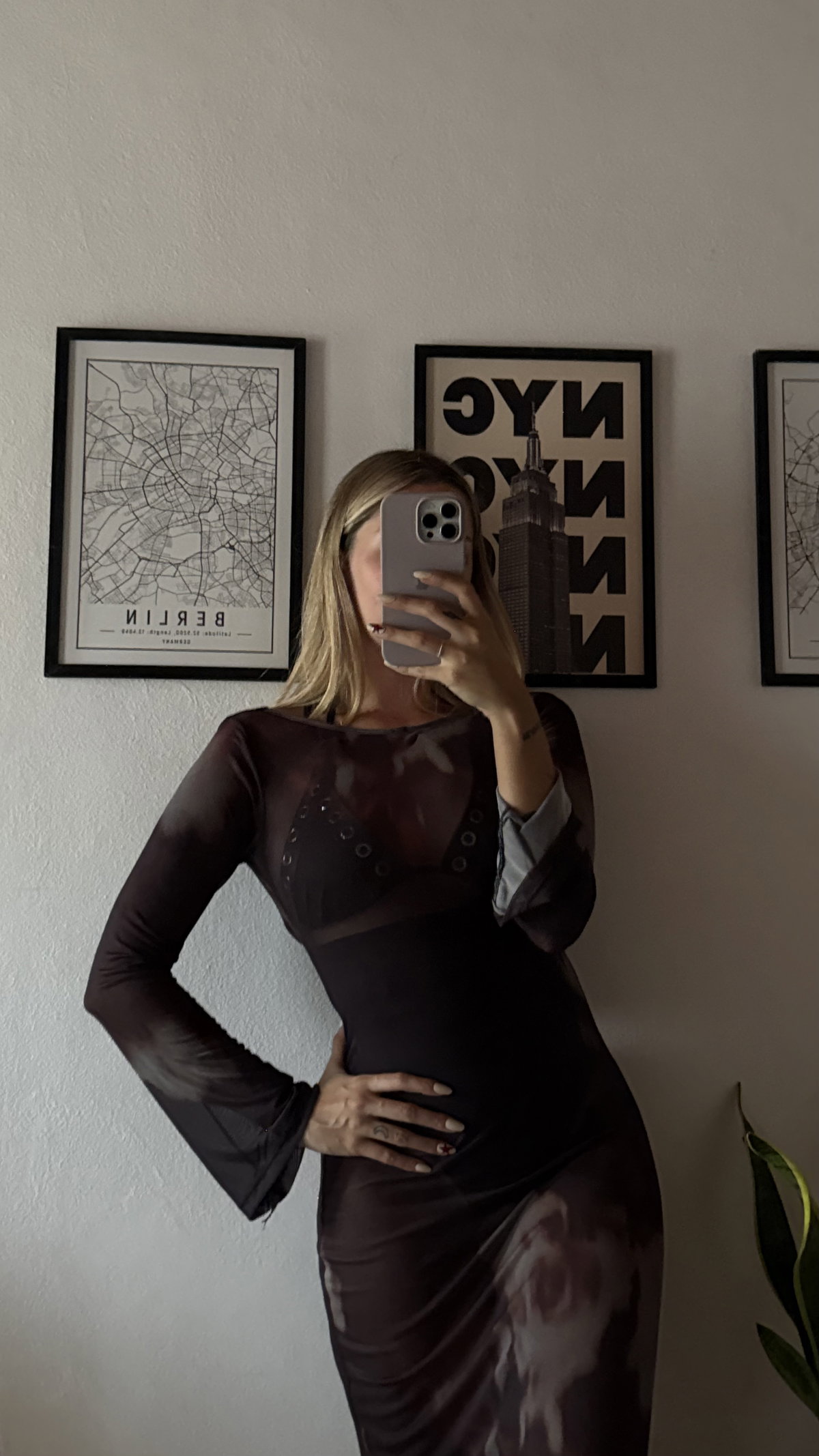 vestido largo de microtul con escote buche, se puede usar de dos formas. talle unico elastizado, va para S/M aprox.