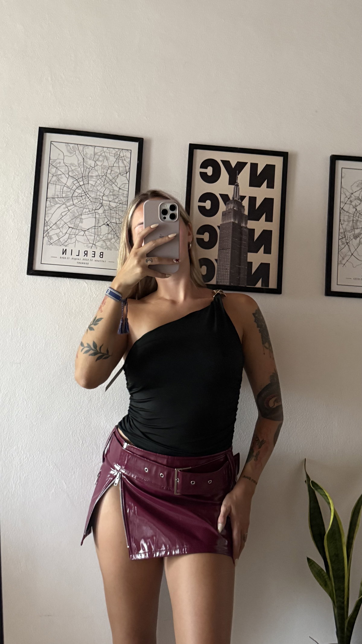 Top de microfibra a un hombro, con frunces laterales y hebilla de metal dorado (removible). talle unico, aprox S/M.
