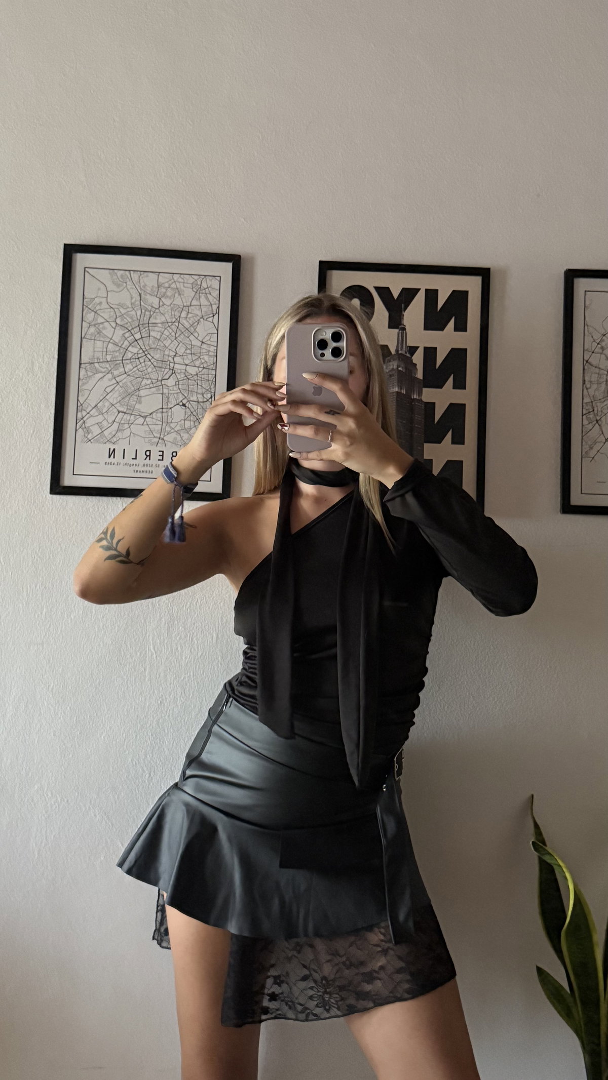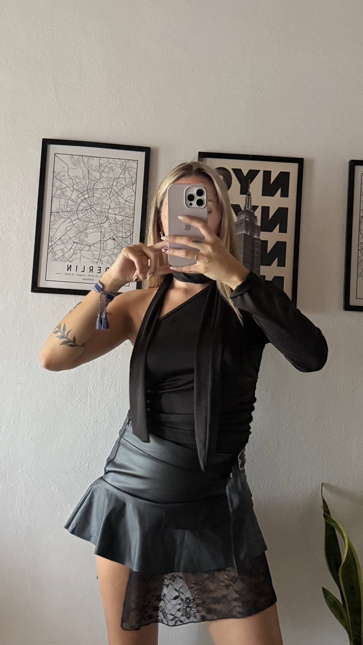 mini de cuerina combinada con encaje, elastizada, tiene un cierre trasero. tiro medio