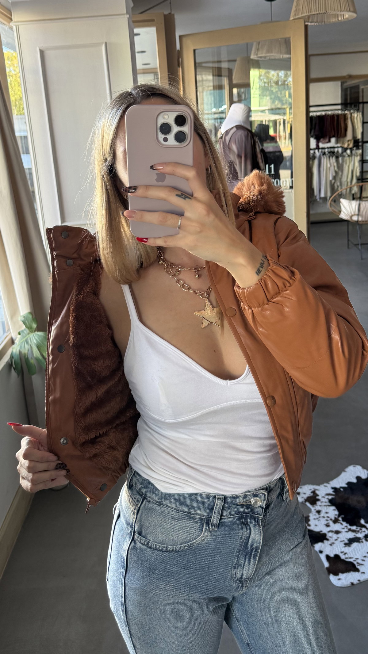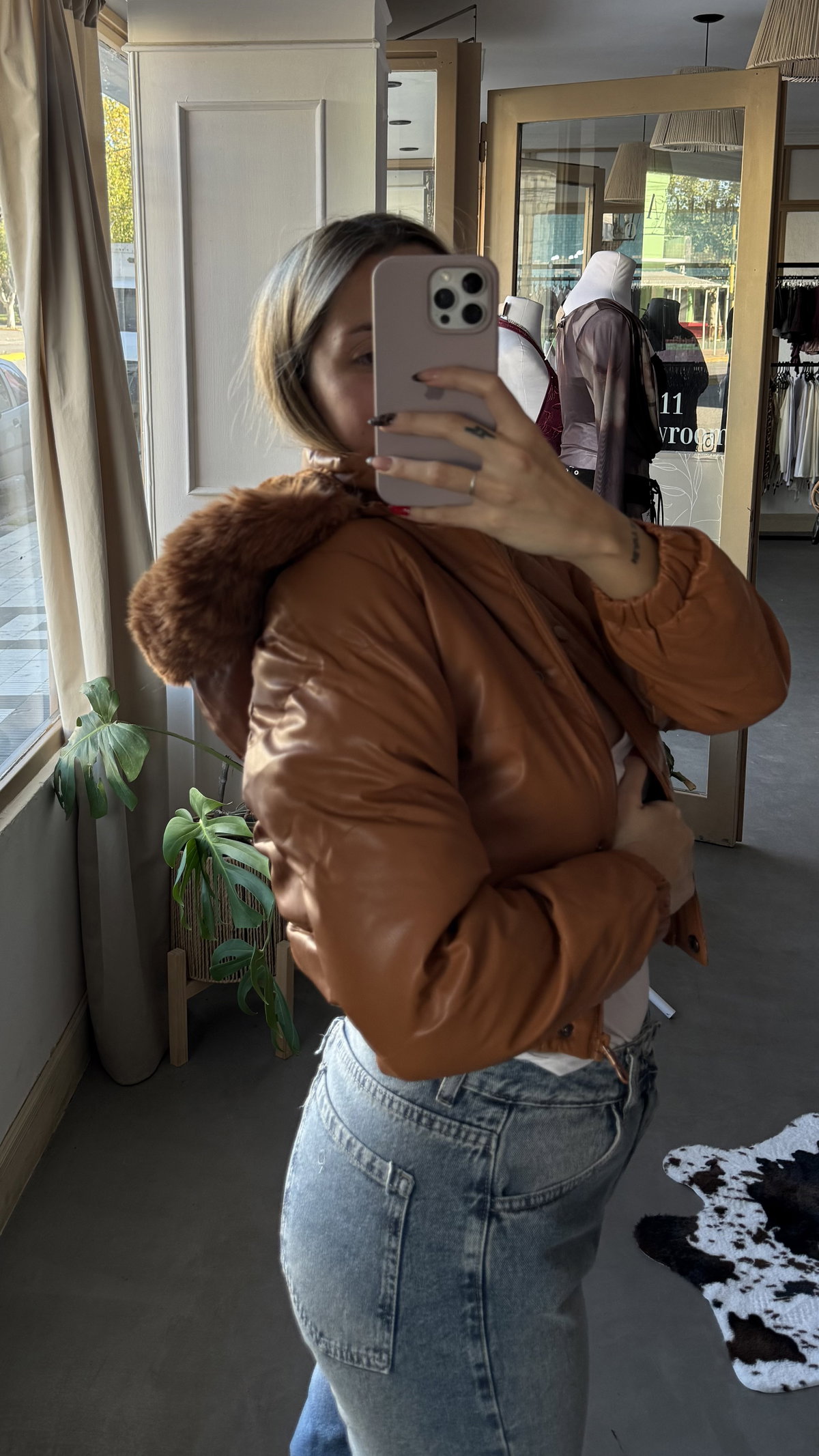 campera de ecocuero importada. forrada con peluche. la capucha es removible (trae cierre). modelo mas bien corto, arriba de la cadera. los talles tiran a chicos.