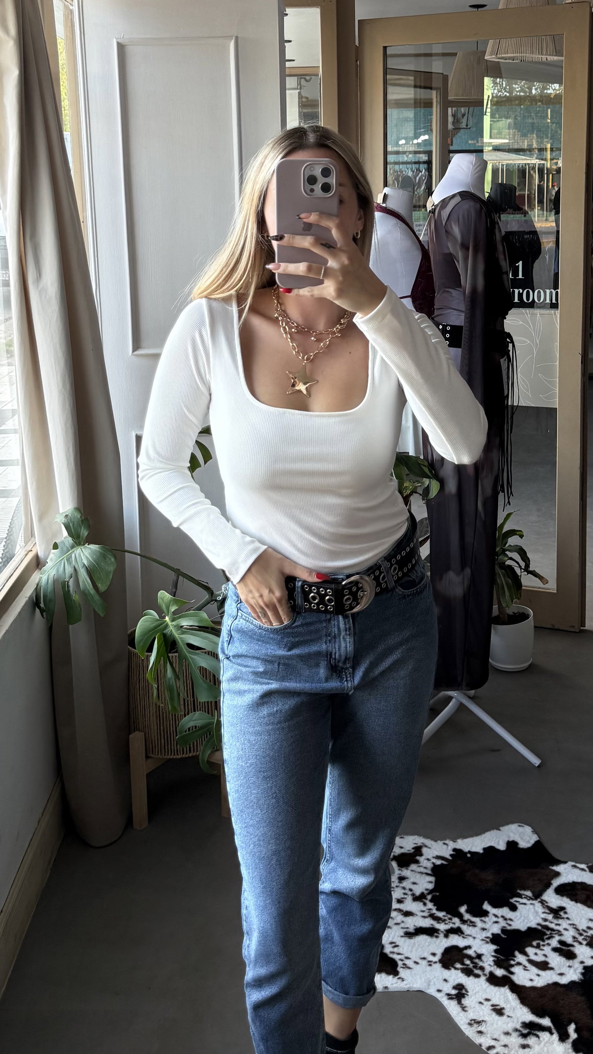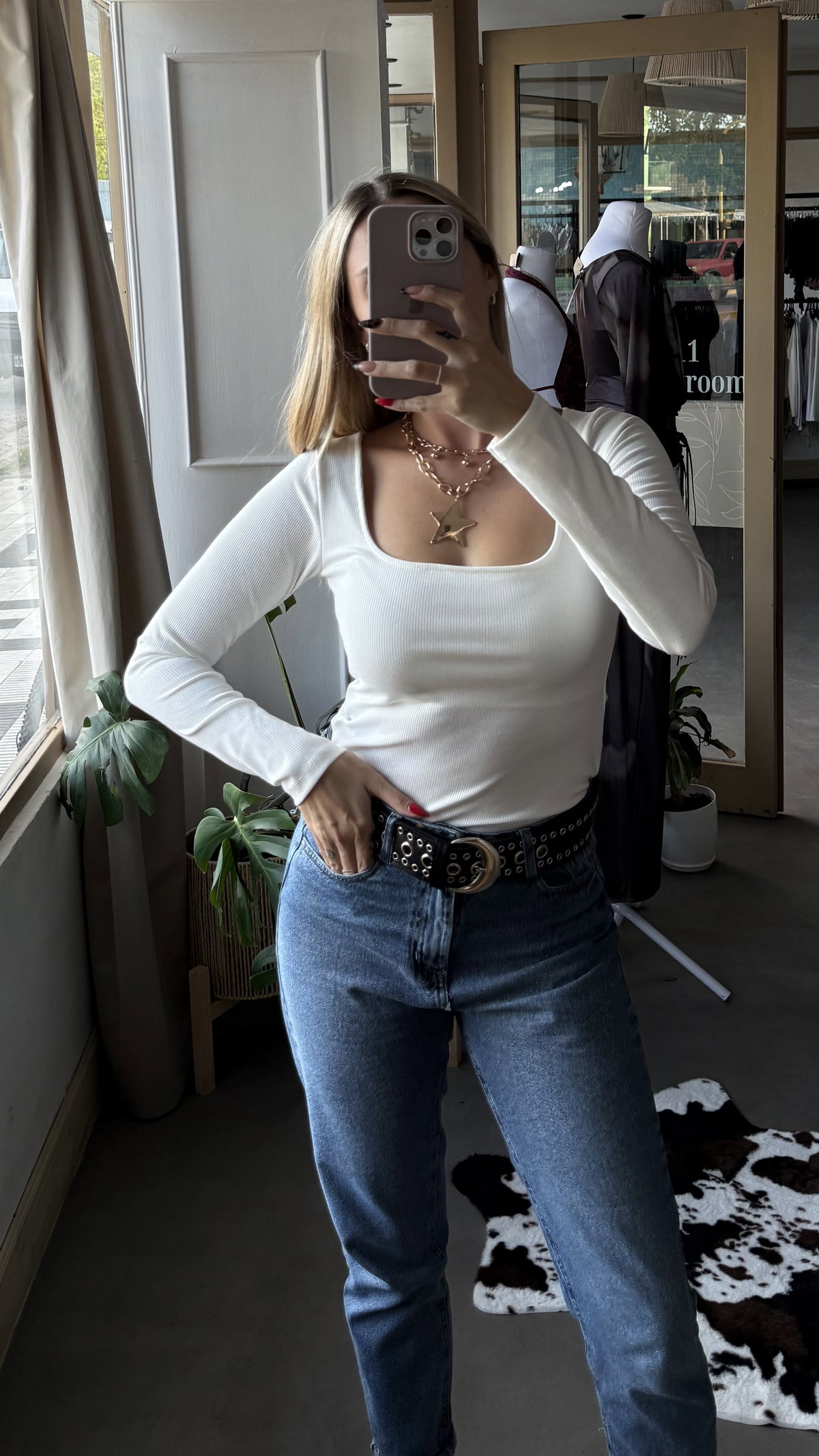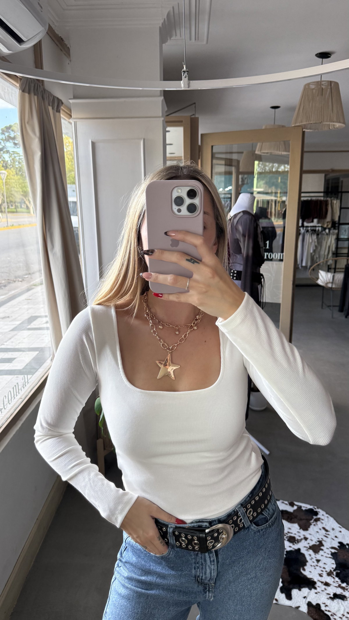 Body de morley con escote cuadrado, manga larga. es elastizado, trae abrojo abajo. talle unico aprox S/M.