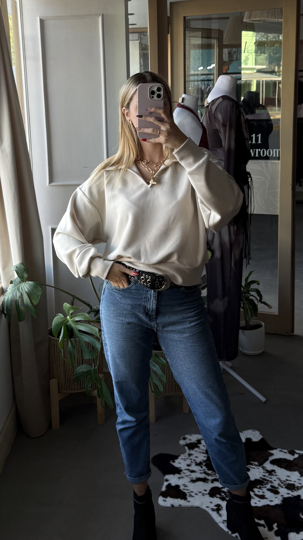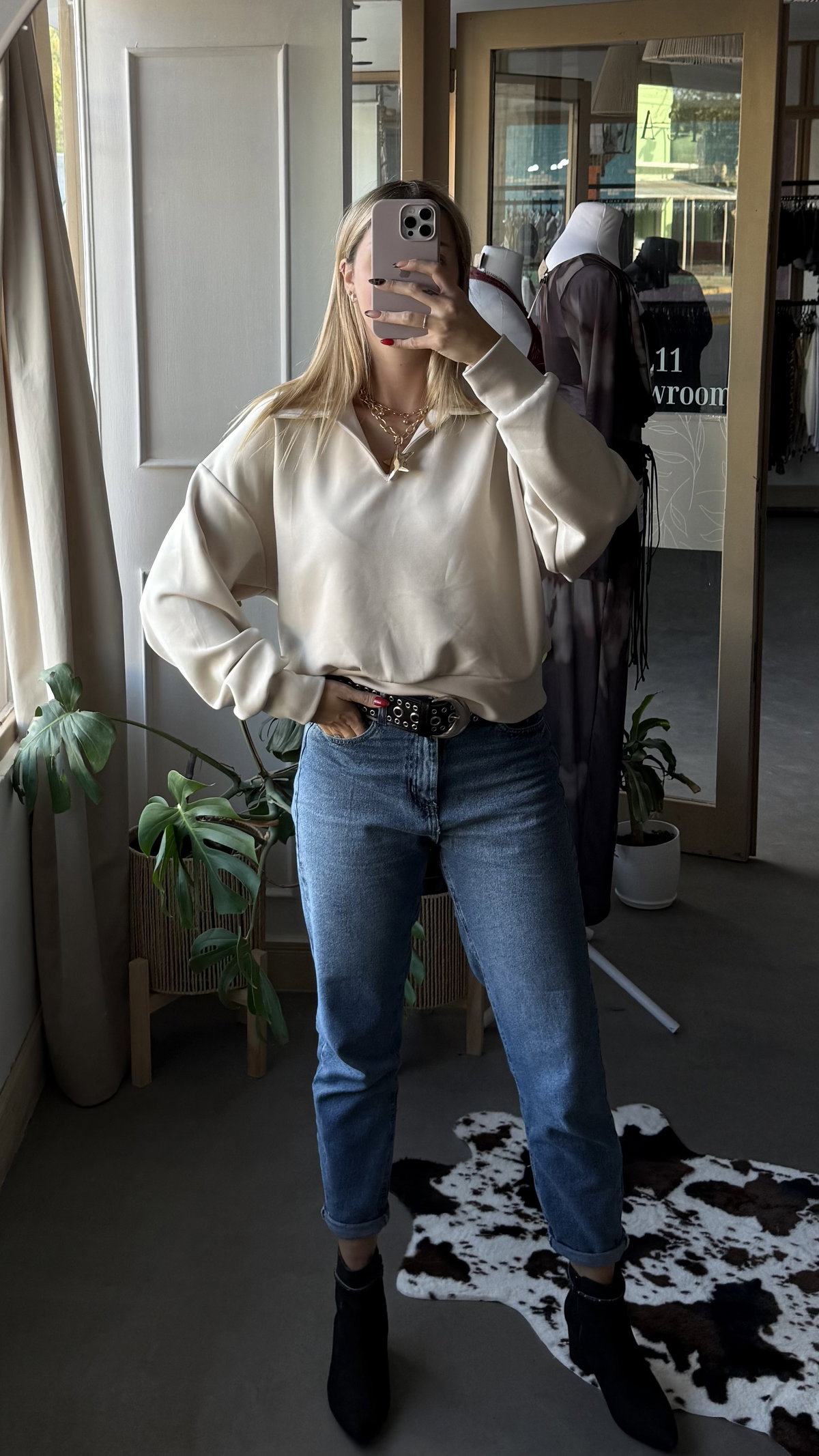 Buzo tipo deportivo (es calentito) con cuello tipo chomba. largo a la cadera, talle unico va hasta un L.