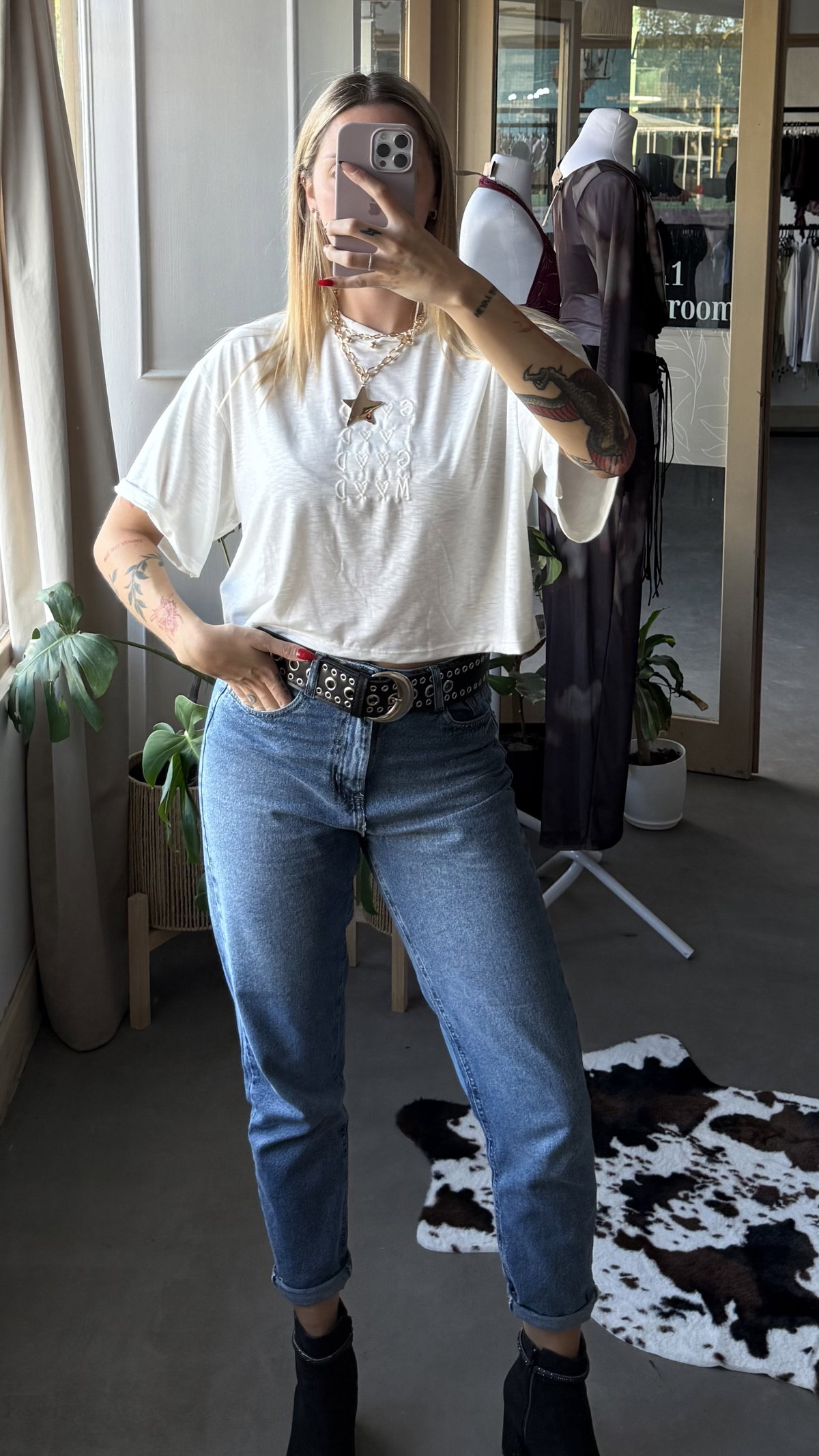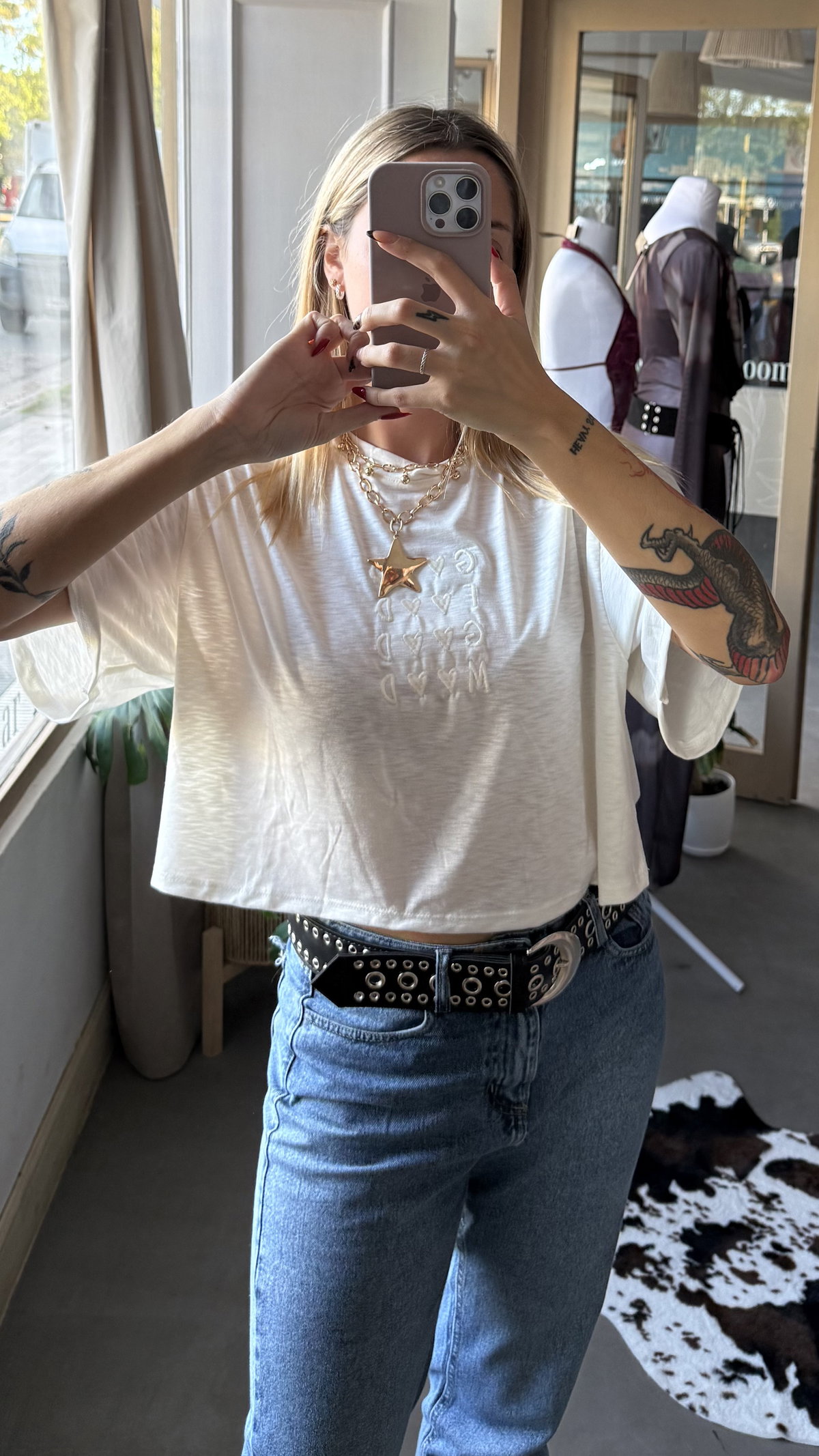 Remera con bordado en el frente, de jersey fino. elastizada, larga a la cintura. talle unico amplio, aprox L.