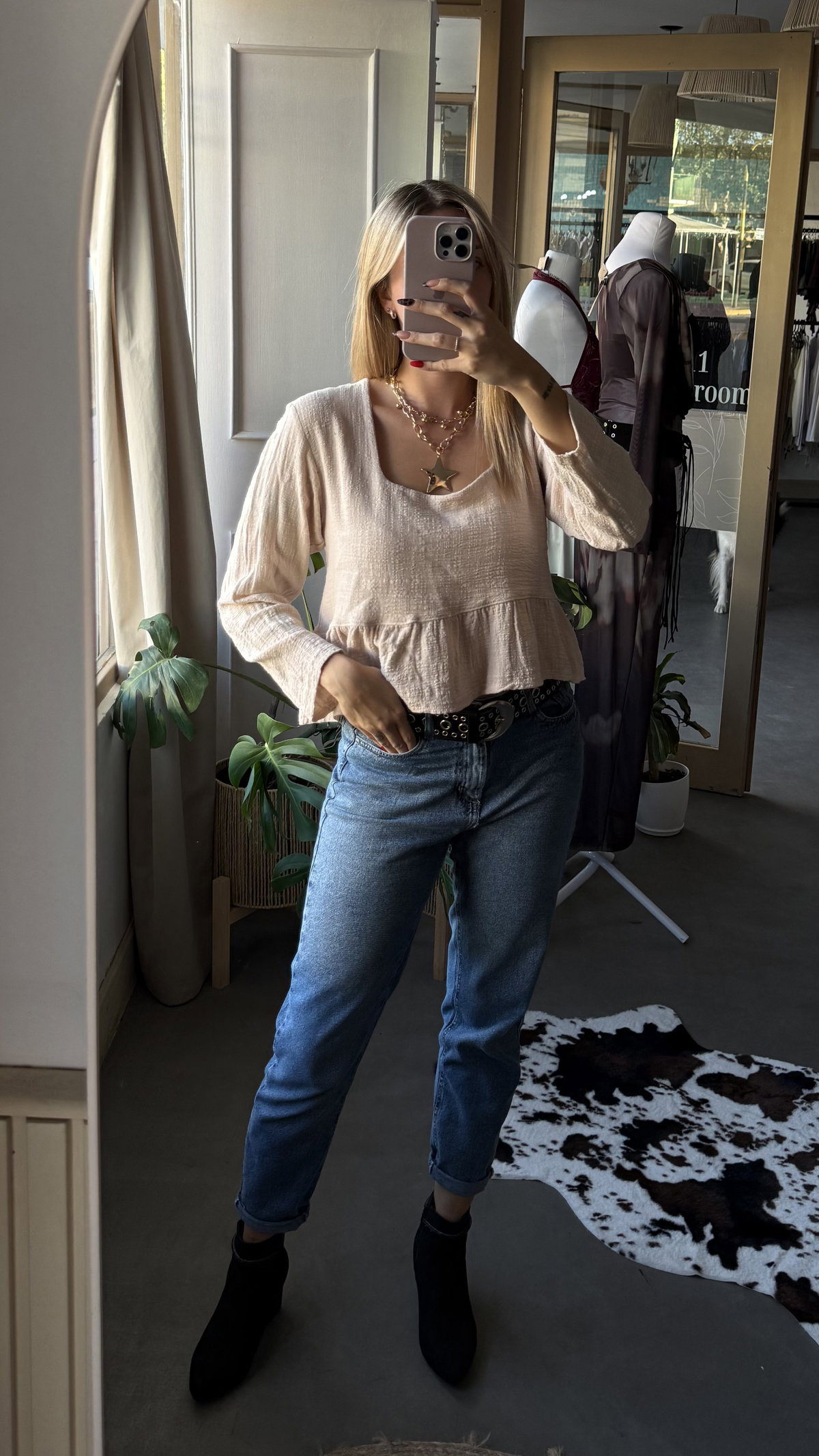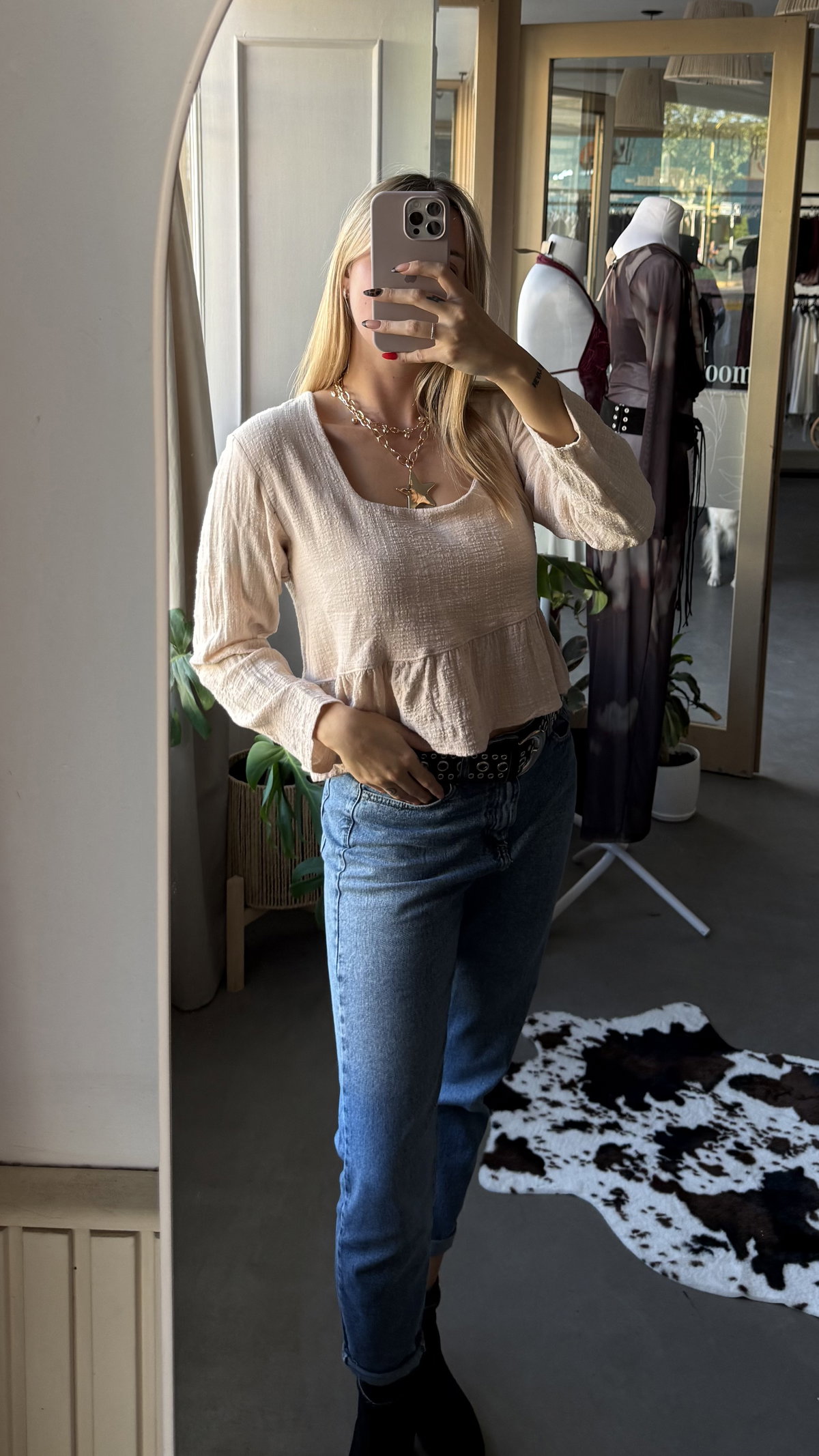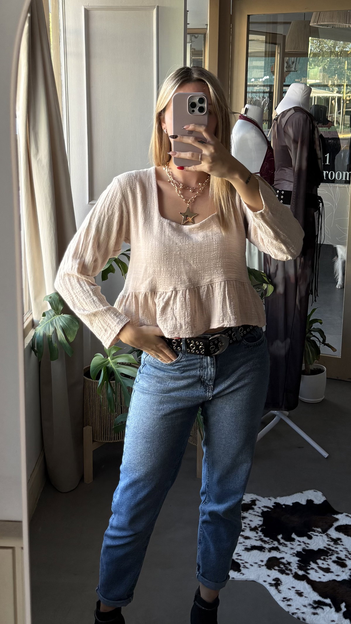 blusa de gasa de algodon con escote forrado. tela liviana con caida, larga arriba de la cadera aprox.