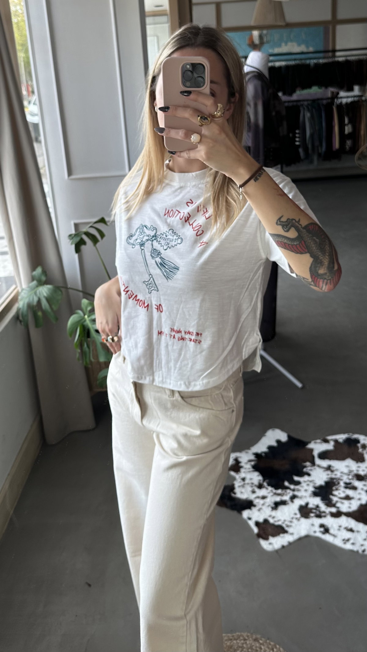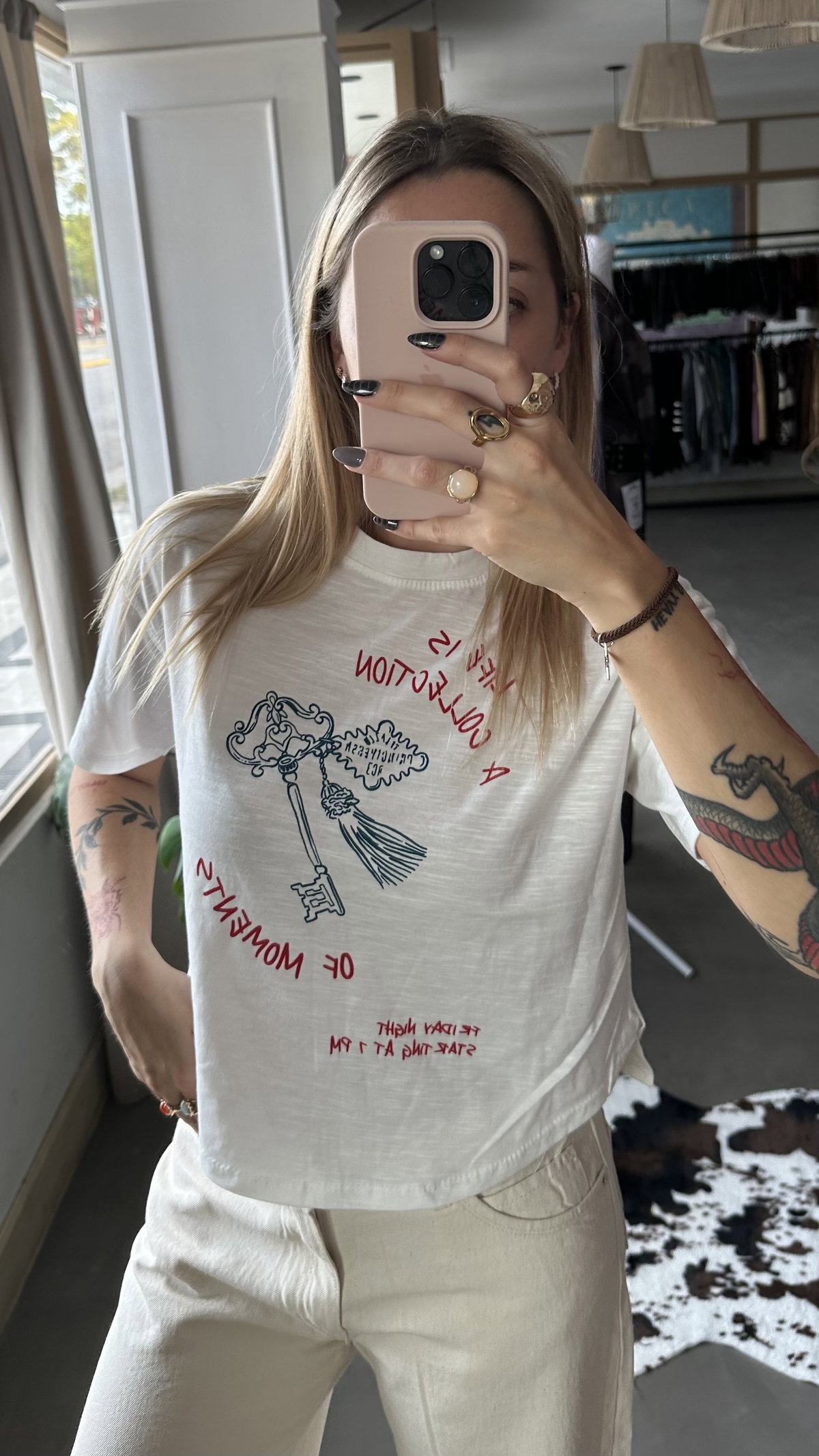 Remera manga corta, de jersey con estampa. elastizada, larga arriba de la cadera.