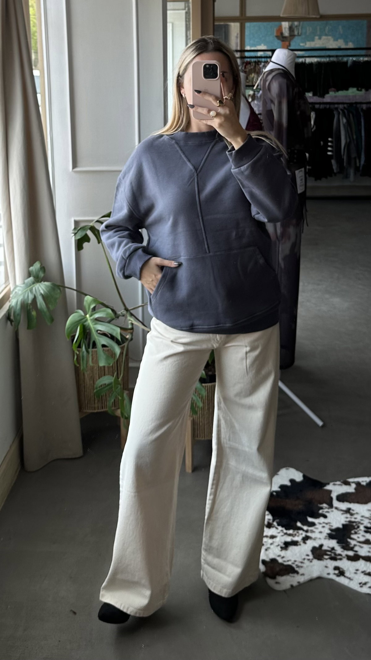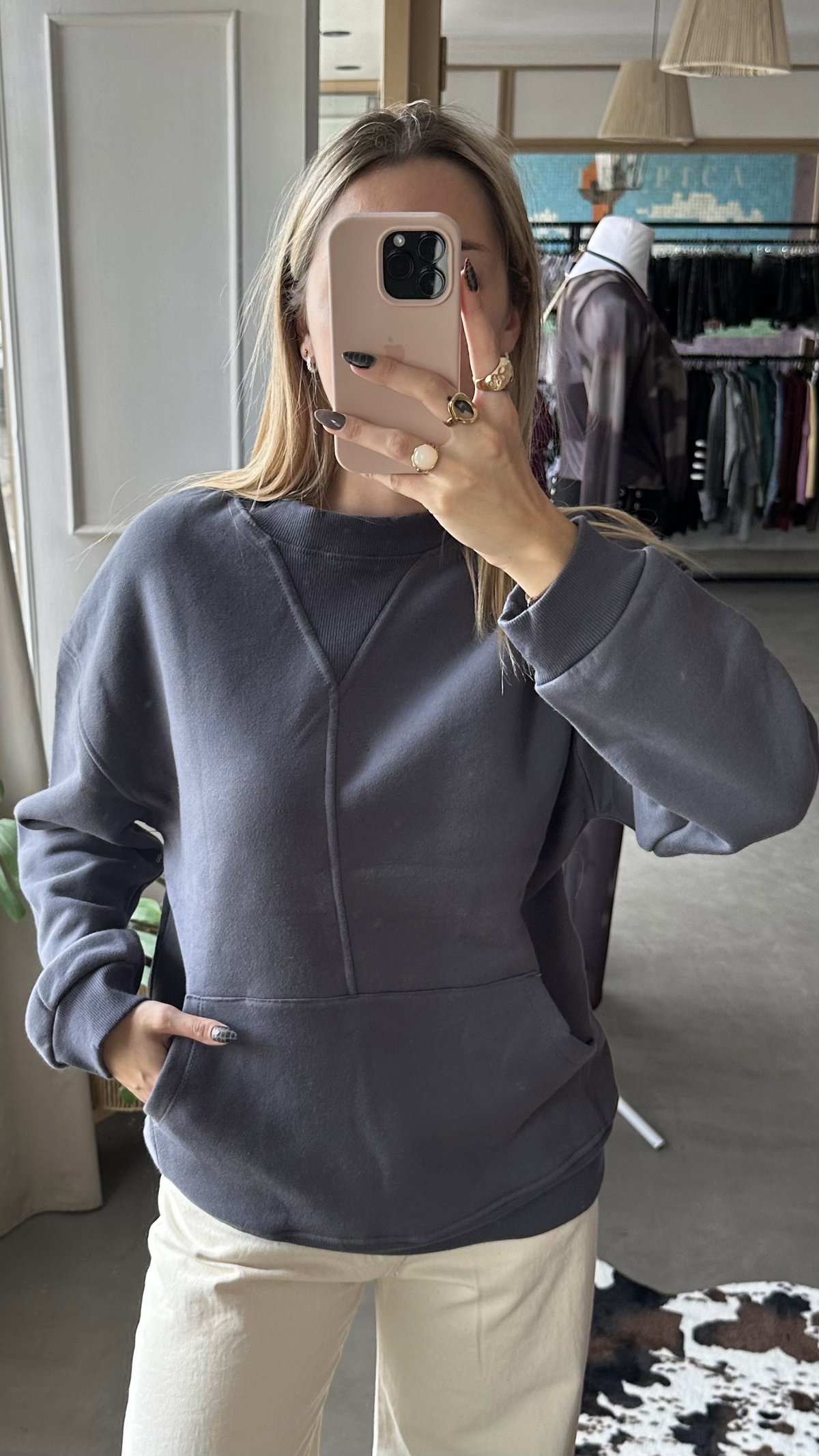 Buzo canguro, de algodon frizado. largo a la cadera, es elastizado.