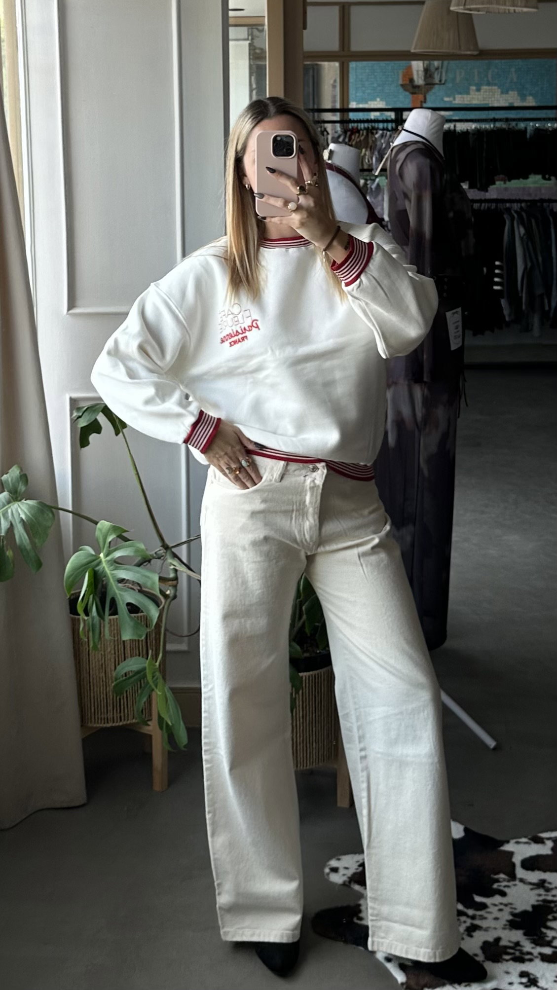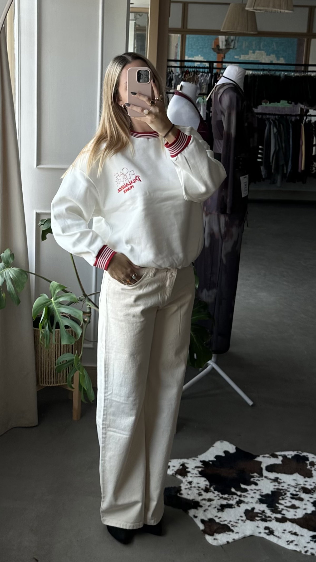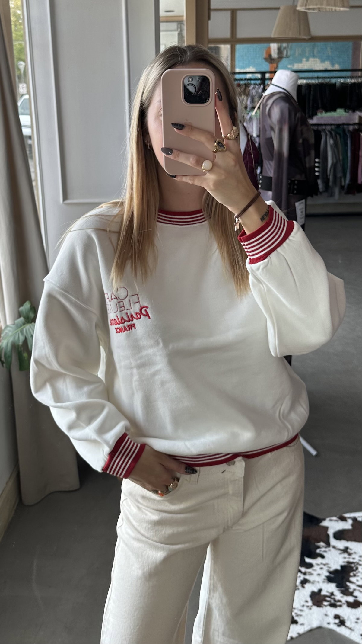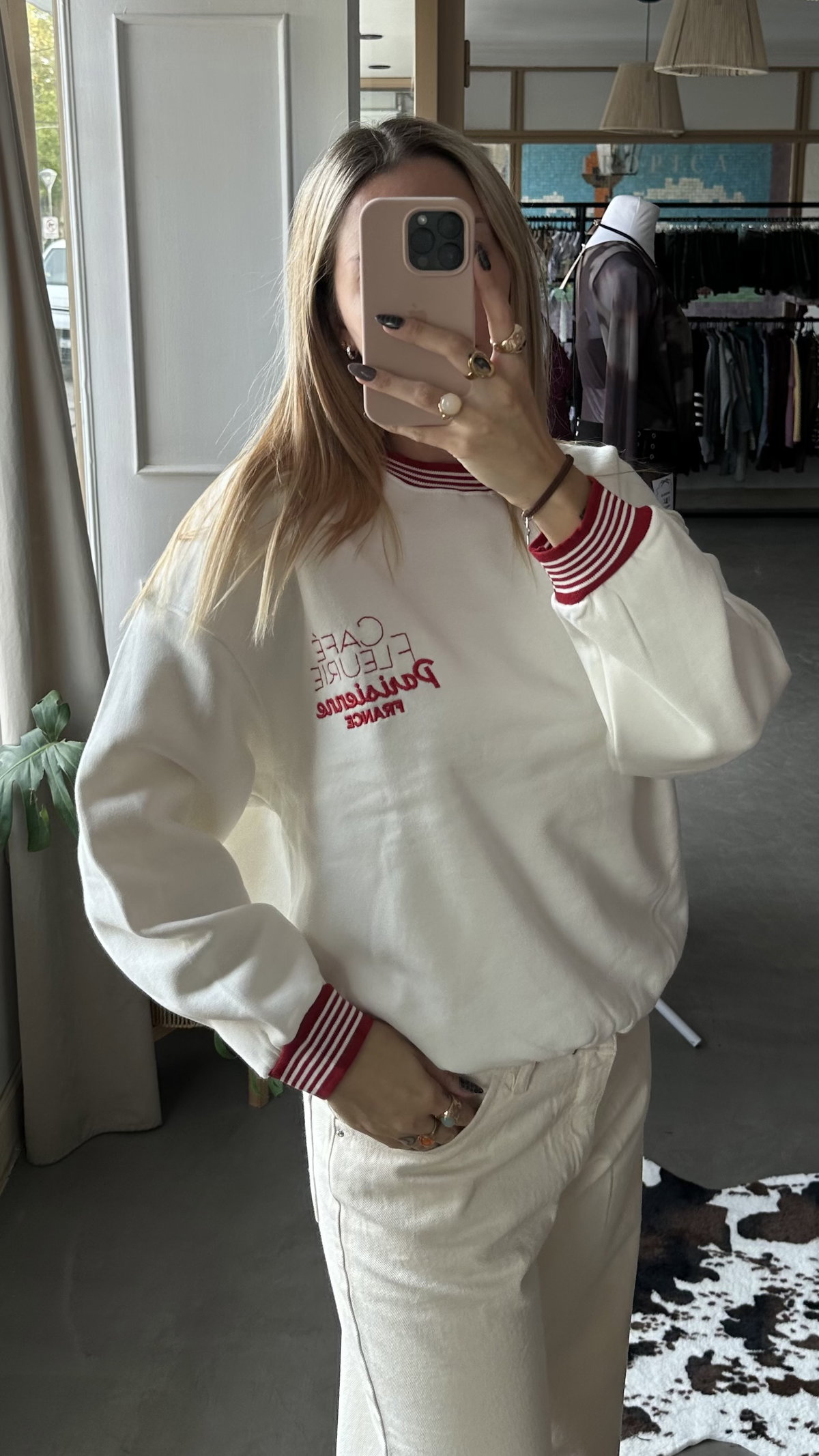 Buzo combinado con bordado en el frente, de algodon frizado. largo arriba de la cadera, es elastizado.