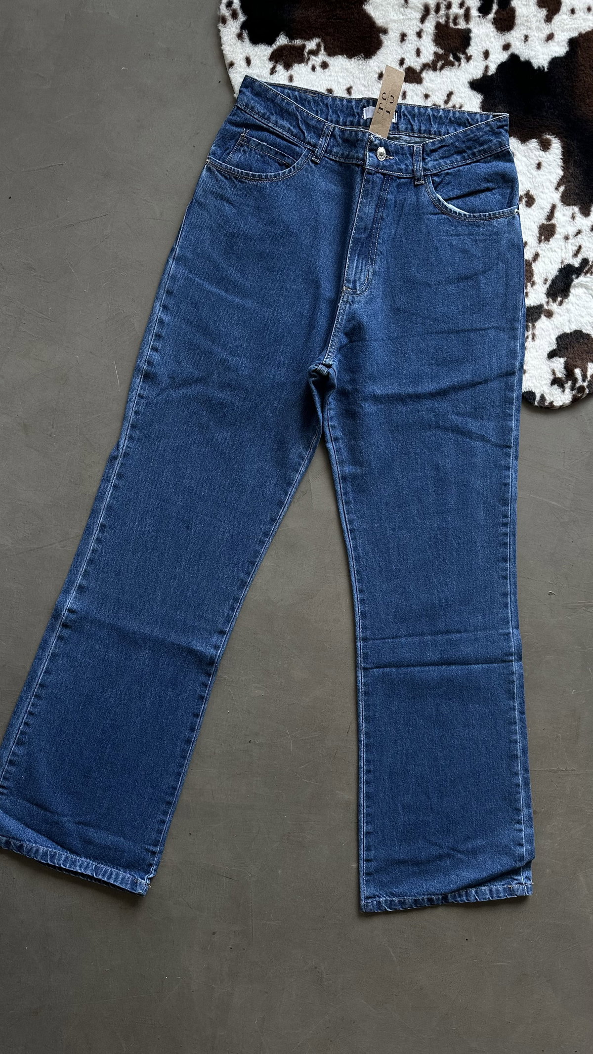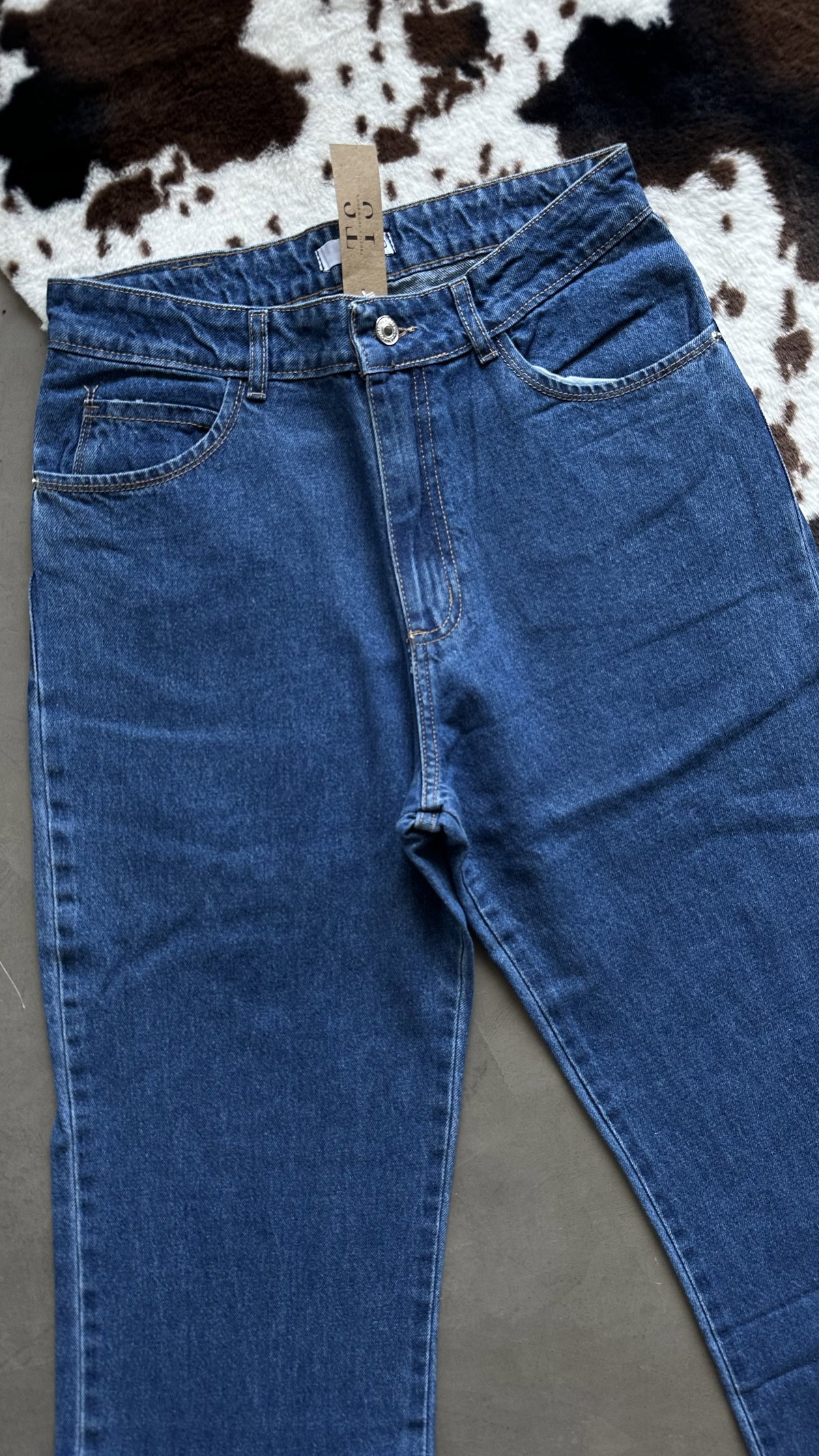 Mom recto azul oscuro, tiro alto. corte clasico, es rigido.