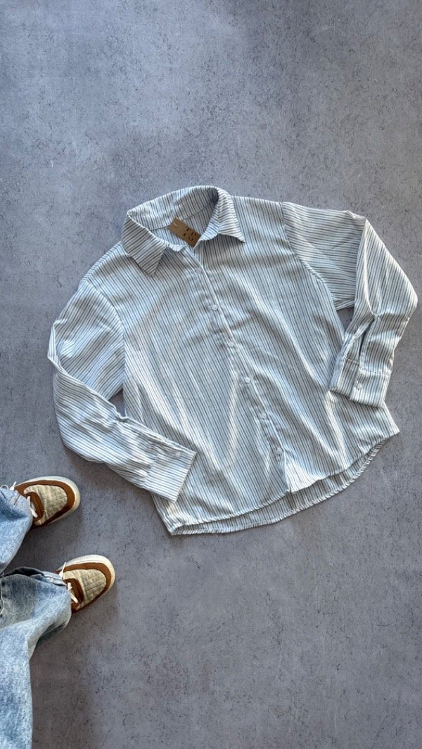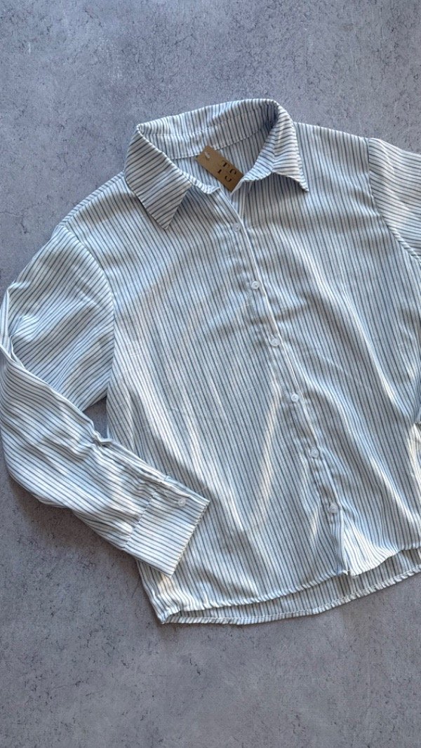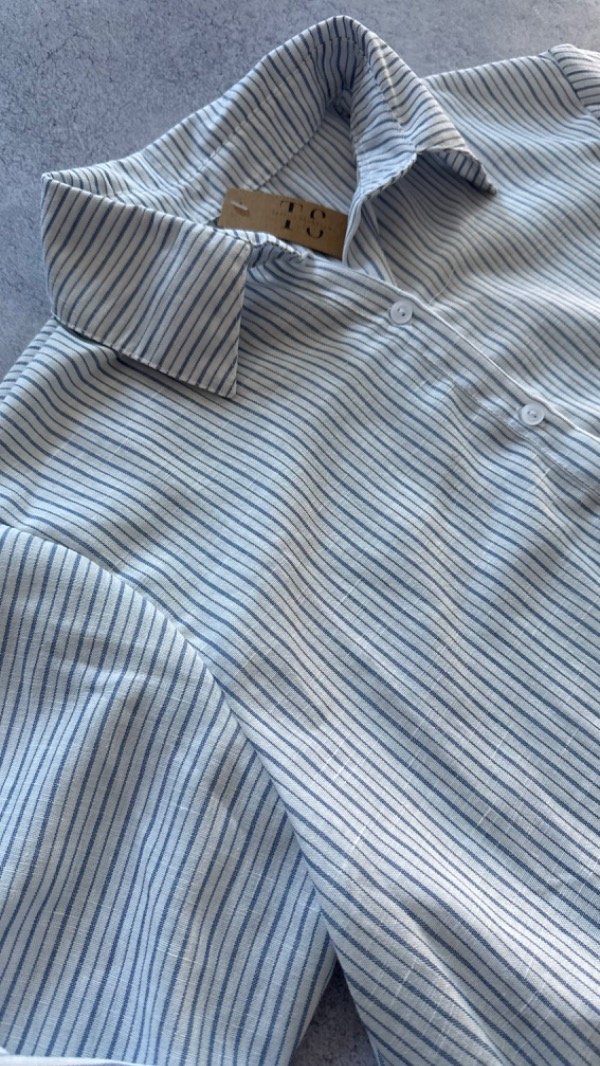 Camisa de lino rayada, liviana con caida. larga debajo de la cadera, manga larga