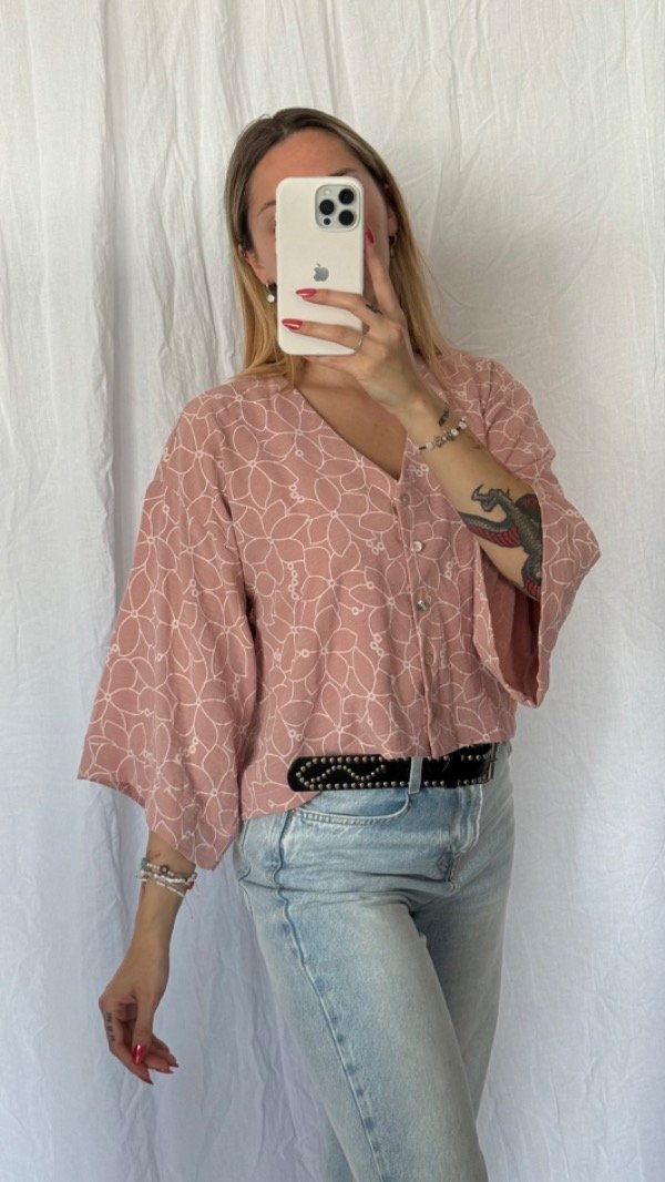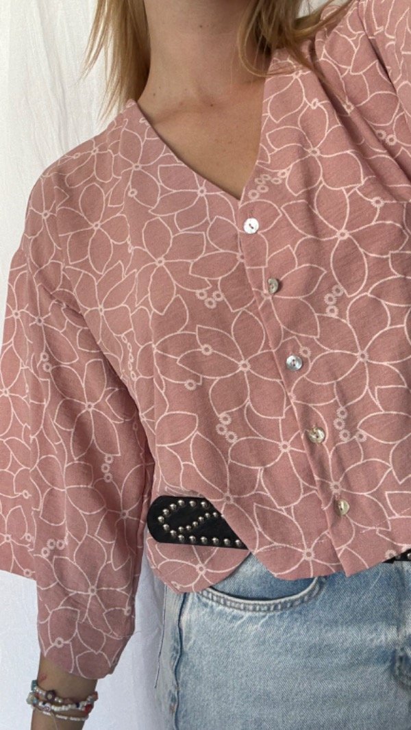 camisa de lino bordada, escote en V. la tela es rigida con caida. manga 3/4