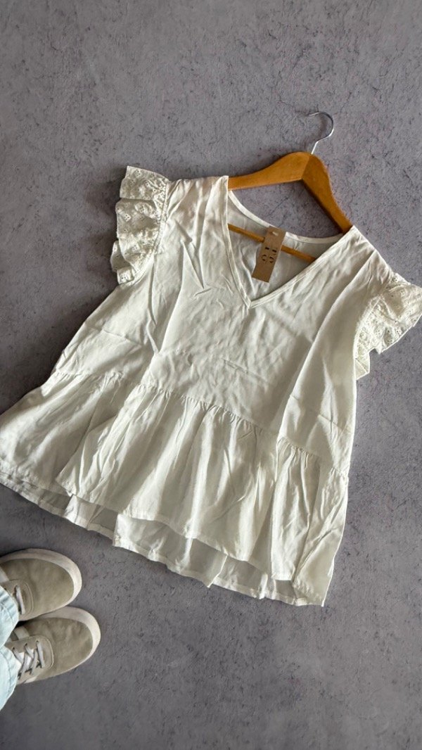 blusa de poplin combinada con brodery, escote en V, la tela es rigida con caida. modelo sueltito, largo a la cadera.