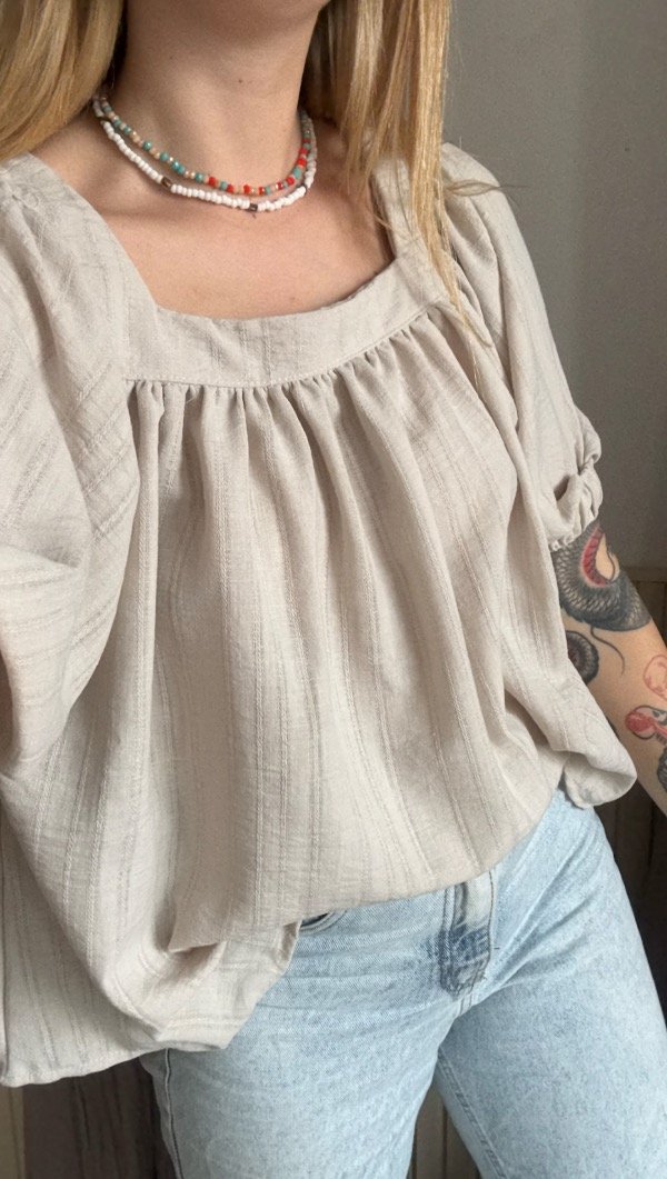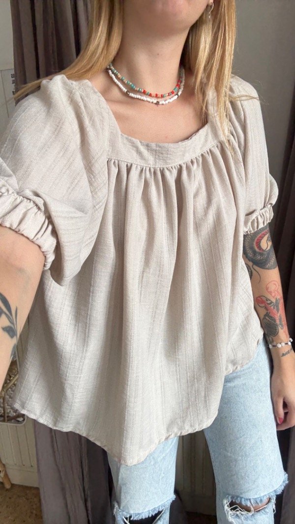 blusa de lino, escote cuadrado, la tela es rigida con caida. modelo sueltito, largo a la cadera. manga 3/4