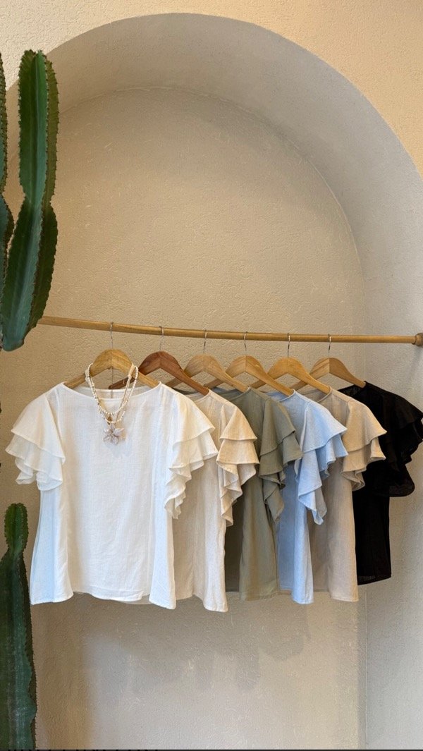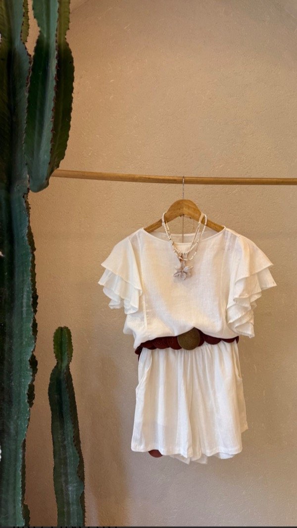 blusa de lino con volados, la tela es liviana con caida. modelo sueltito, largo a la cadera. talle unico aprox M