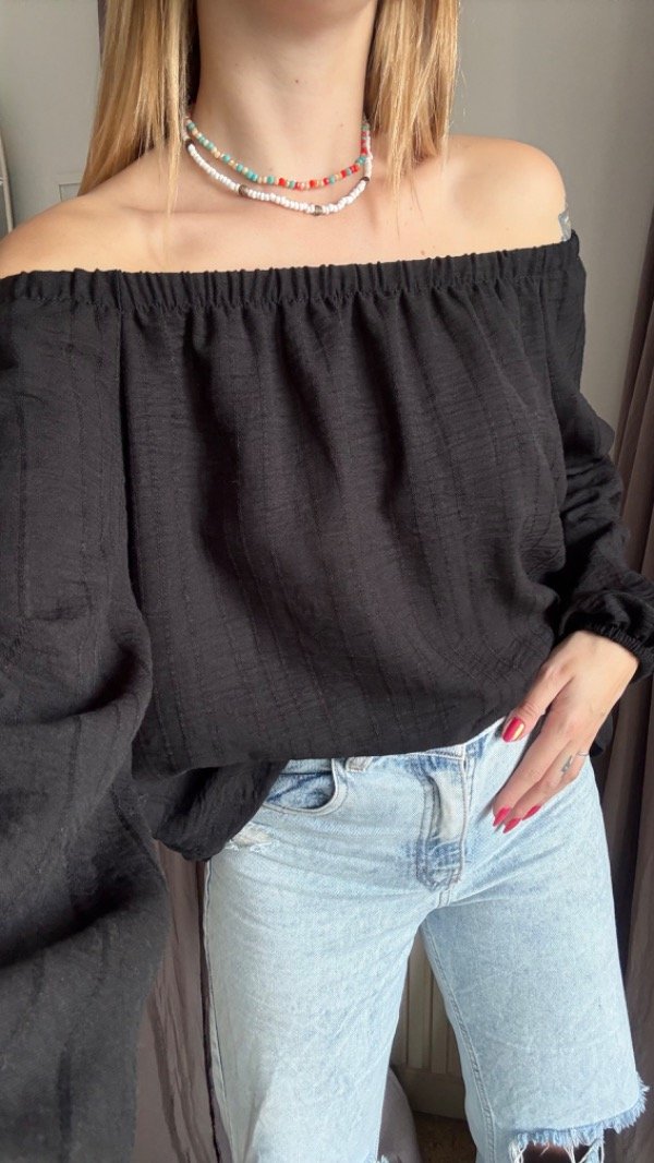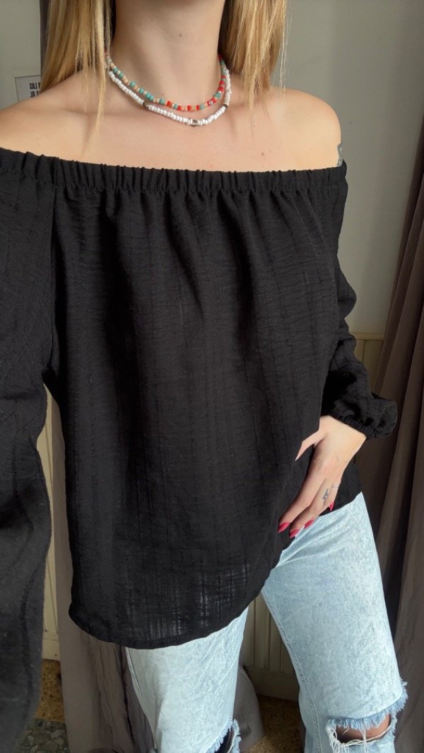 blusa de lino, escote paisana elastizado. la tela es rigida con caida. modelo sueltito, largo a la cadera. manga larga. los talles son amplios